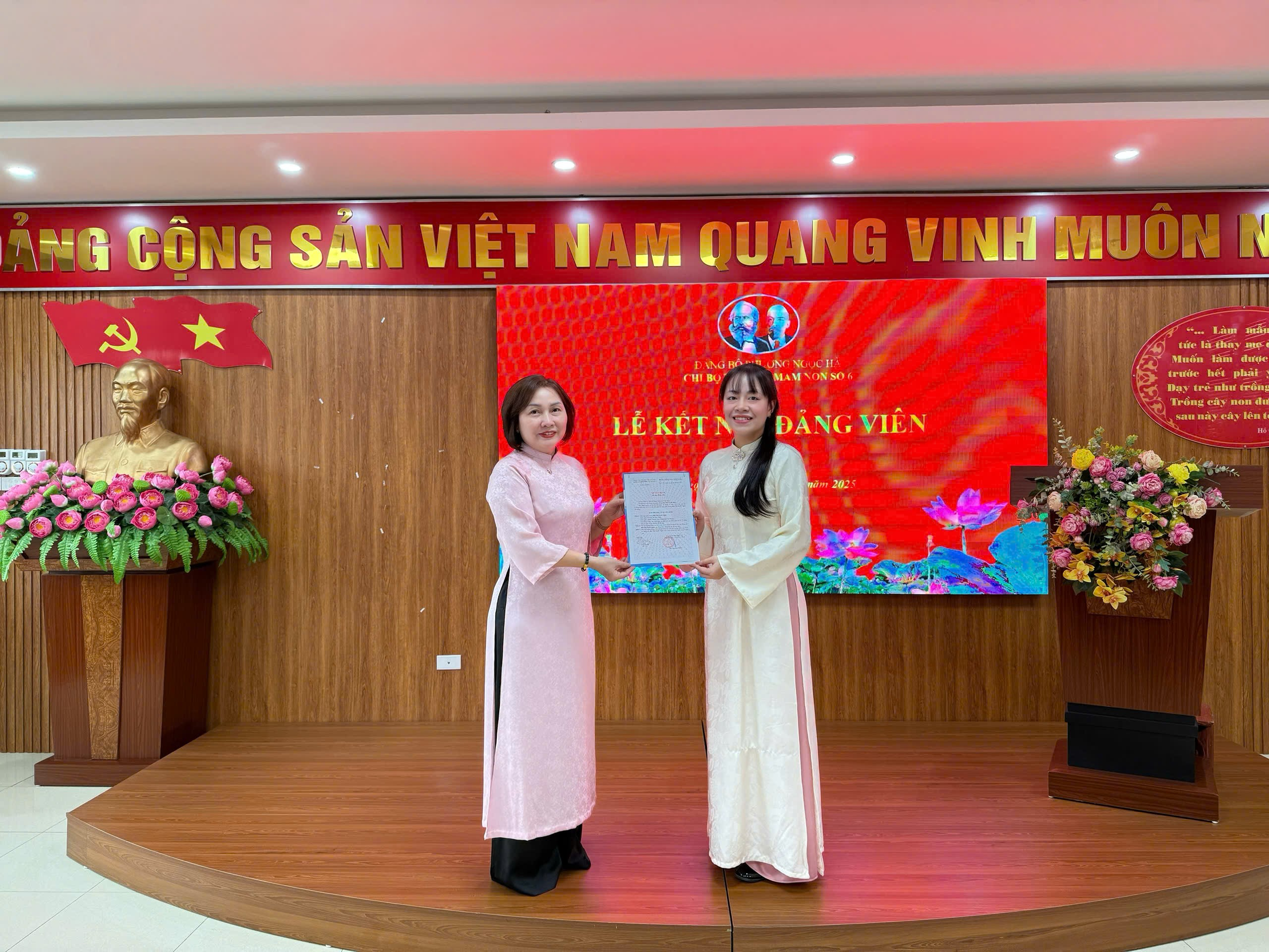 Buổi lễ được tổ chức trang trọng với sự có mặt đầy đủ của tất cả các đồng chí trong Ban giám hiệu và toàn thể Đảng viên trong Chi bộ Trường Mầm non Số 6. Sự có mặt đông đủ của các đồng chí đã tạo nên không khí trang nghiêm của buổi lễ, thể hiện sự quan tâm, trách nhiệm của Chi bộ đối với công tác xây dựng Đảng và bồi dưỡng năng lực, nhận thức cho đội ngũ quần chúng.