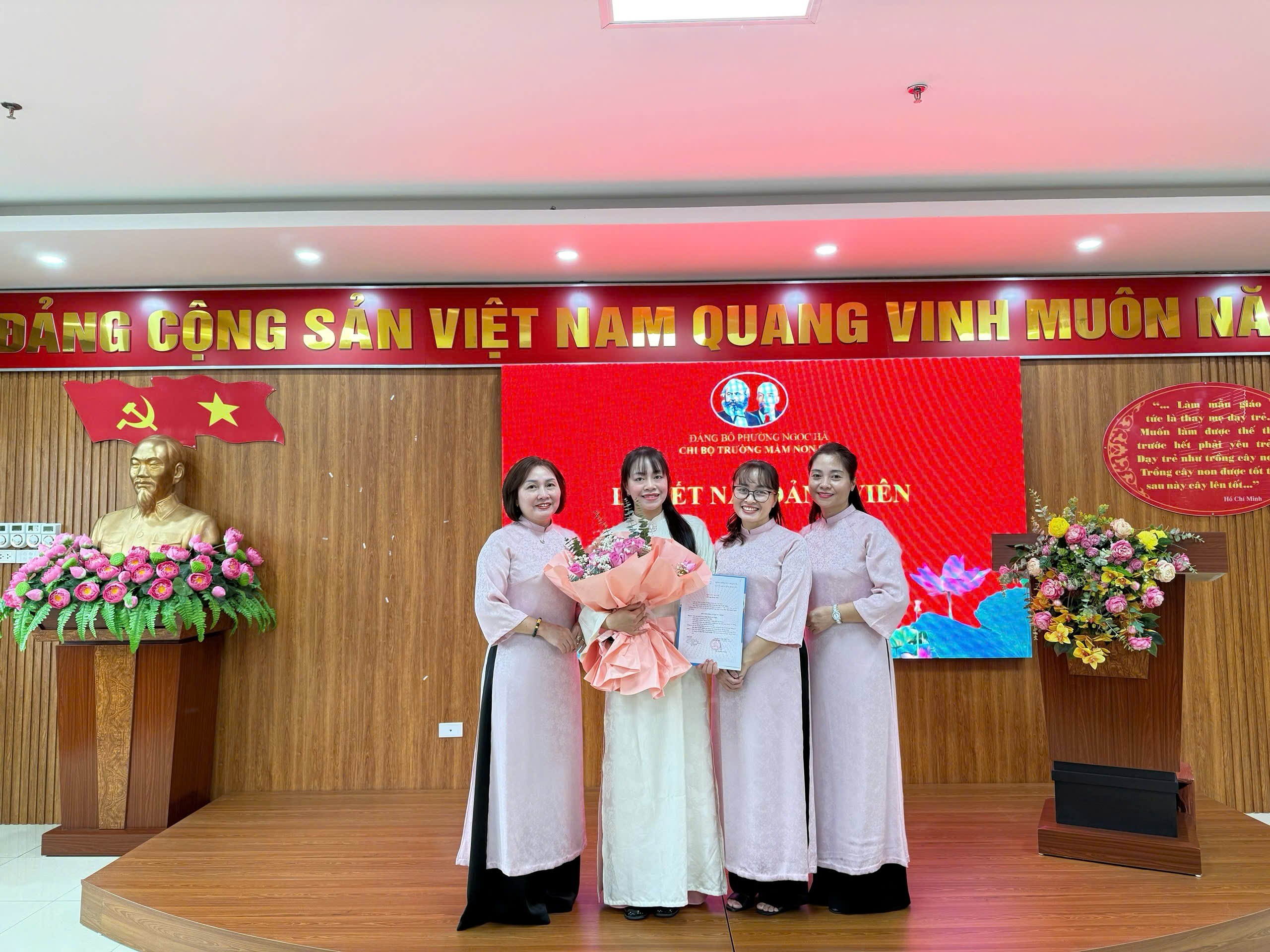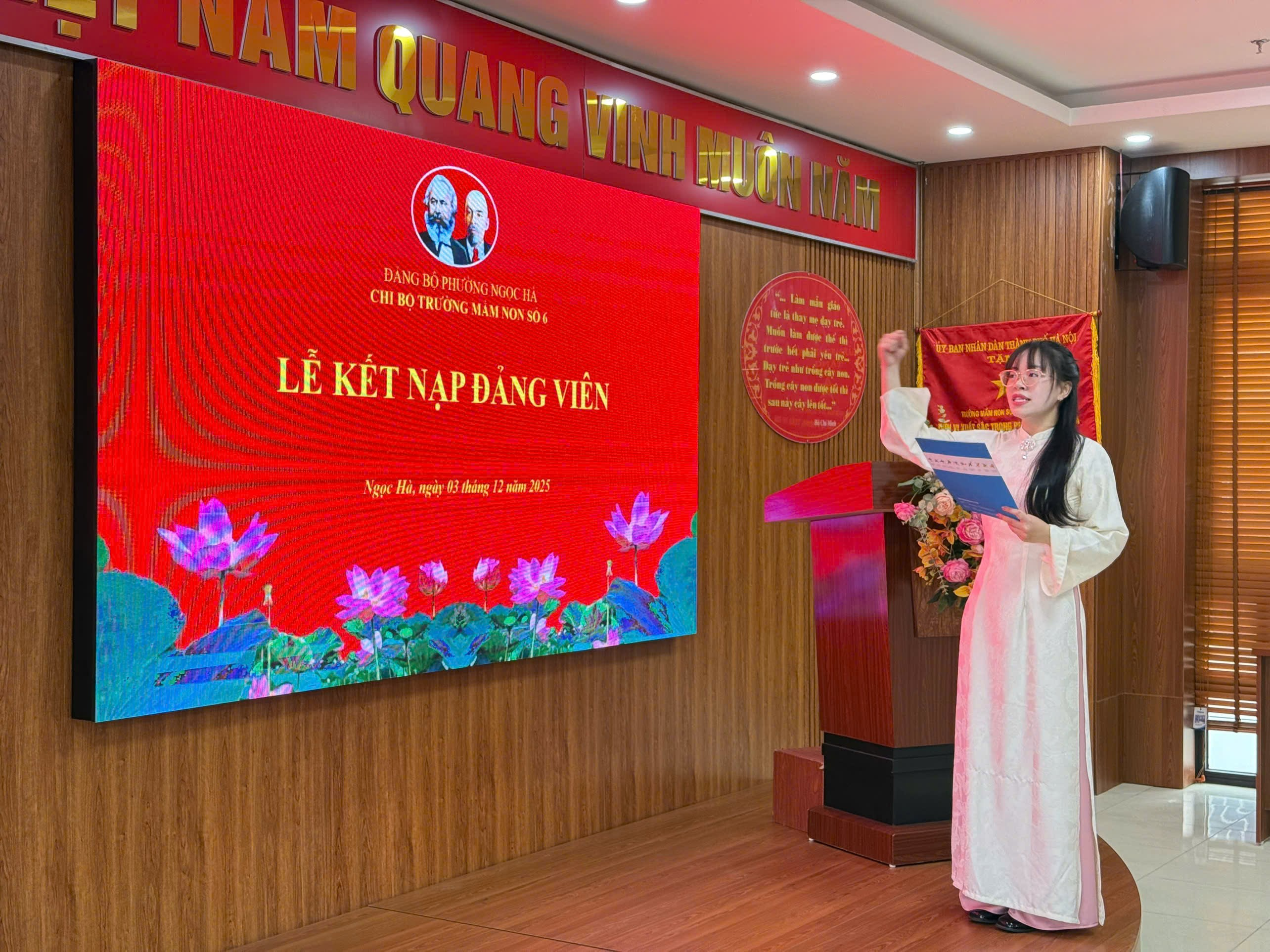 Xúc động phát biểu tại buổi lễ, Đảng viên mới Bùi Thị Tuyết Ngân gửi lời cảm ơn sâu sắc tới Chi bộ, Ban Giám hiệu và đồng nghiệp đã luôn giúp đỡ, đồng hành và động viên đồng chí trong suốt quá trình phấn đấu. Đồng chí hứa sẽ nỗ lực rèn luyện, học tập và gương mẫu trong mọi hoạt động, xứng đáng với sự tin tưởng của tổ chức Đảng.