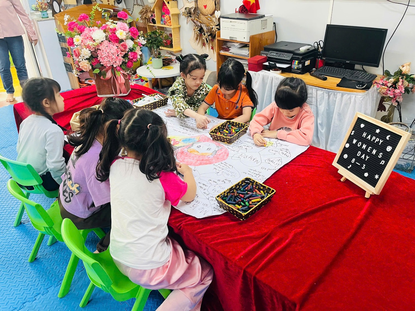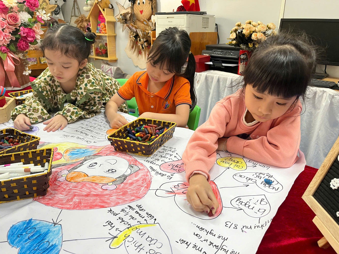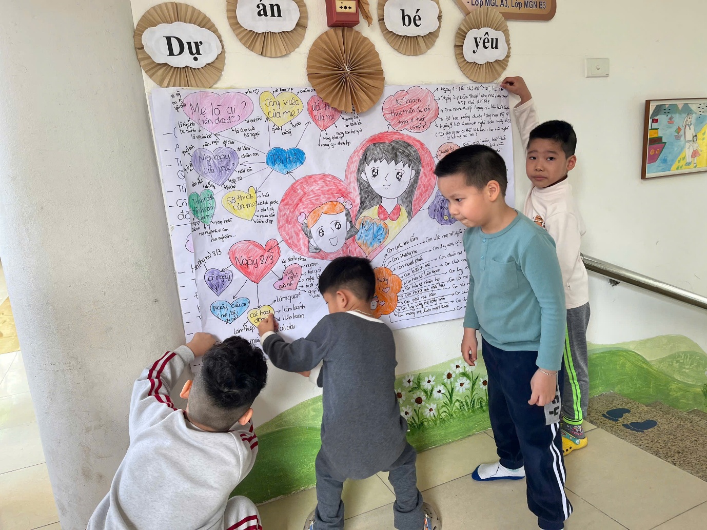 Trong quá trình thực hiện dự án, các con đã cùng cô tìm hiểu và trao đổi về những nội dung gần gũi như: Mẹ là ai? Công việc hằng ngày của mẹ là gì? Những điều con yêu và tự hào về mẹ. Từ những chia sẻ hồn nhiên ấy, cô và các con đã cùng xây dựng poster dự án, thể hiện bằng nhiều hình vẽ sinh động, màu sắc tươi sáng và những lời yêu thương giản dị.