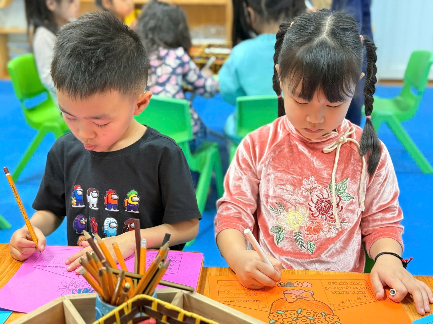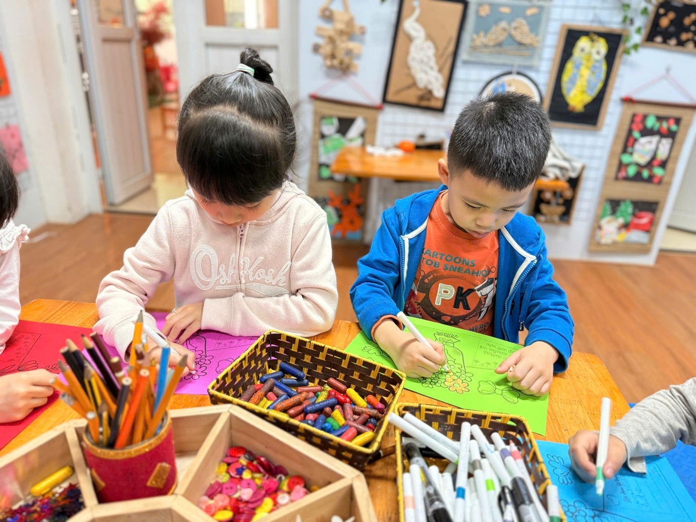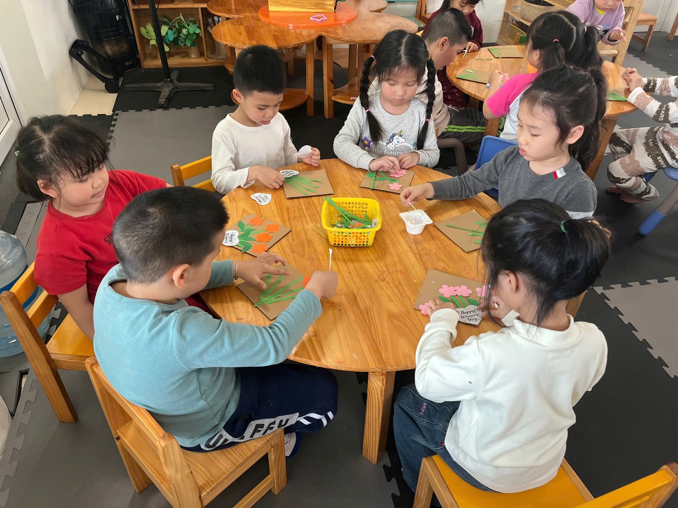 Hoạt động làm thiệp sáng tạo tặng mẹ ở lớp năng khiếu tạo hình.