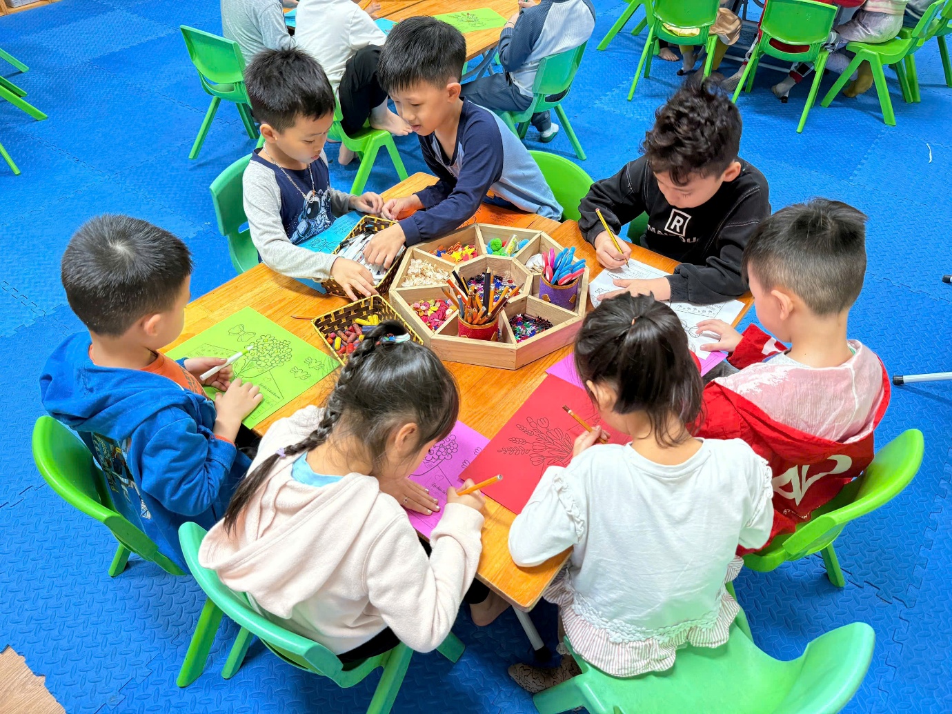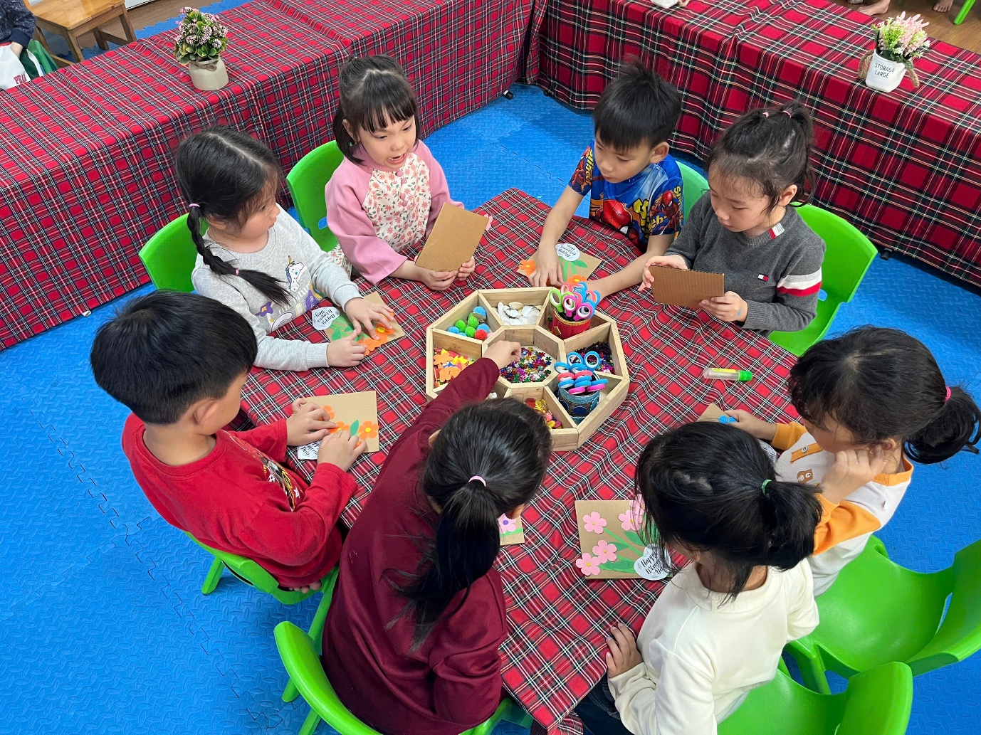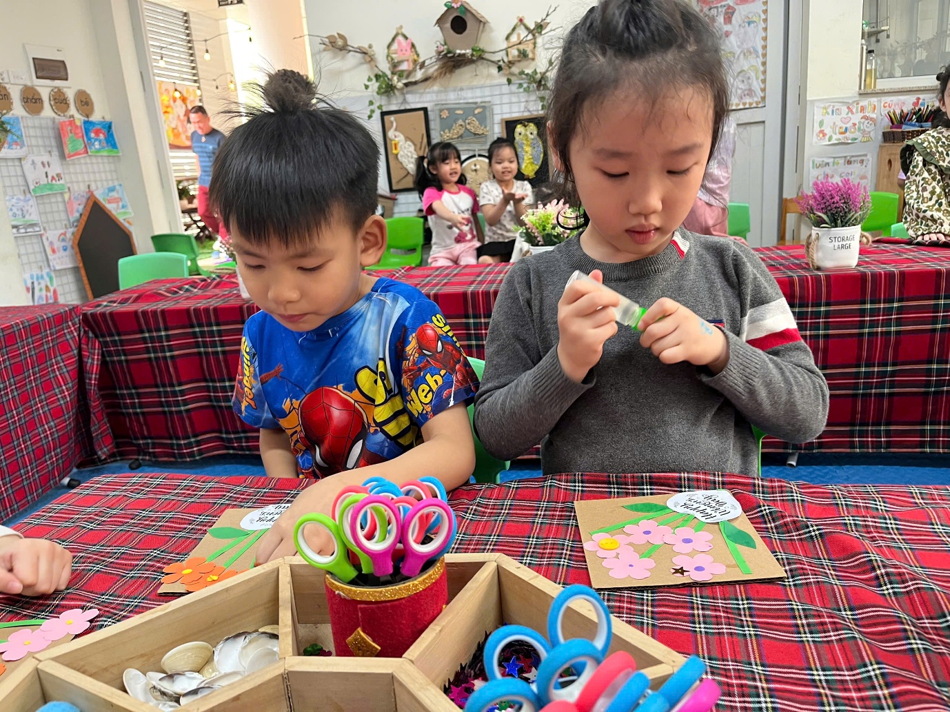 Cô giáo hướng dẫn các con làm thiệp.