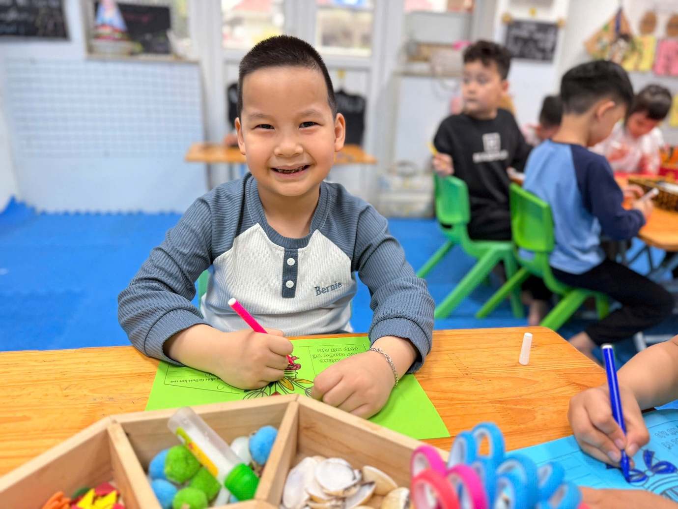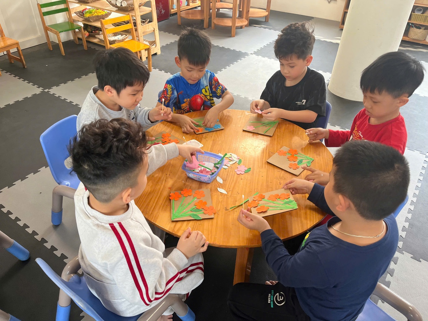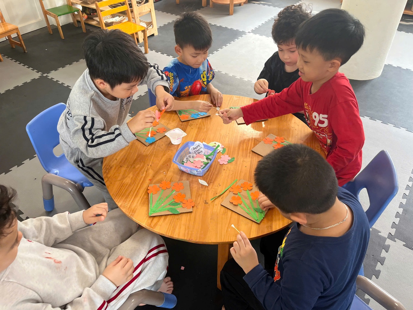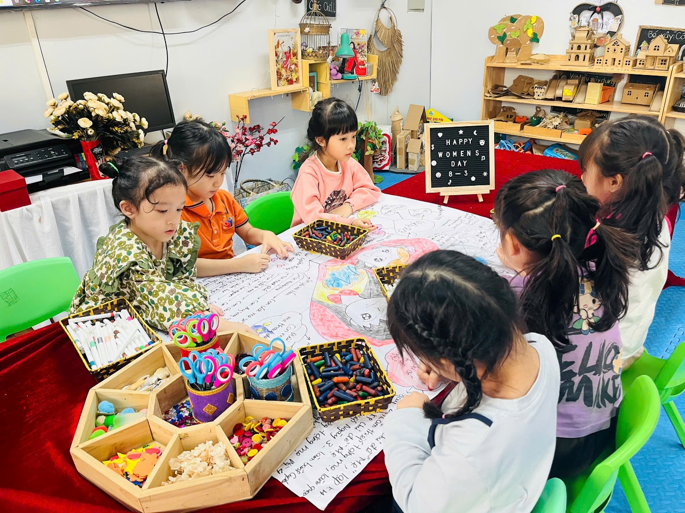 Ở hoạt động tạo hình, các bạn nhỏ lớp A3 đã tự tay cắt, dán và trang trí những tấm thiệp 3D chúc mừng 8/3 dành tặng mẹ. Mỗi tấm thiệp là một món quà nhỏ chứa đựng tình cảm chân thành và lời chúc ngọt ngào mà các con muốn gửi tới mẹ.