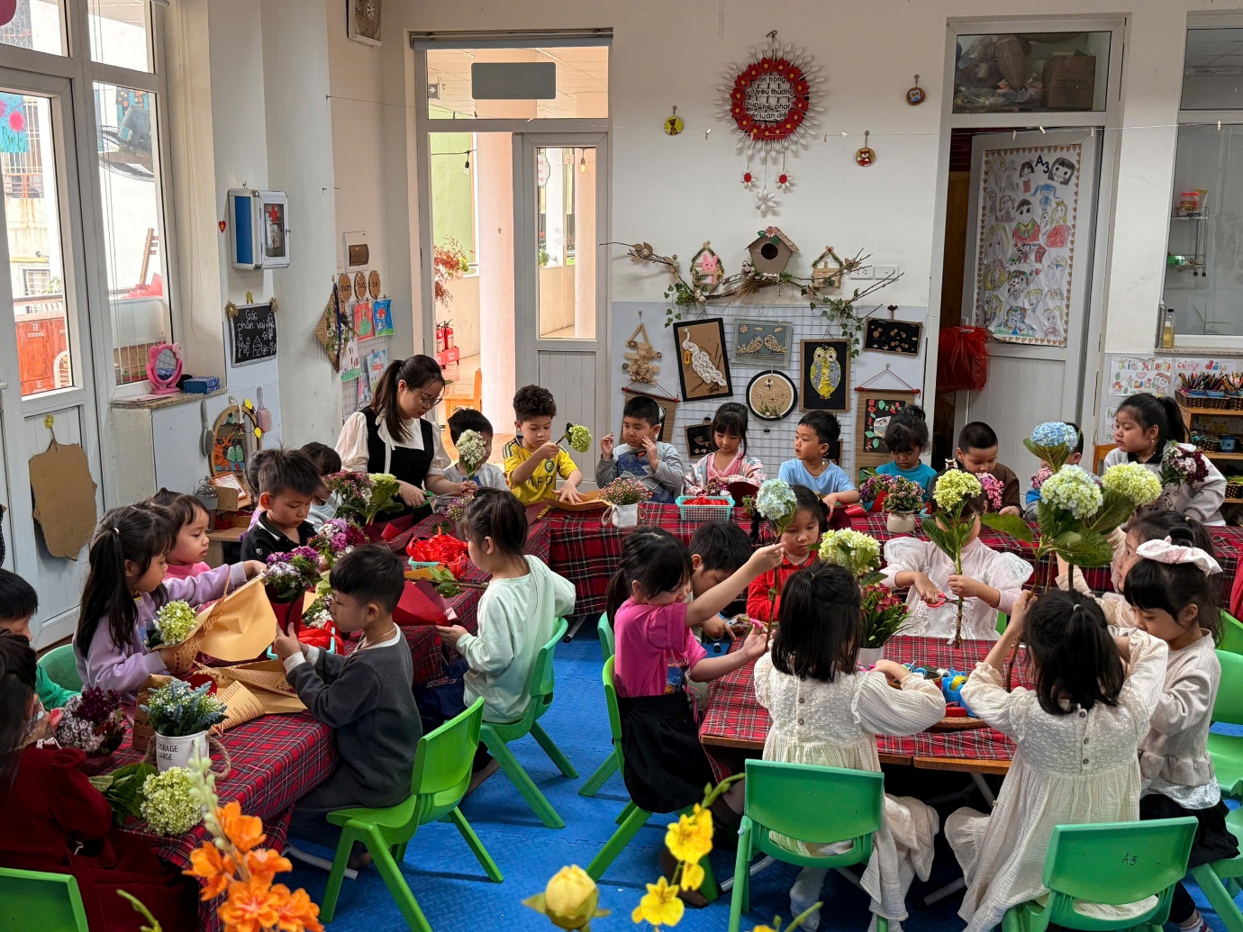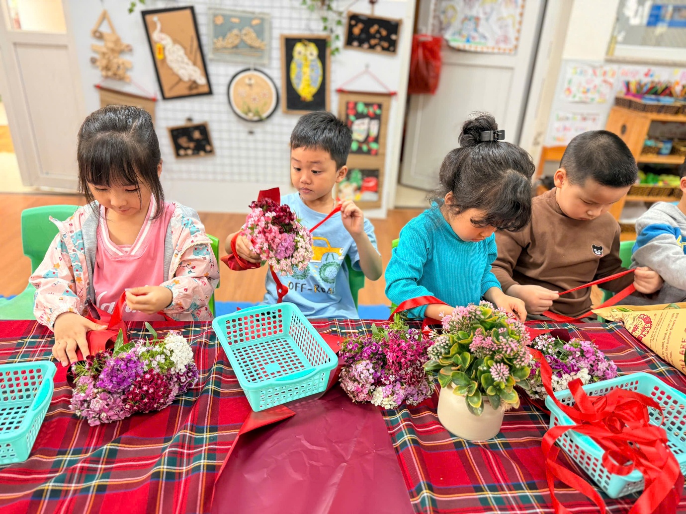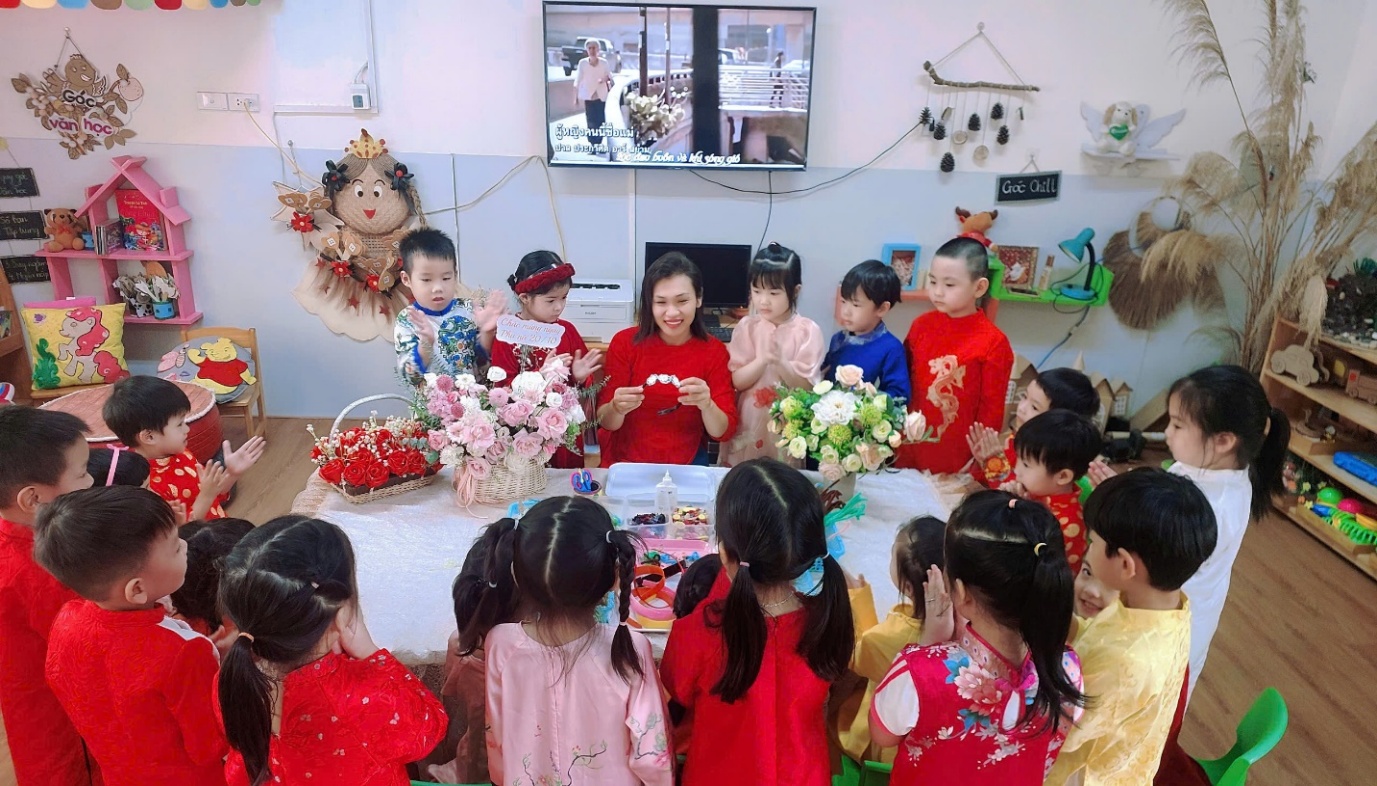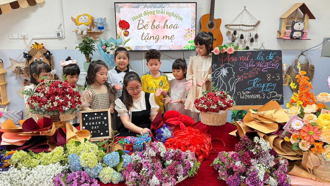 Ở hoạt động trải nghiệm, các con đã được tự tay bó những bó hoa tươi để dành tặng mẹ. Cô giáo đã chuẩn bị rất nhiều loại hoa đẹp như: cẩm tú cầu, phăng công chúa, baby, salem, hướng dương, mao lương... Cùng các nguyên liệu khác: giấy gói, nơ buộc.. cho chúng mình thoả thích lựa chọn và kết hợp đấy. Thông qua hoạt động, các con được rèn luyện sự khéo léo, sáng tạo và học cách thể hiện tình cảm yêu thương dành cho mẹ. Mỗi bông hoa là một lời chúc ngọt ngào, một tình cảm trong trẻo mà các con muốn gửi đến người phụ nữ tuyệt vời nhất của mình.