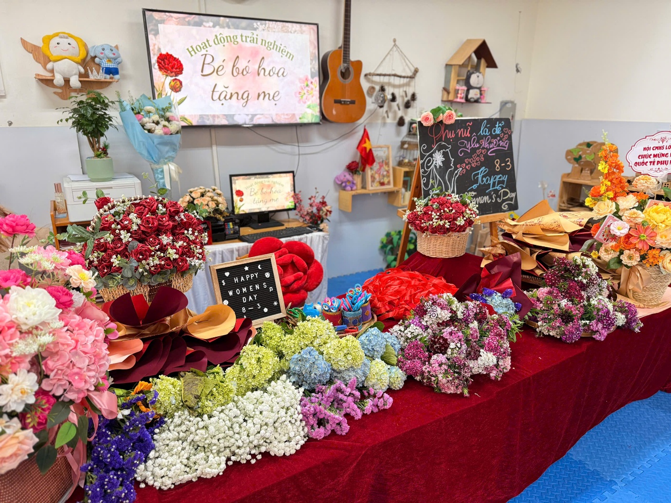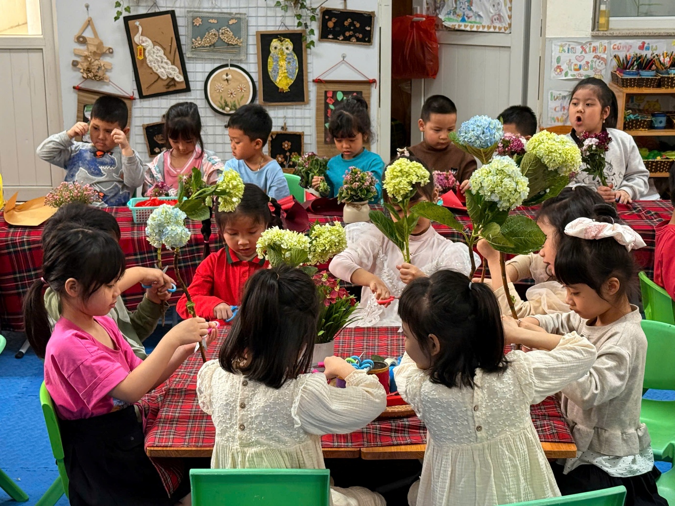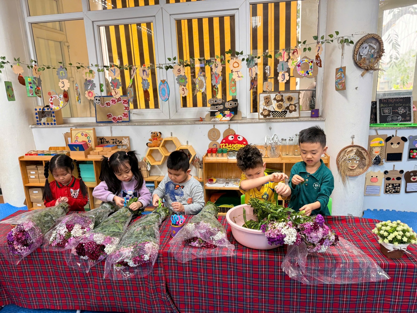 Ở hoạt động trải nghiệm, các con đã được tự tay bó những bó hoa tươi để dành tặng mẹ. Cô giáo đã chuẩn bị rất nhiều loại hoa đẹp như: cẩm tú cầu, phăng công chúa, baby, salem, hướng dương, mao lương... Cùng các nguyên liệu khác: giấy gói, nơ buộc.. cho chúng mình thoả thích lựa chọn và kết hợp đấy. Thông qua hoạt động, các con được rèn luyện sự khéo léo, sáng tạo và học cách thể hiện tình cảm yêu thương dành cho mẹ. Mỗi bông hoa là một lời chúc ngọt ngào, một tình cảm trong trẻo mà các con muốn gửi đến người phụ nữ tuyệt vời nhất của mình.