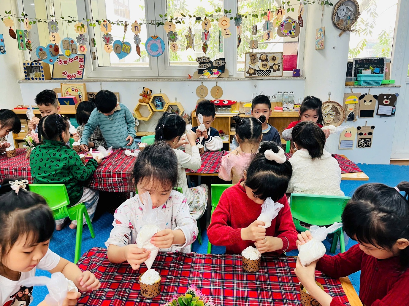 Dưới sự hướng dẫn tận tình của các cô giáo, những đôi bàn tay nhỏ xíu đã tự mình thực hiện các công đoạn: trang trí những lớp kem, rắc cốm, cài topping thành những chiếc cupcake thật xinh xắn đáng yêu.