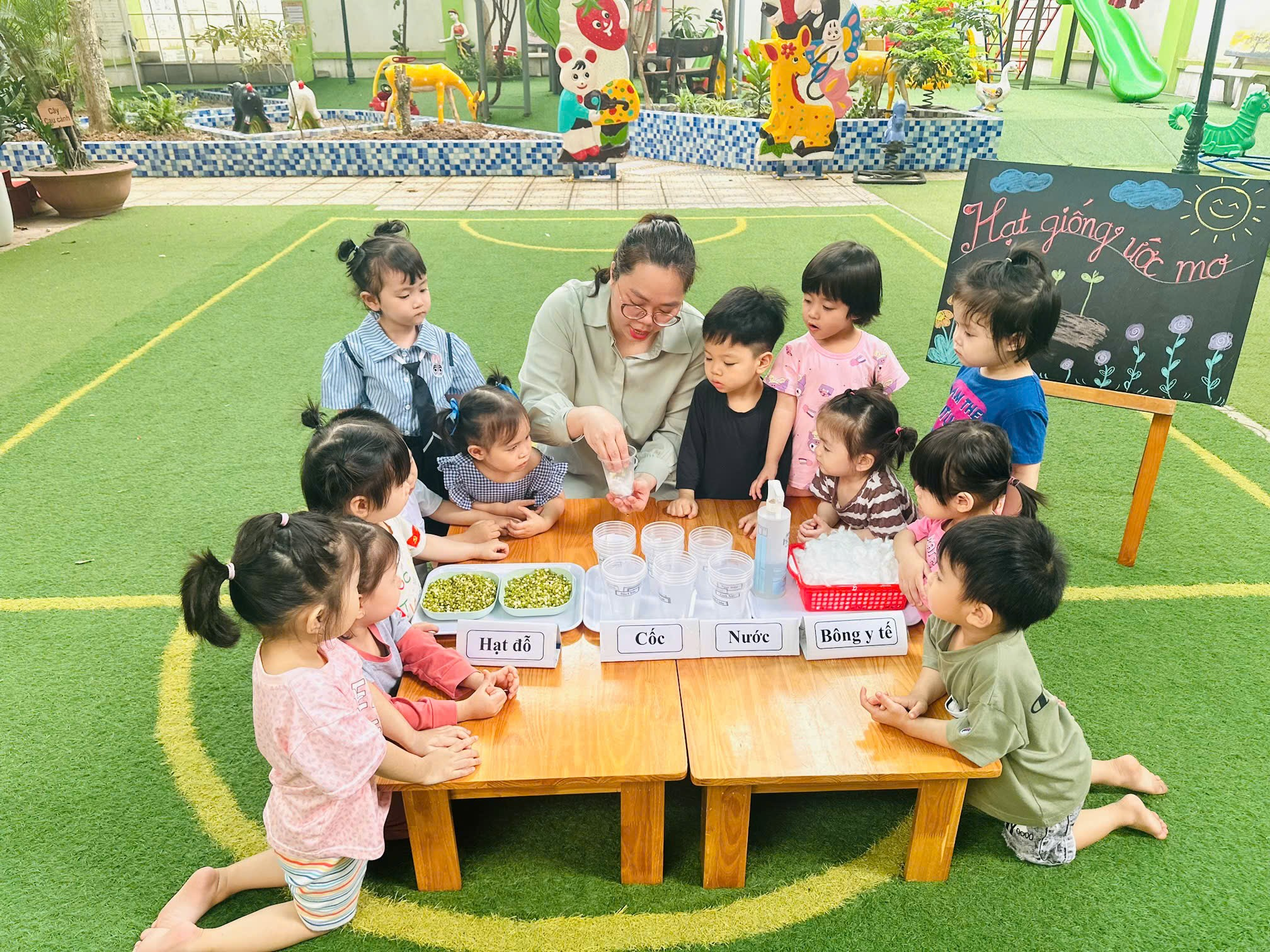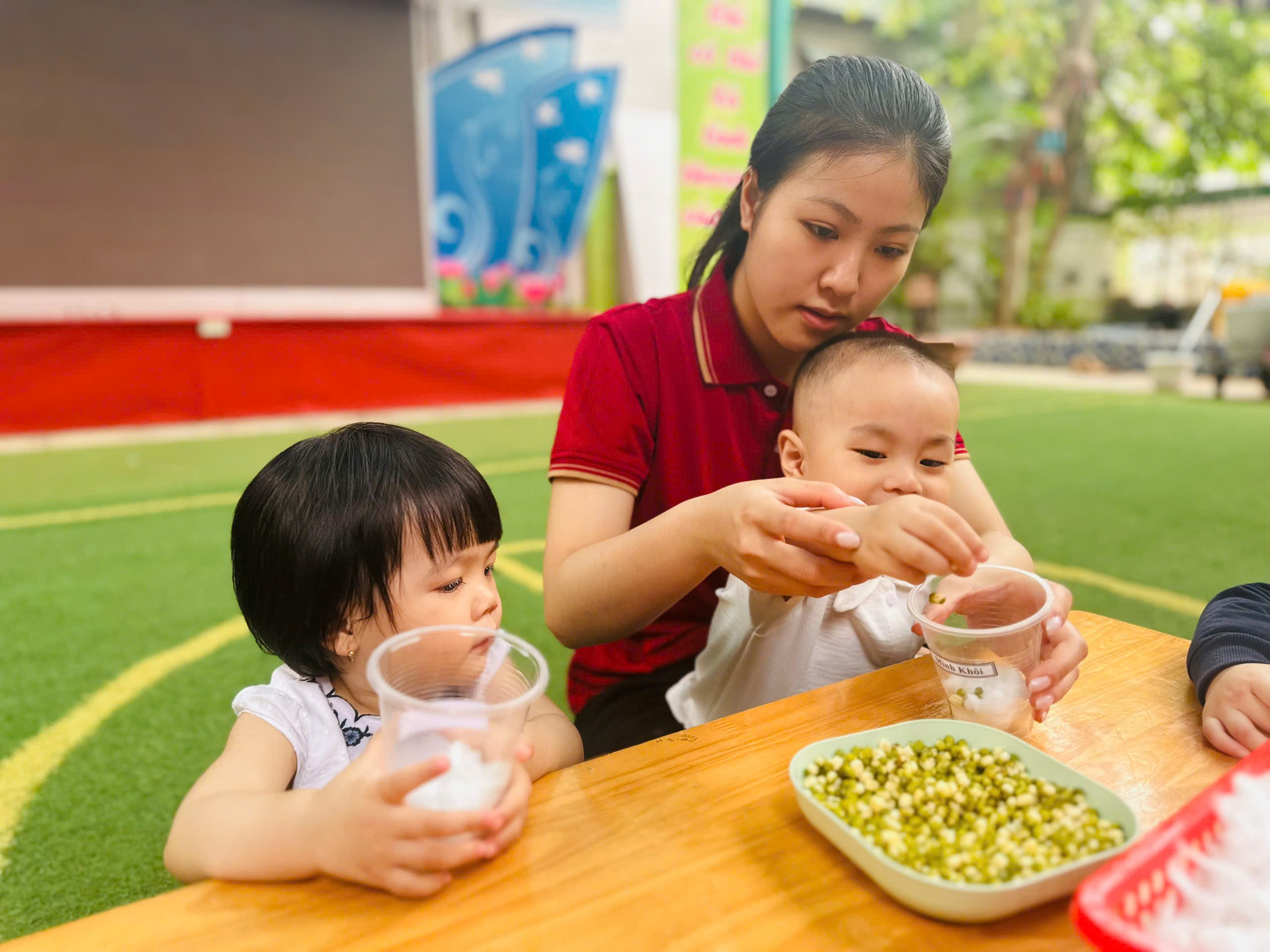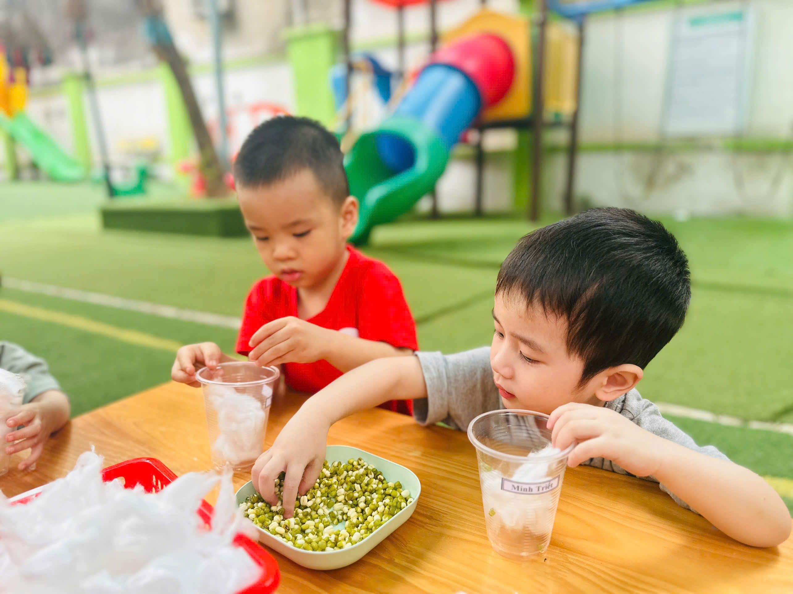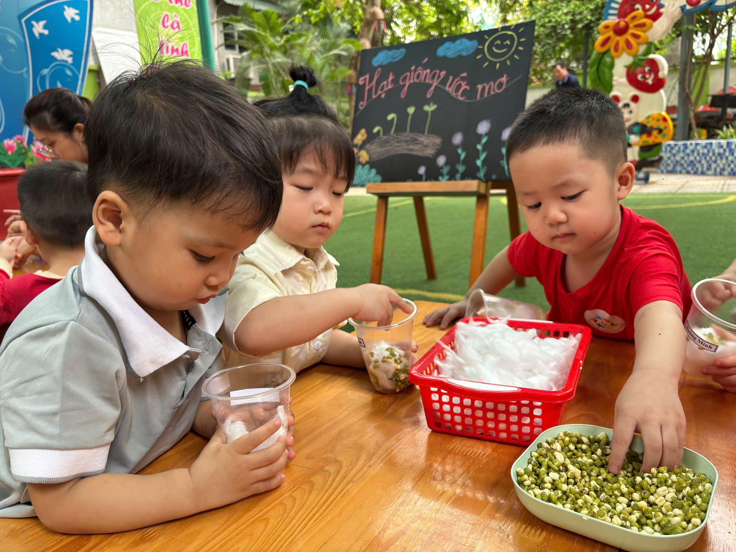 Gần gũi với thiên nhiên là một trong những yếu tố quan trọng giúp tăng cường khả năng tư duy và sáng tạo của trẻ. Dưới sự hướng dẫn của cô giáo, các bé được quan sát hạt giống, học cách gieo hạt đúng cách. Các bé rất hào hứng khi tự tay bỏ từng lớp bông, những hạt đậu vào hộp nhỏ và tưới nước cho hạt mầm lớn lên. Hoạt động gieo hạt giúp các bé phát triển kỹ năng quan sát, hình thành thói quen bảo vệ môi trường và nuôi dưỡng tình yêu lao động ngay từ nhỏ. Thiên nhiên làm cho trẻ thích thú, kích thích trí tò mò của trẻ, quan tâm đến mọi việc xung quanh. Hơn nữa còn giúp phát triển năng lực quan sát, trí thông minh và vốn sống thực tế của trẻ. Được tự tay gieo hạt, chăm sóc tưới nước hằng ngày để mầm cây phát triển tươi tốt và nhìn chúng lớn lên từng ngày, các bé sẽ dần yêu thiên nhiên và quý trọng vẻ đẹp của cây xanh. Qua hoạt động này, trẻ không chỉ rèn luyện sự khéo léo của đôi tay mà còn học được cách yêu thiên nhiên, biết chăm sóc và chờ đợi cây lớn lên từng ngày.