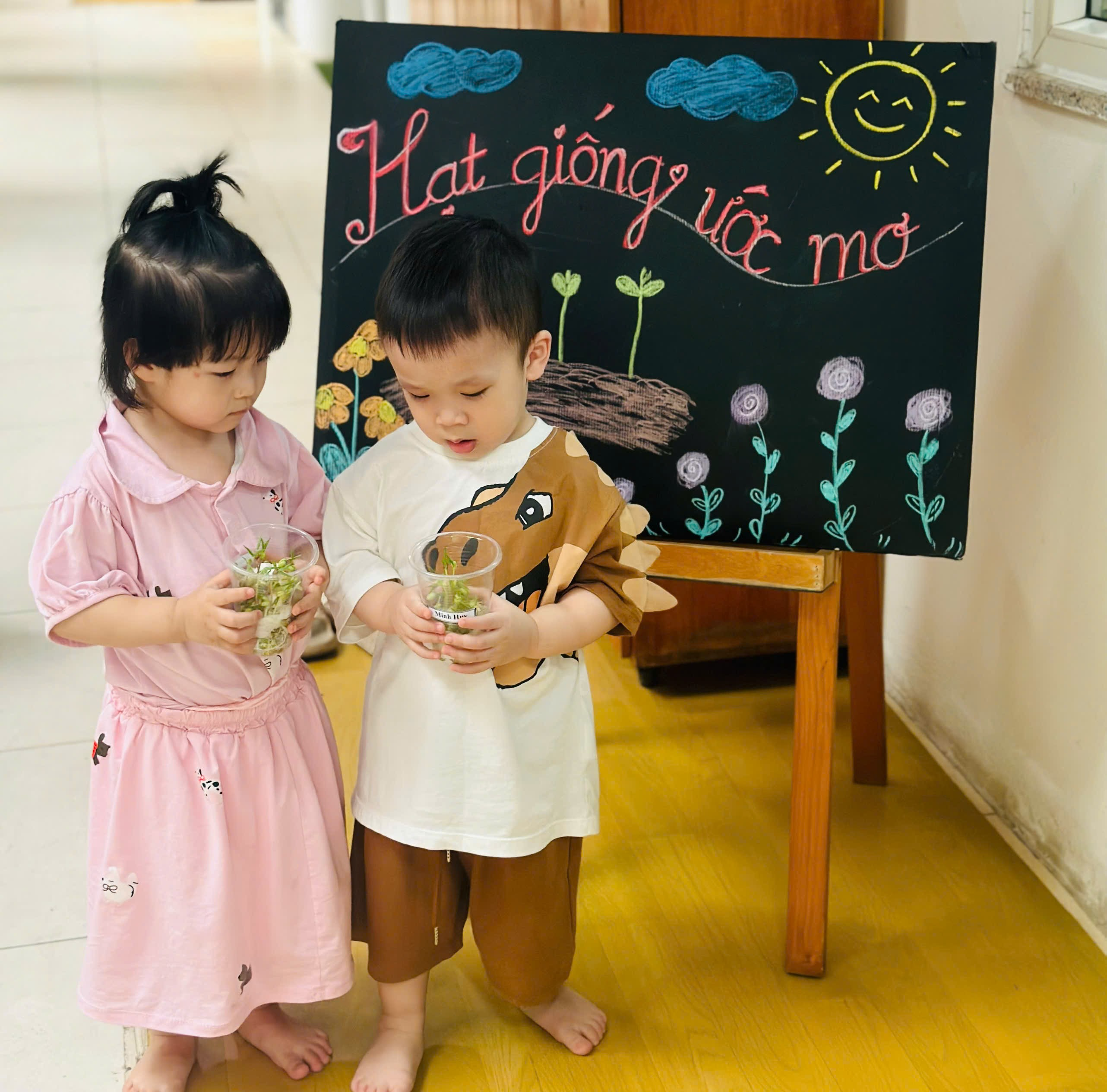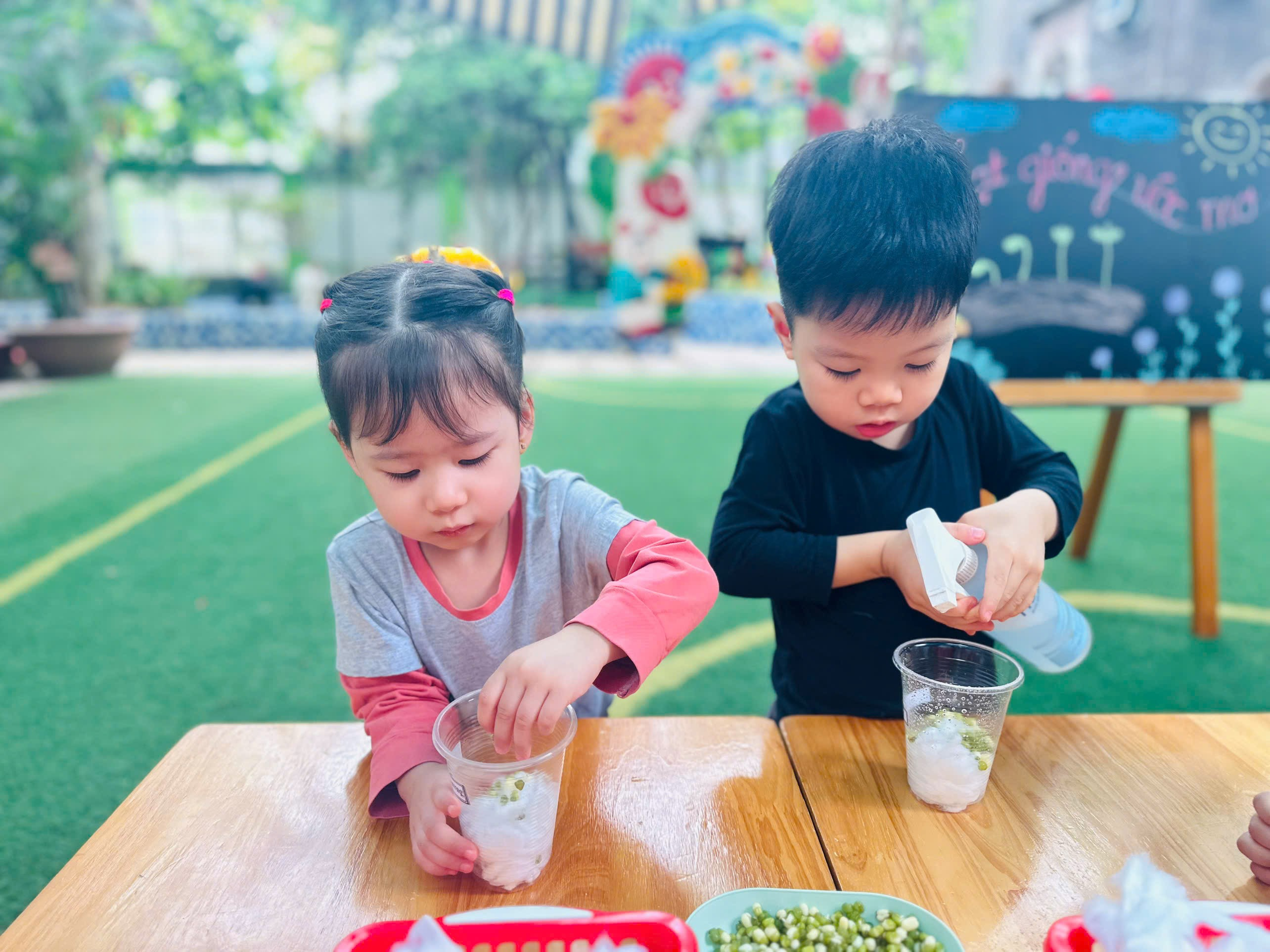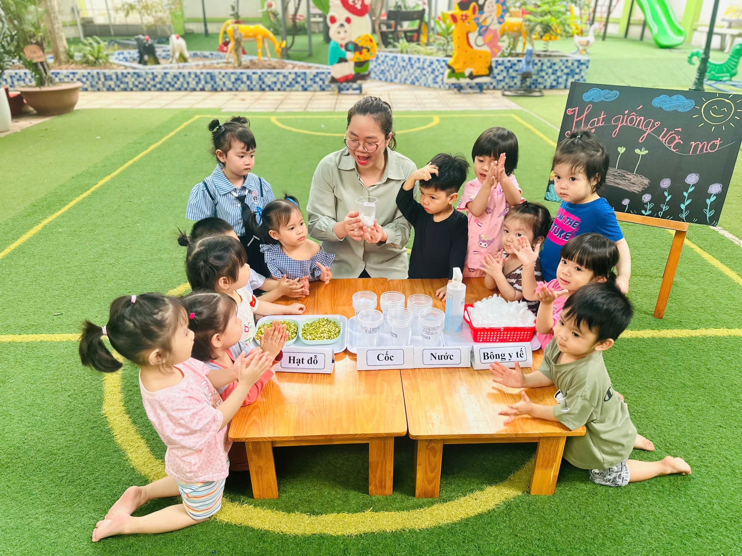 Gần gũi với thiên nhiên là một trong những yếu tố quan trọng giúp tăng cường khả năng tư duy và sáng tạo của trẻ. Dưới sự hướng dẫn của cô giáo, các bé được quan sát hạt giống, học cách gieo hạt đúng cách. Các bé rất hào hứng khi tự tay bỏ từng lớp bông, những hạt đậu vào hộp nhỏ và tưới nước cho hạt mầm lớn lên. Hoạt động gieo hạt giúp các bé phát triển kỹ năng quan sát, hình thành thói quen bảo vệ môi trường và nuôi dưỡng tình yêu lao động ngay từ nhỏ. Thiên nhiên làm cho trẻ thích thú, kích thích trí tò mò của trẻ, quan tâm đến mọi việc xung quanh. Hơn nữa còn giúp phát triển năng lực quan sát, trí thông minh và vốn sống thực tế của trẻ. Được tự tay gieo hạt, chăm sóc tưới nước hằng ngày để mầm cây phát triển tươi tốt và nhìn chúng lớn lên từng ngày, các bé sẽ dần yêu thiên nhiên và quý trọng vẻ đẹp của cây xanh. Qua hoạt động này, trẻ không chỉ rèn luyện sự khéo léo của đôi tay mà còn học được cách yêu thiên nhiên, biết chăm sóc và chờ đợi cây lớn lên từng ngày.