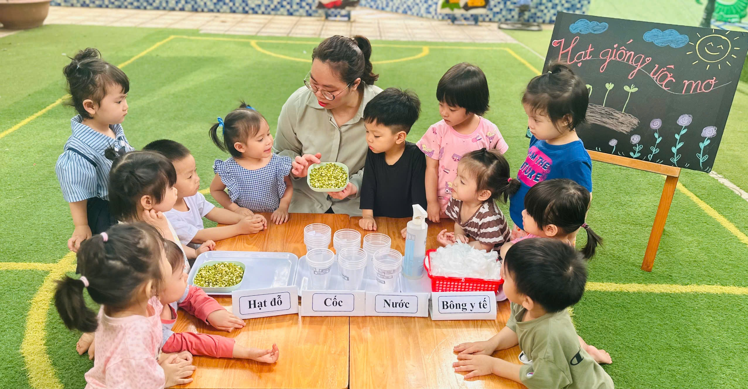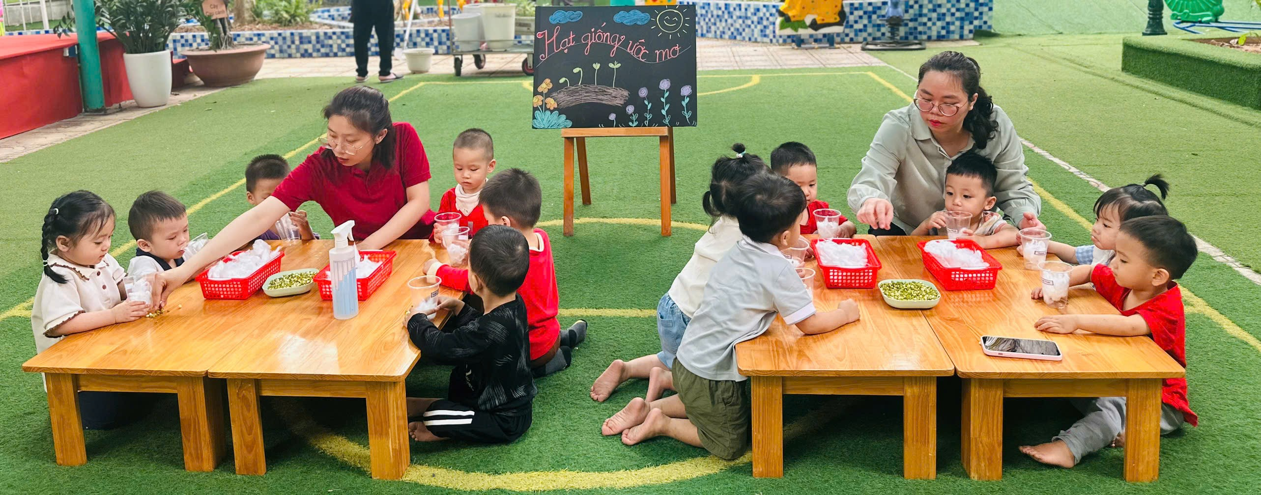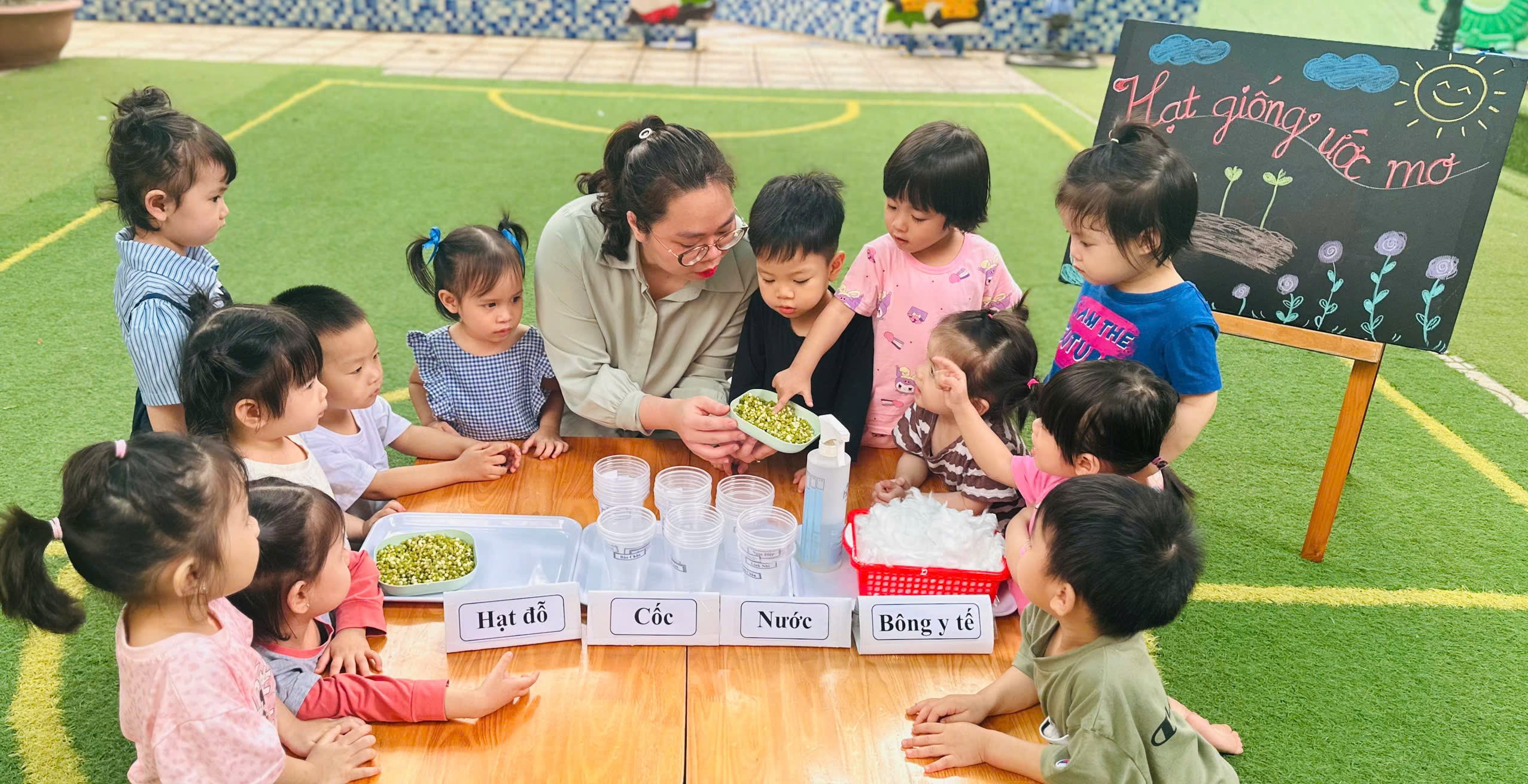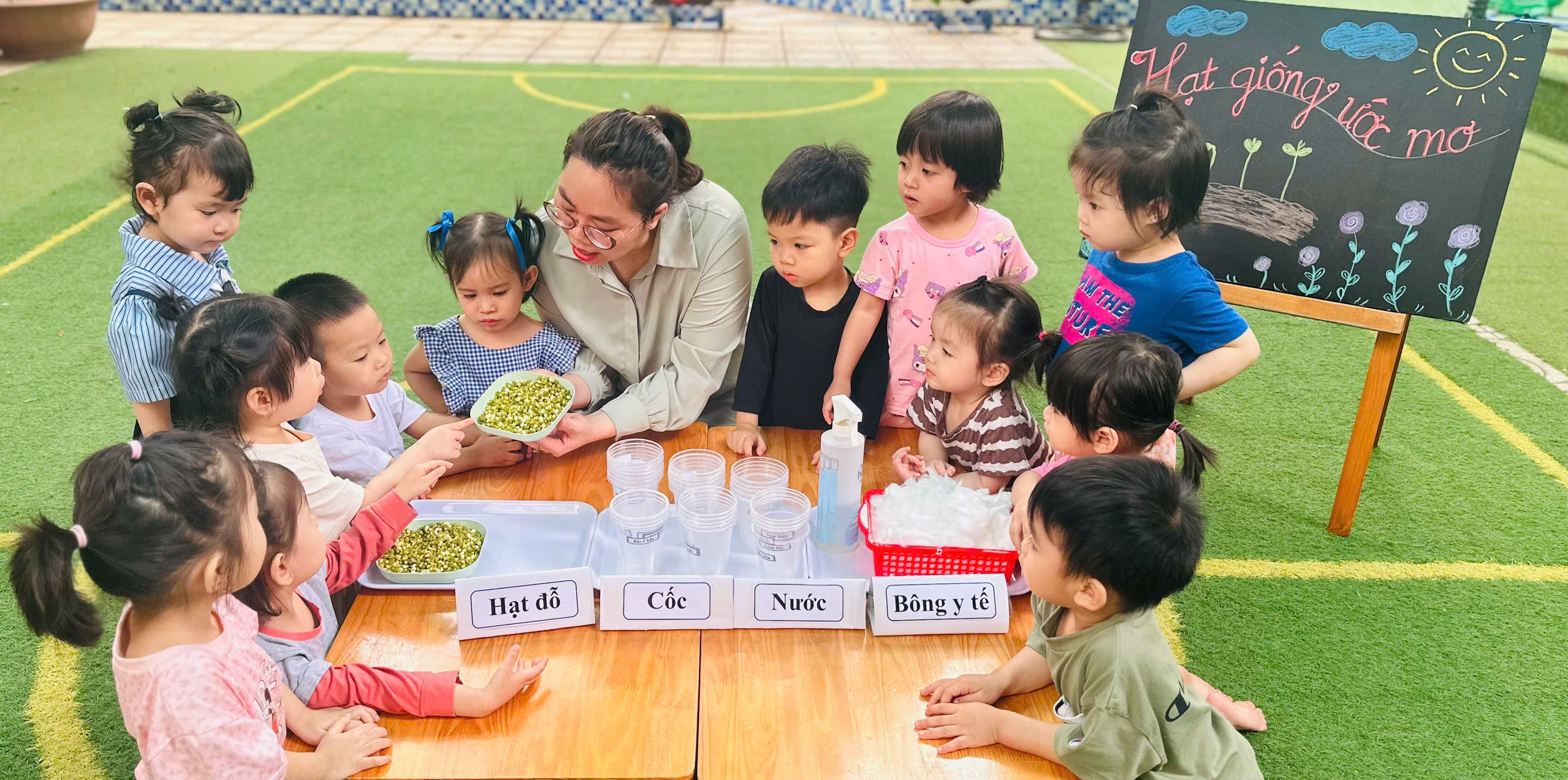 Gần gũi với thiên nhiên là một trong những yếu tố quan trọng giúp tăng cường khả năng tư duy và sáng tạo của trẻ. Dưới sự hướng dẫn của cô giáo, các bé được quan sát hạt giống, học cách gieo hạt đúng cách. Các bé rất hào hứng khi tự tay bỏ từng lớp bông, những hạt đậu vào hộp nhỏ và tưới nước cho hạt mầm lớn lên. Hoạt động gieo hạt giúp các bé phát triển kỹ năng quan sát, hình thành thói quen bảo vệ môi trường và nuôi dưỡng tình yêu lao động ngay từ nhỏ. Thiên nhiên làm cho trẻ thích thú, kích thích trí tò mò của trẻ, quan tâm đến mọi việc xung quanh. Hơn nữa còn giúp phát triển năng lực quan sát, trí thông minh và vốn sống thực tế của trẻ. Được tự tay gieo hạt, chăm sóc tưới nước hằng ngày để mầm cây phát triển tươi tốt và nhìn chúng lớn lên từng ngày, các bé sẽ dần yêu thiên nhiên và quý trọng vẻ đẹp của cây xanh. Qua hoạt động này, trẻ không chỉ rèn luyện sự khéo léo của đôi tay mà còn học được cách yêu thiên nhiên, biết chăm sóc và chờ đợi cây lớn lên từng ngày.