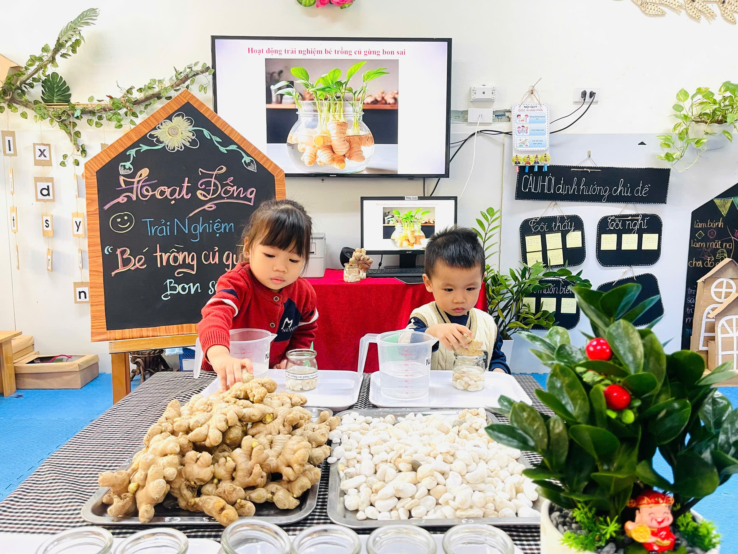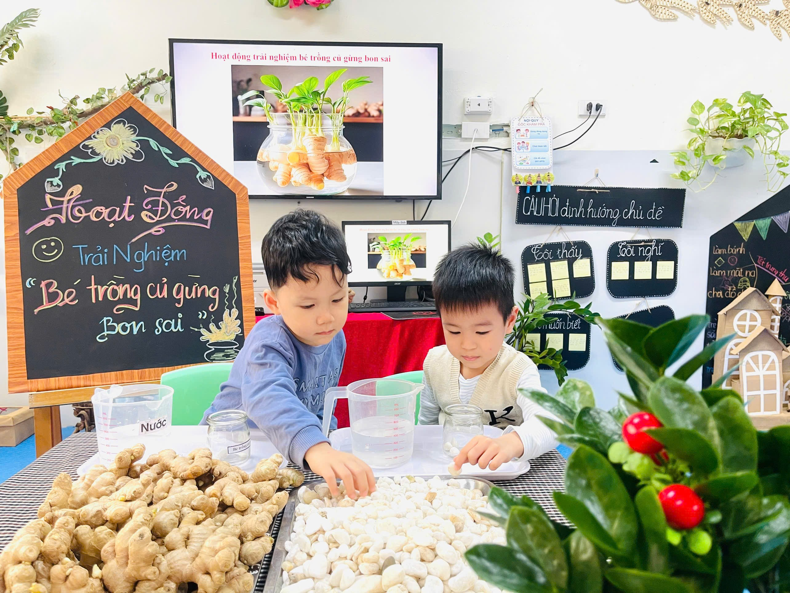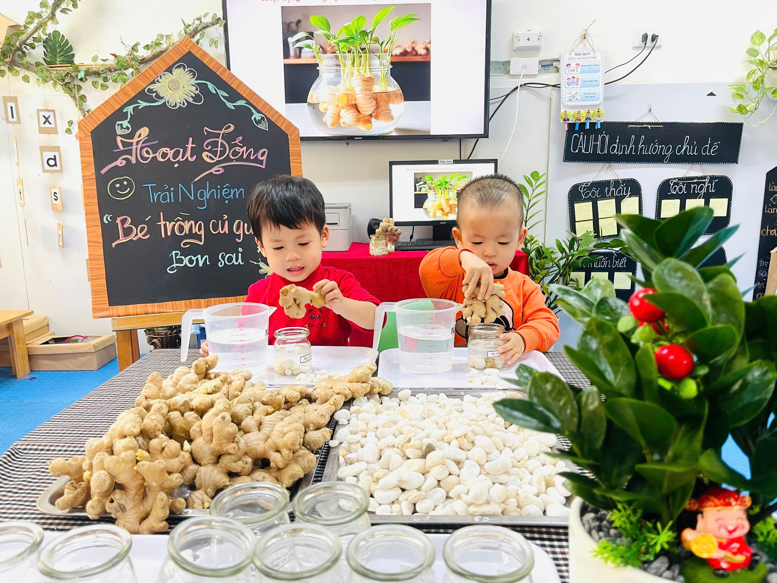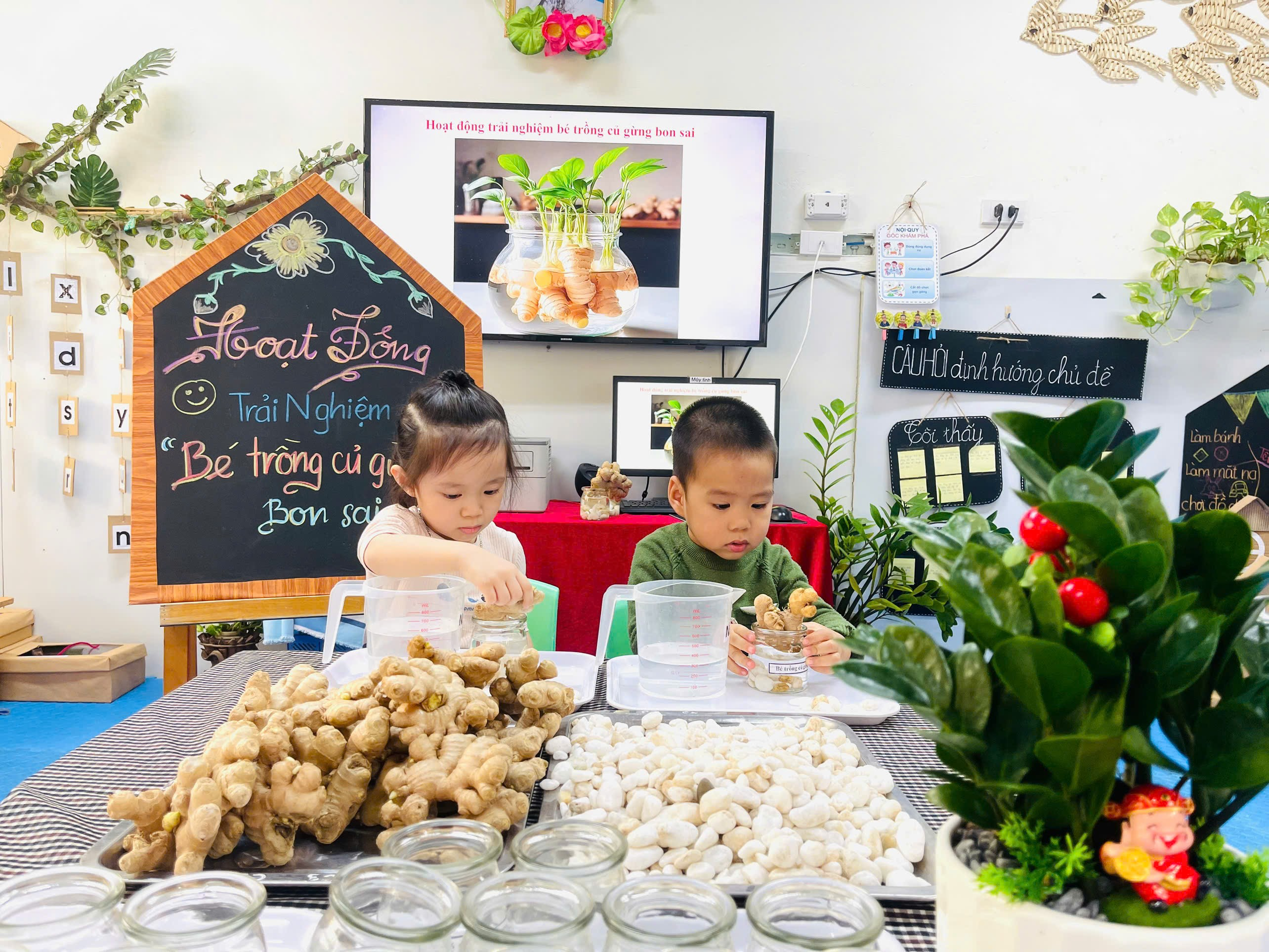 Từng củ gừng nhỏ xinh được các con nhẹ nhàng đặt vào lọ thủy tinh và trang trí thêm những viên sỏi trắng cho nước vào lọ. Lọ gừng nhỏ bỗng trở nên thật xinh xắn là thành quả từ đôi bàn tay khéo léo và trí tưởng tượng đáng yêu của các con. Củ gừng giúp làm giảm đau nhức cơ, đau khớp. Thường dùng trong các bài thuốc cảm lạnh, ho, sổ mũi. Giúp làm ấm cơ thể, tăng lưu thông máu.