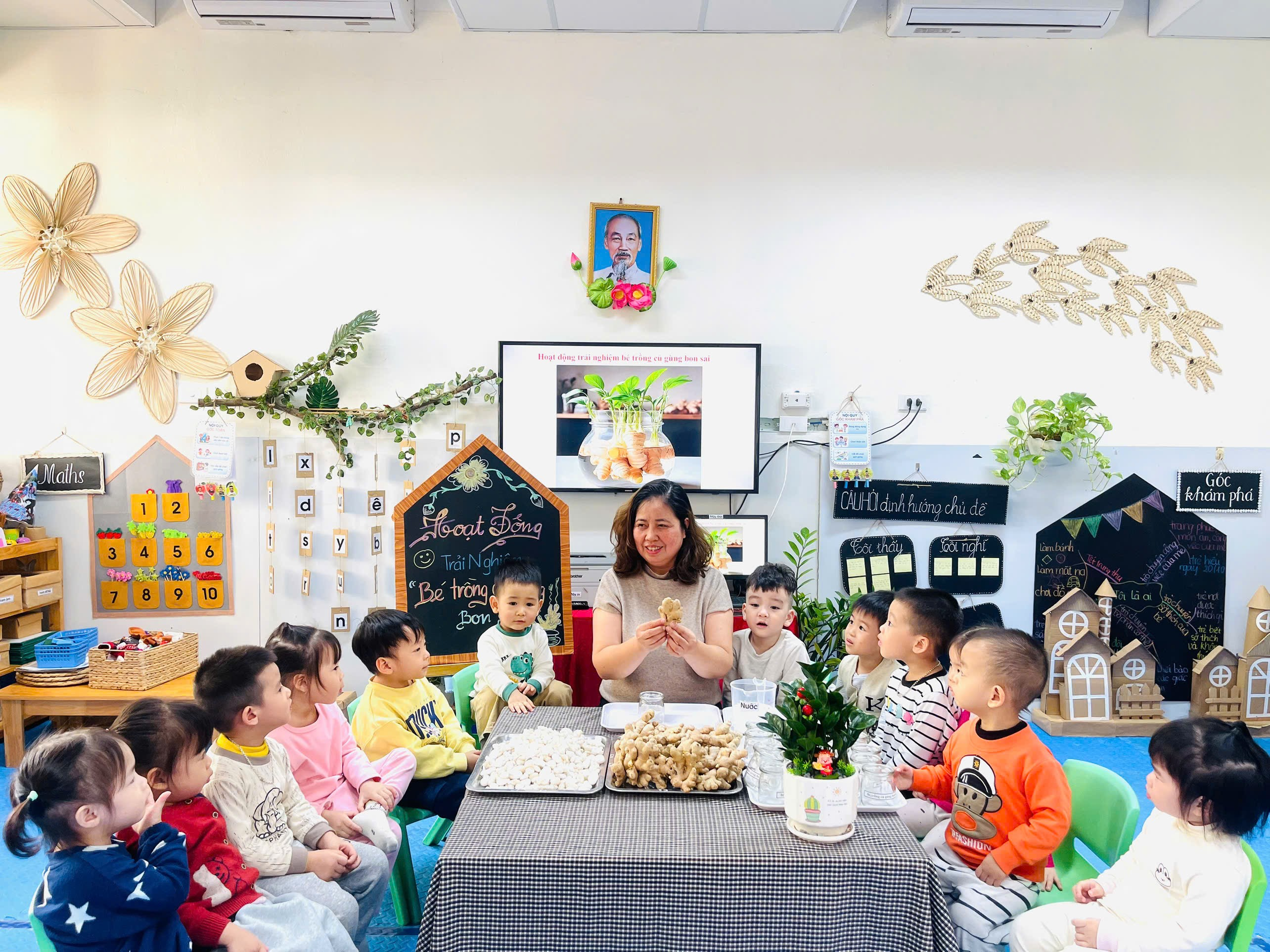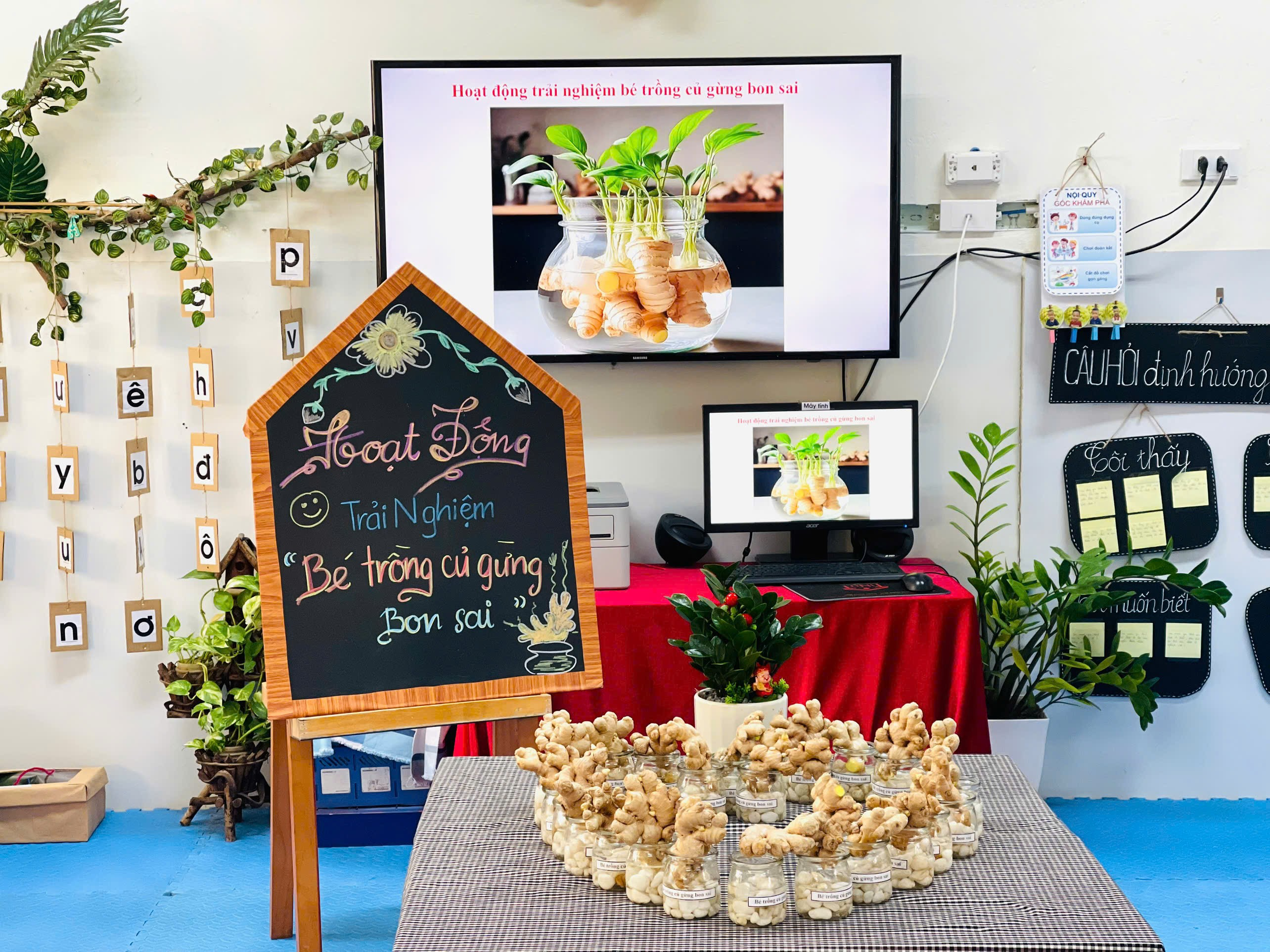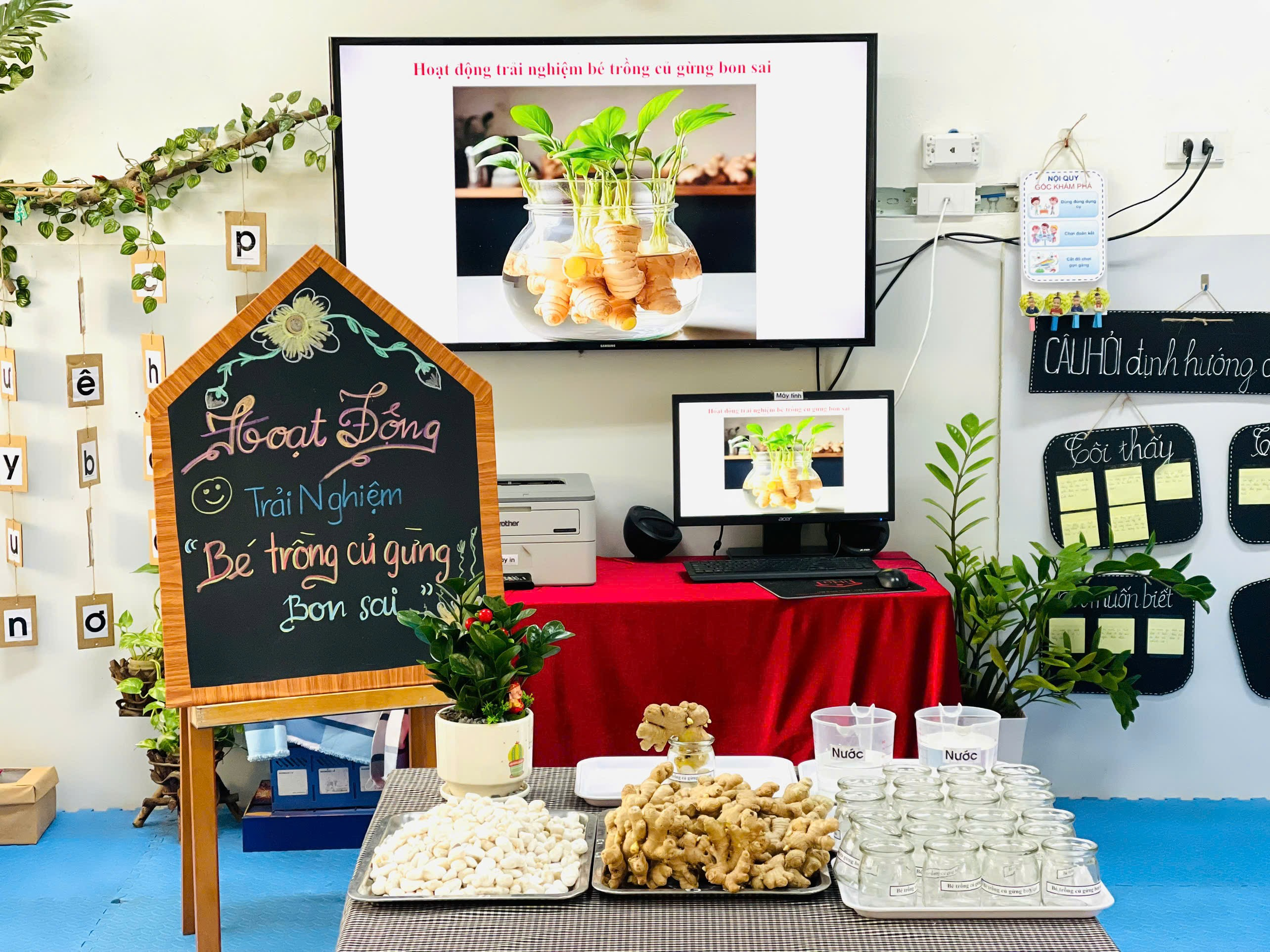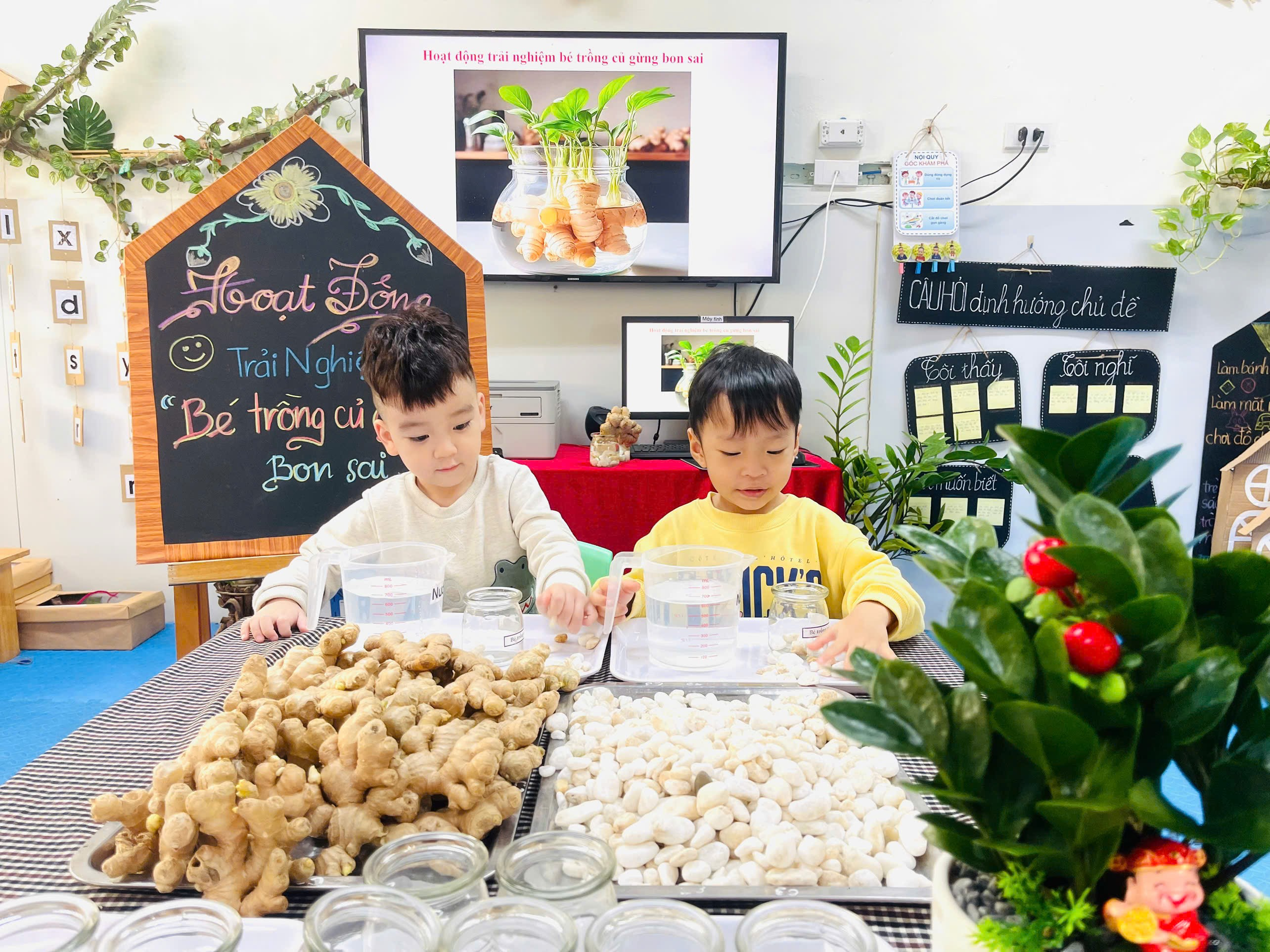 Từng củ gừng nhỏ xinh được các con nhẹ nhàng đặt vào lọ thủy tinh và trang trí thêm những viên sỏi trắng cho nước vào lọ. Lọ gừng nhỏ bỗng trở nên thật xinh xắn là thành quả từ đôi bàn tay khéo léo và trí tưởng tượng đáng yêu của các con. Củ gừng giúp làm giảm đau nhức cơ, đau khớp. Thường dùng trong các bài thuốc cảm lạnh, ho, sổ mũi. Giúp làm ấm cơ thể, tăng lưu thông máu.