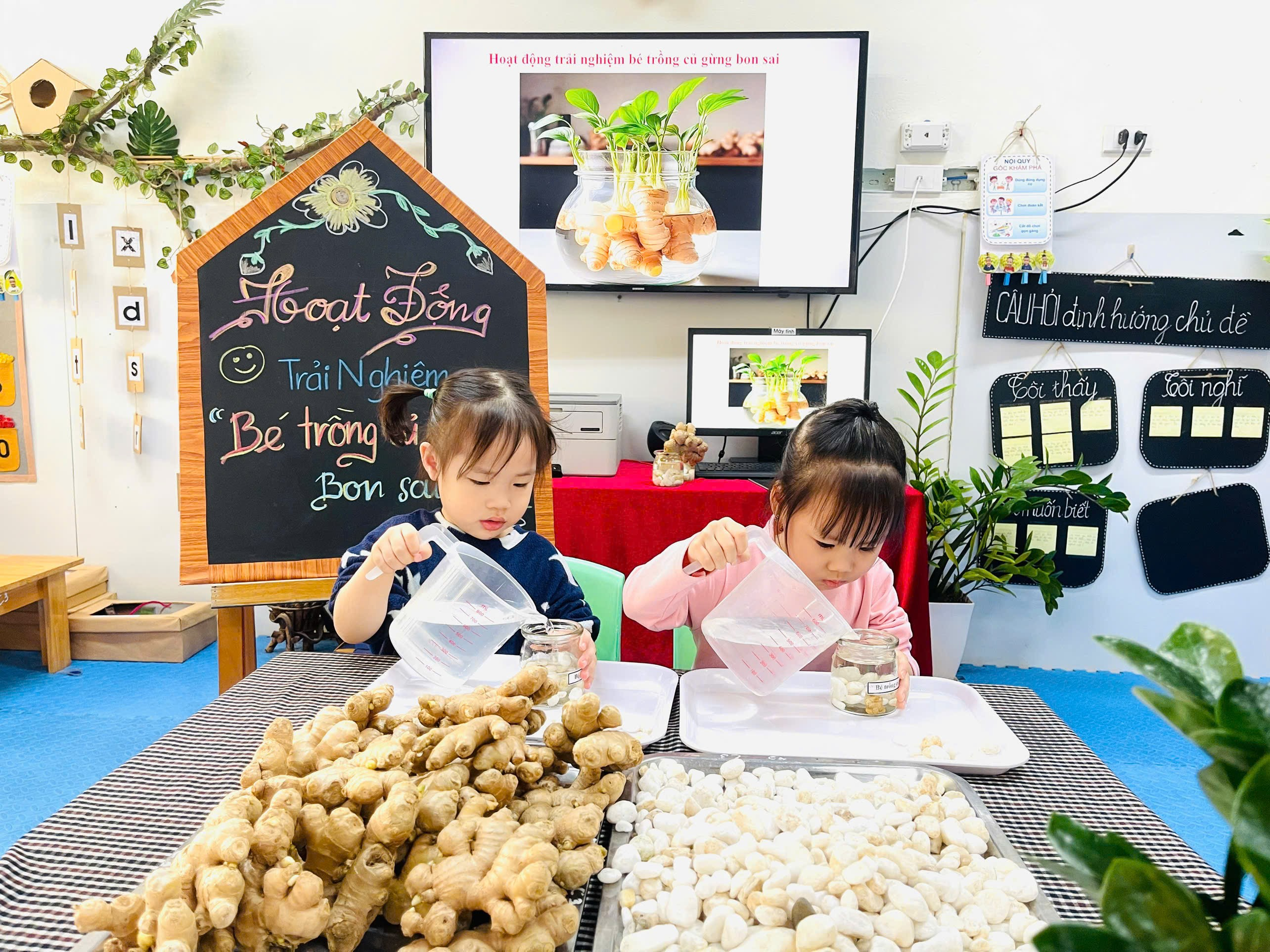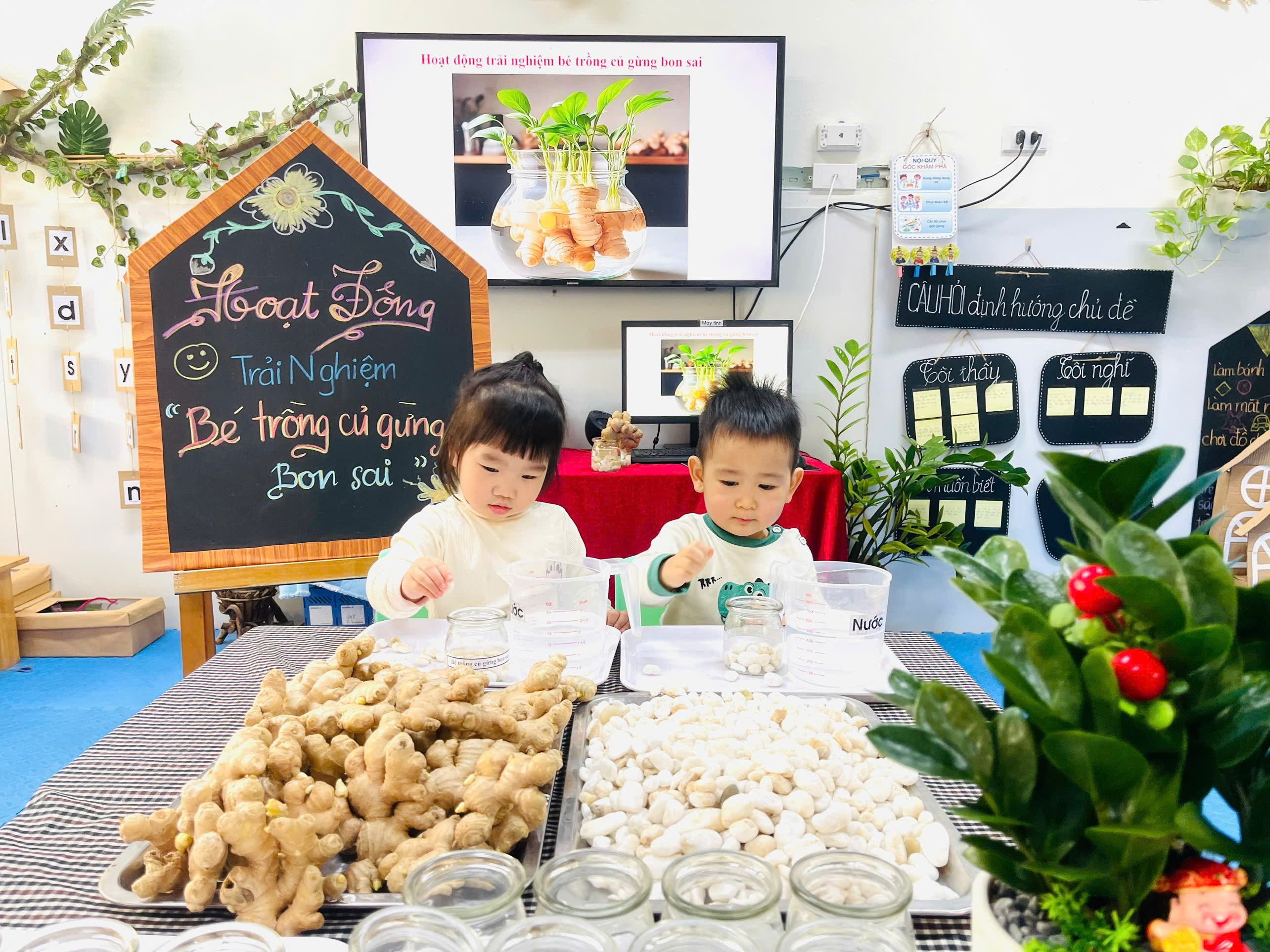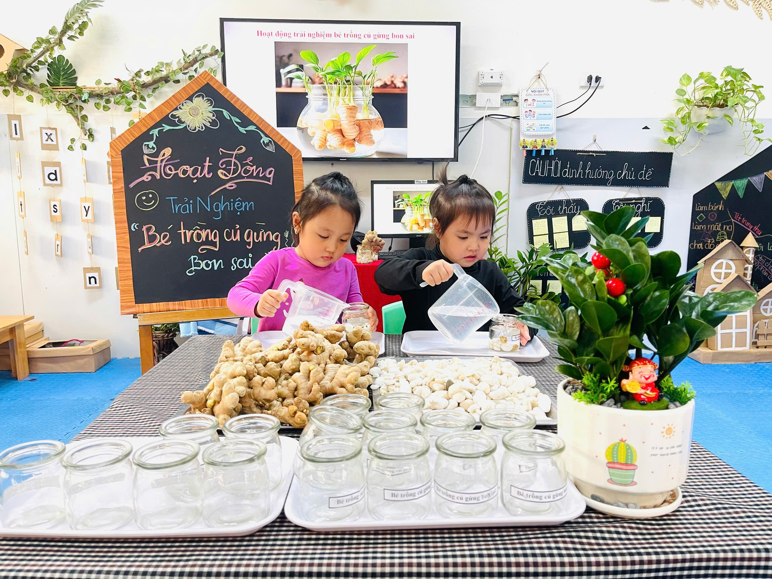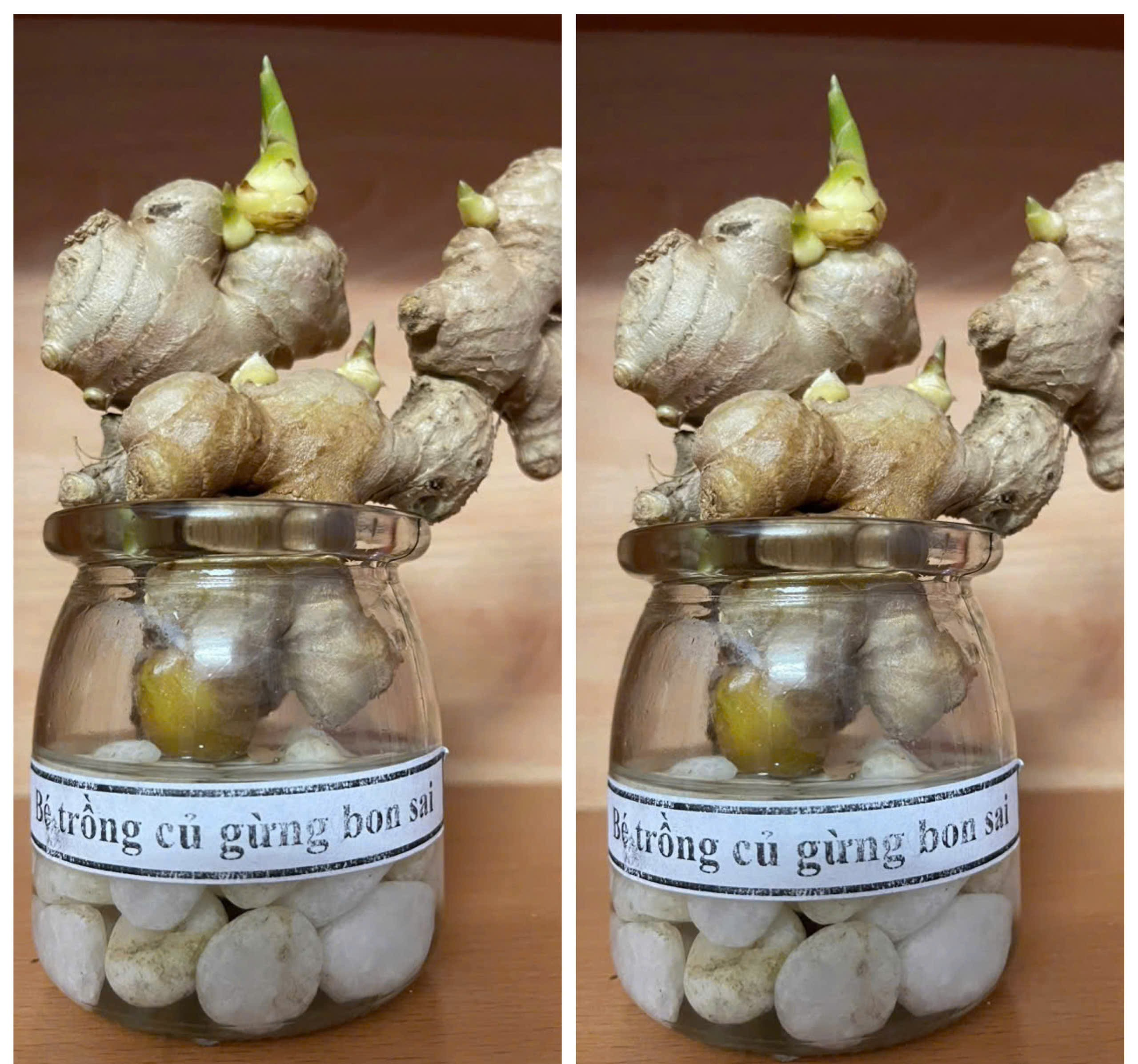 Những chiếc cốc thủy tinh, sỏi trắng, nước và củ gừng. Vậy là các con đã có những lọ gừng thật xinh xắn và đáng yêu.