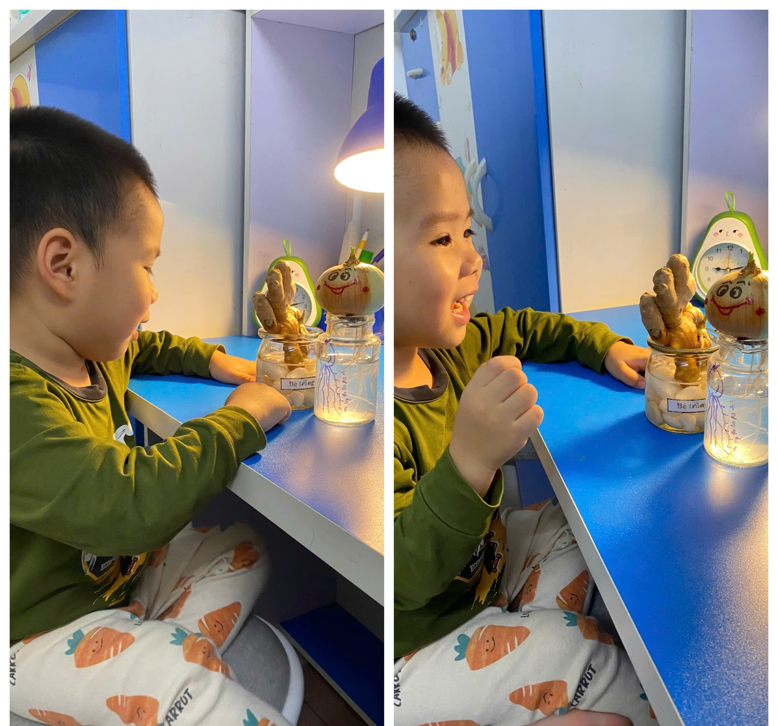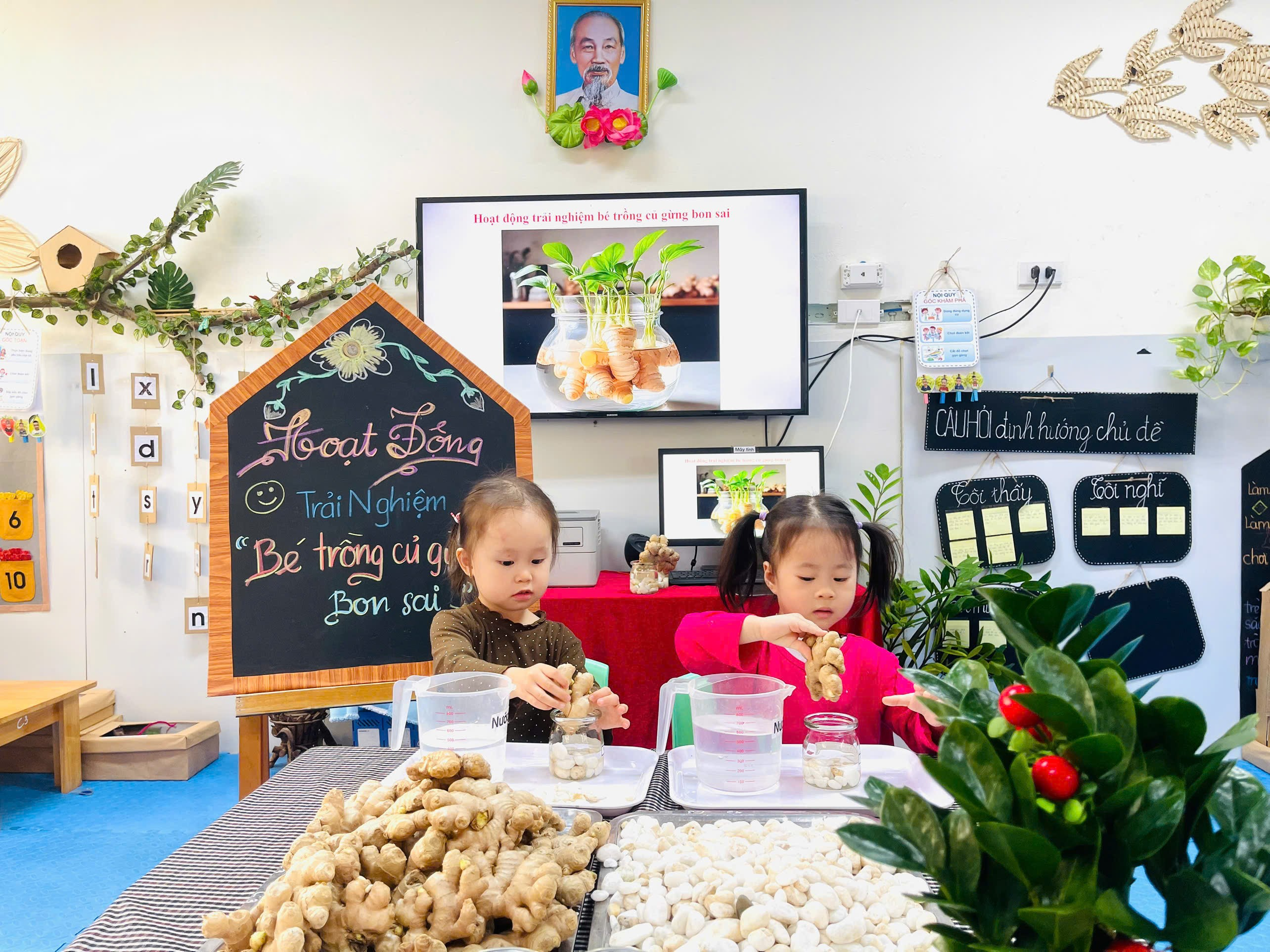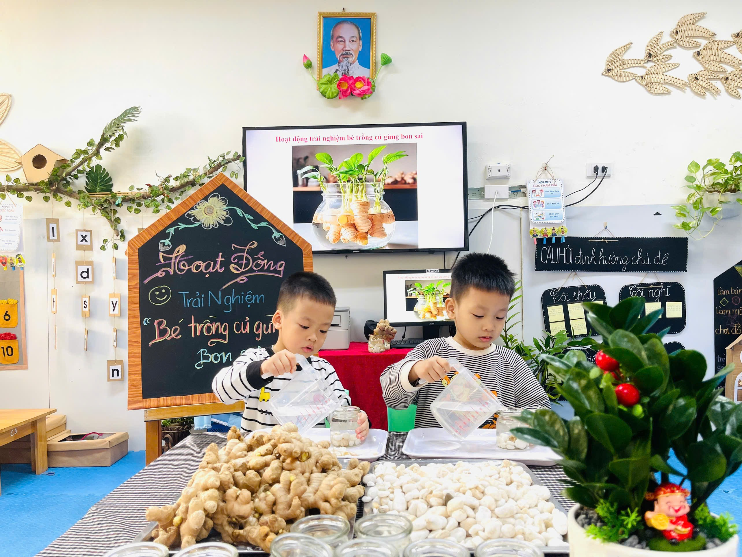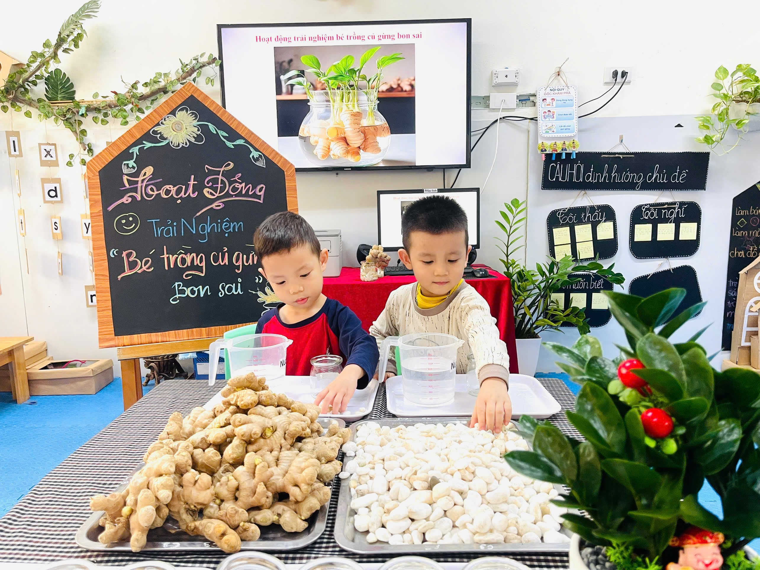 Những chiếc cốc thủy tinh, sỏi trắng, nước và củ gừng. Vậy là các con đã có những lọ gừng thật xinh xắn và đáng yêu.