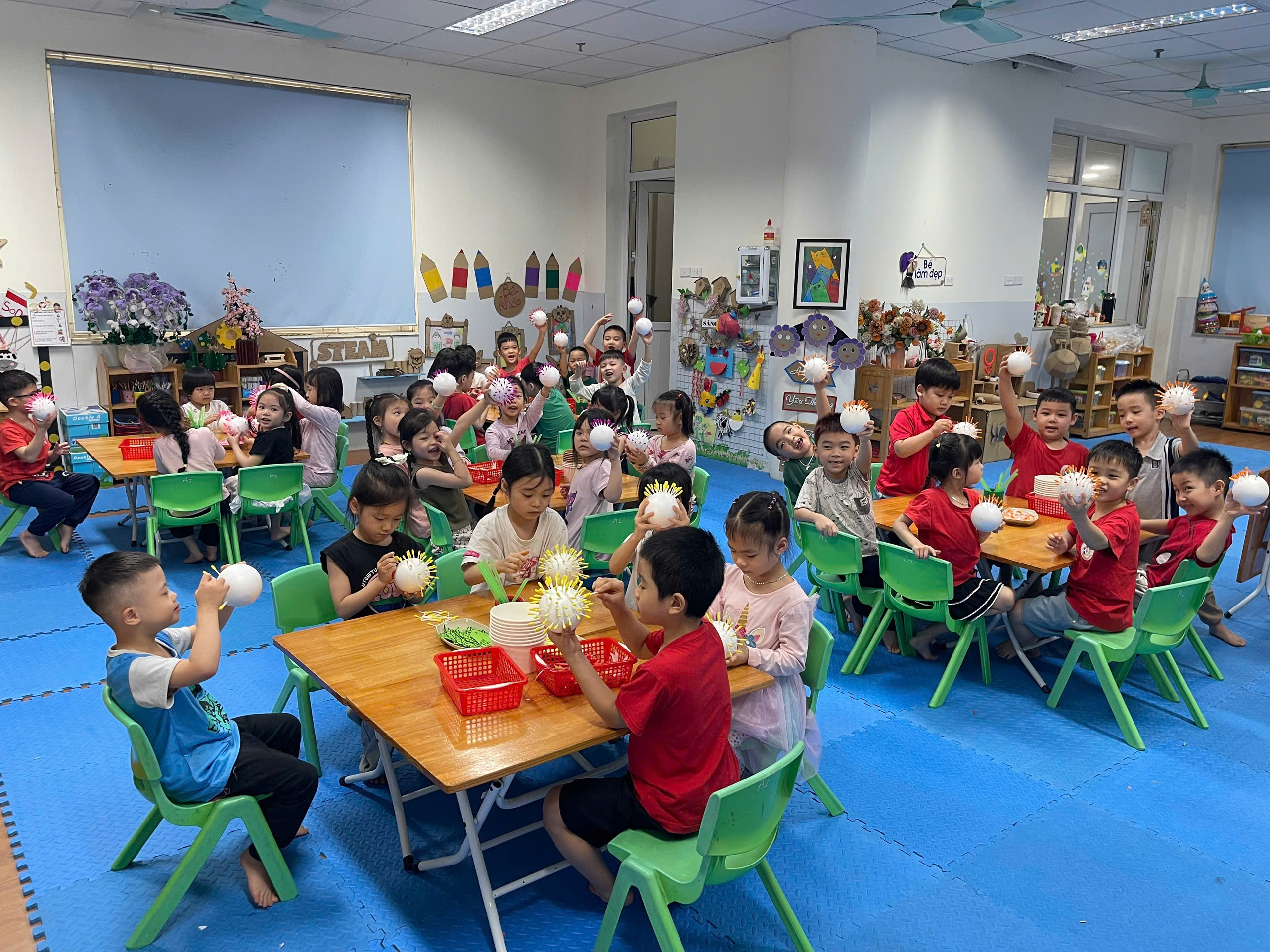 🌈 Buổi 2: Cả lớp hào hứng cắm từng que tăm bông vào quả cầu xốp. Đôi bàn tay bé xinh thoăn thoắt, tỉ mỉ để bông hoa dần tròn trịa, mềm mại và thật nổi bật.