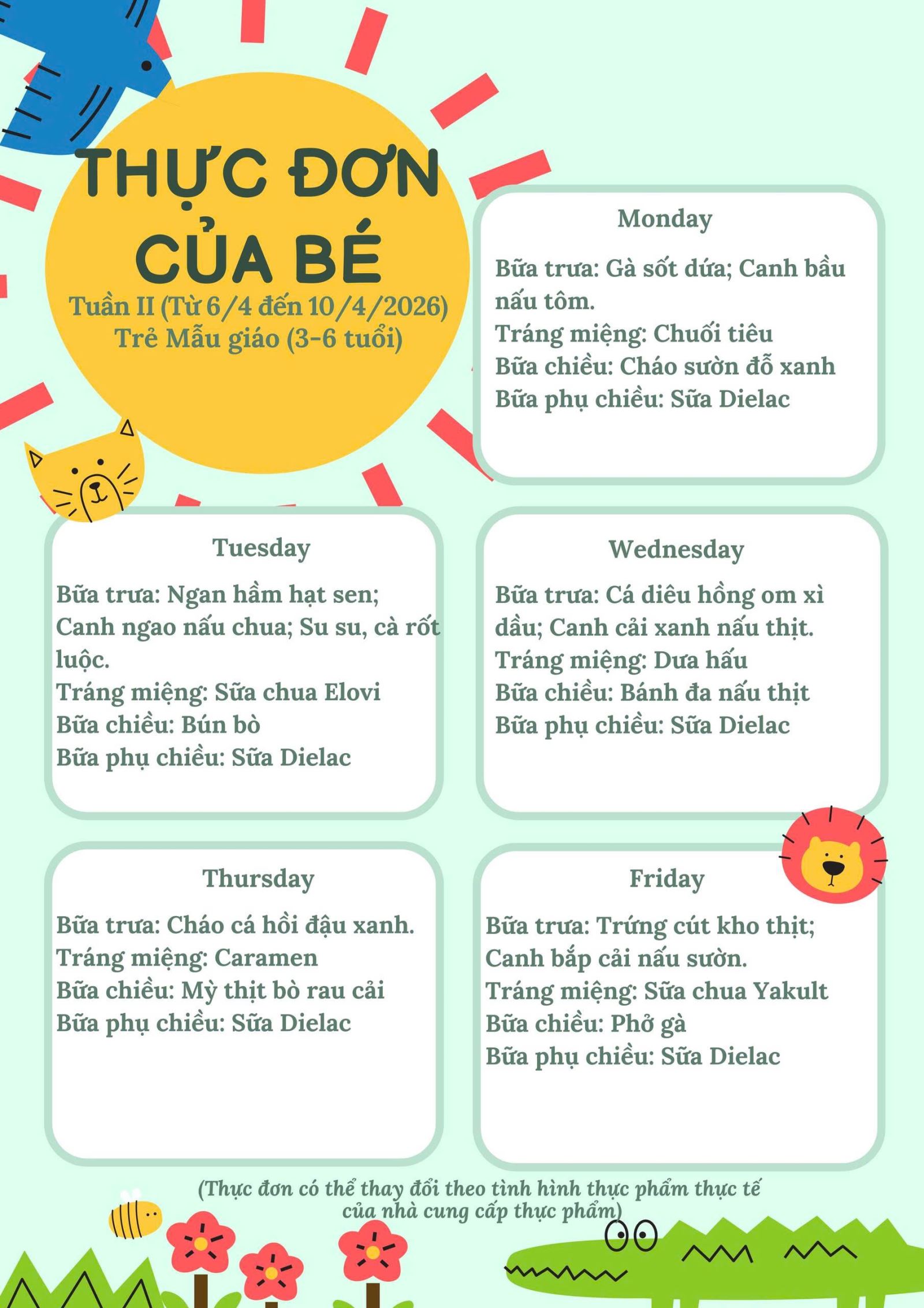 Thực đơn tuần II tháng 4/2026 của trẻ Mẫu giáo (trẻ 3-6 tuổi)