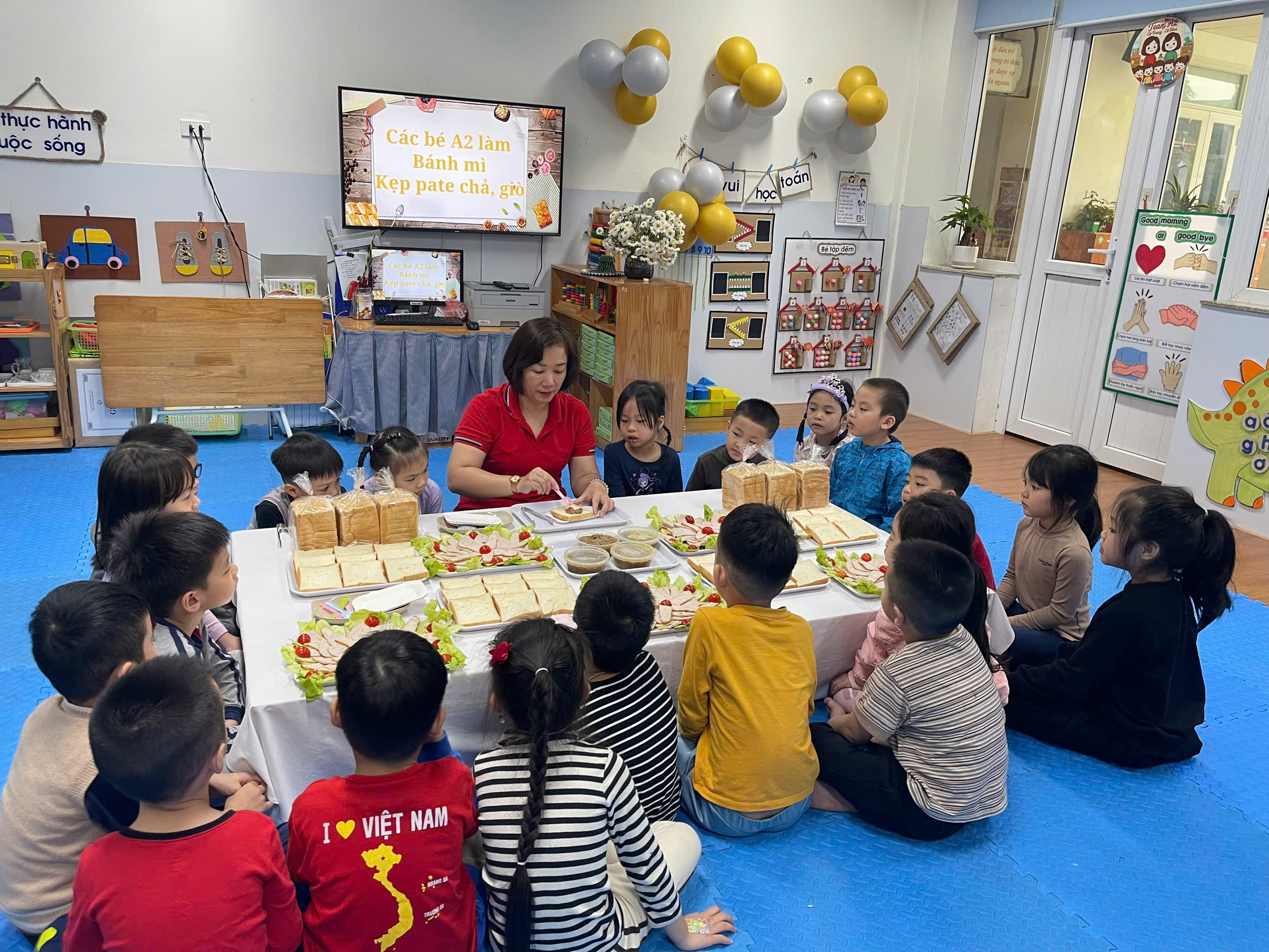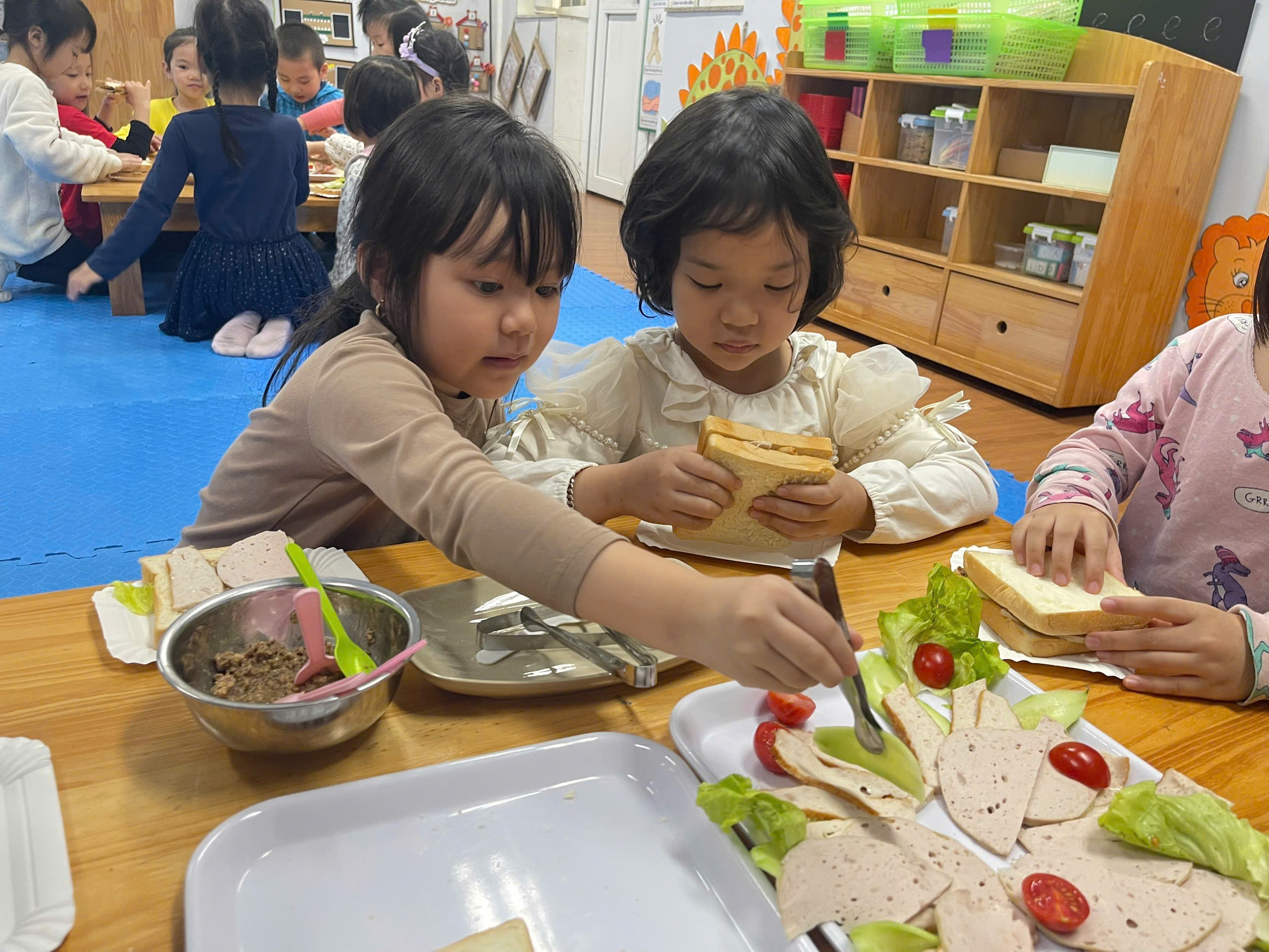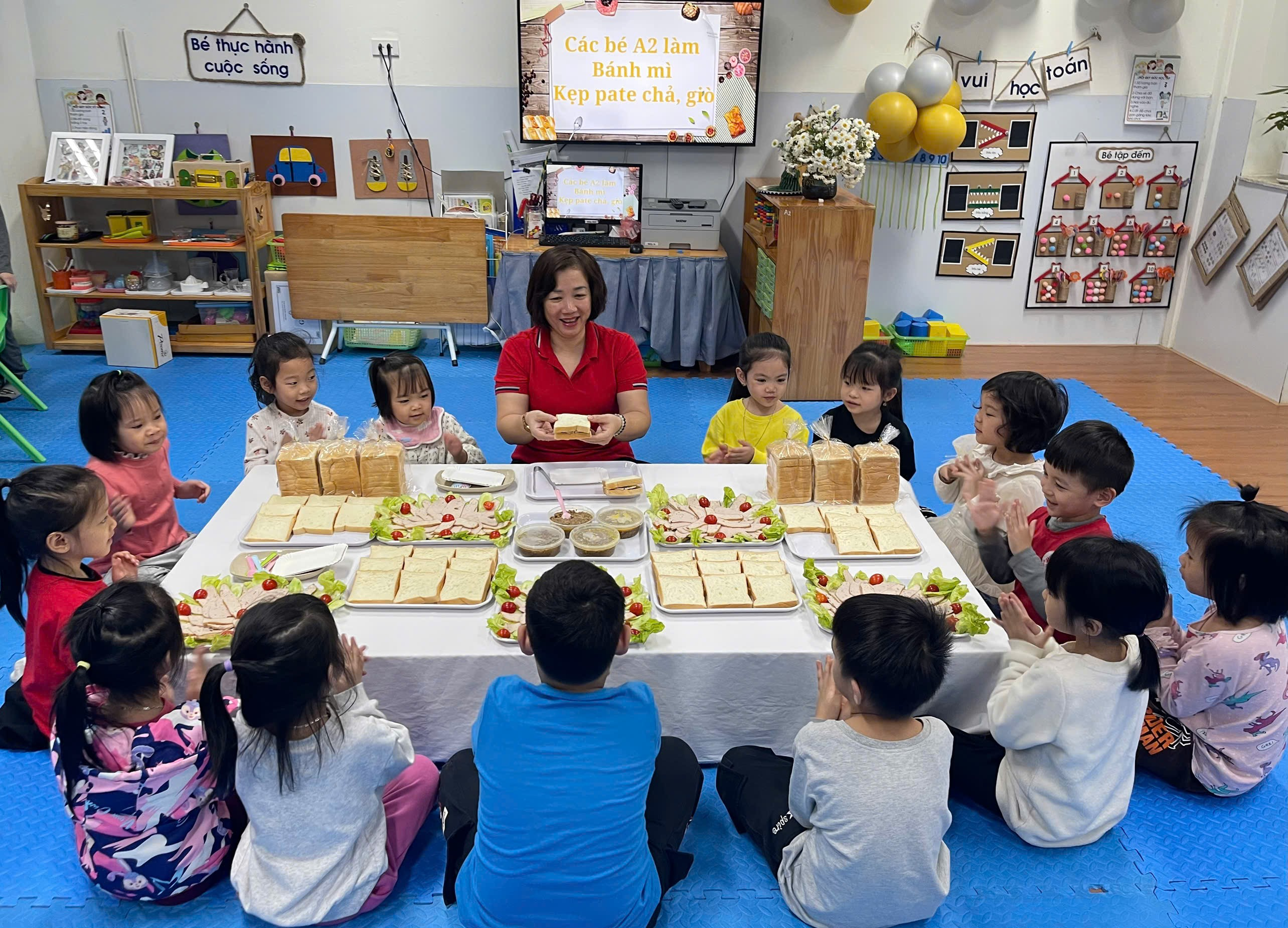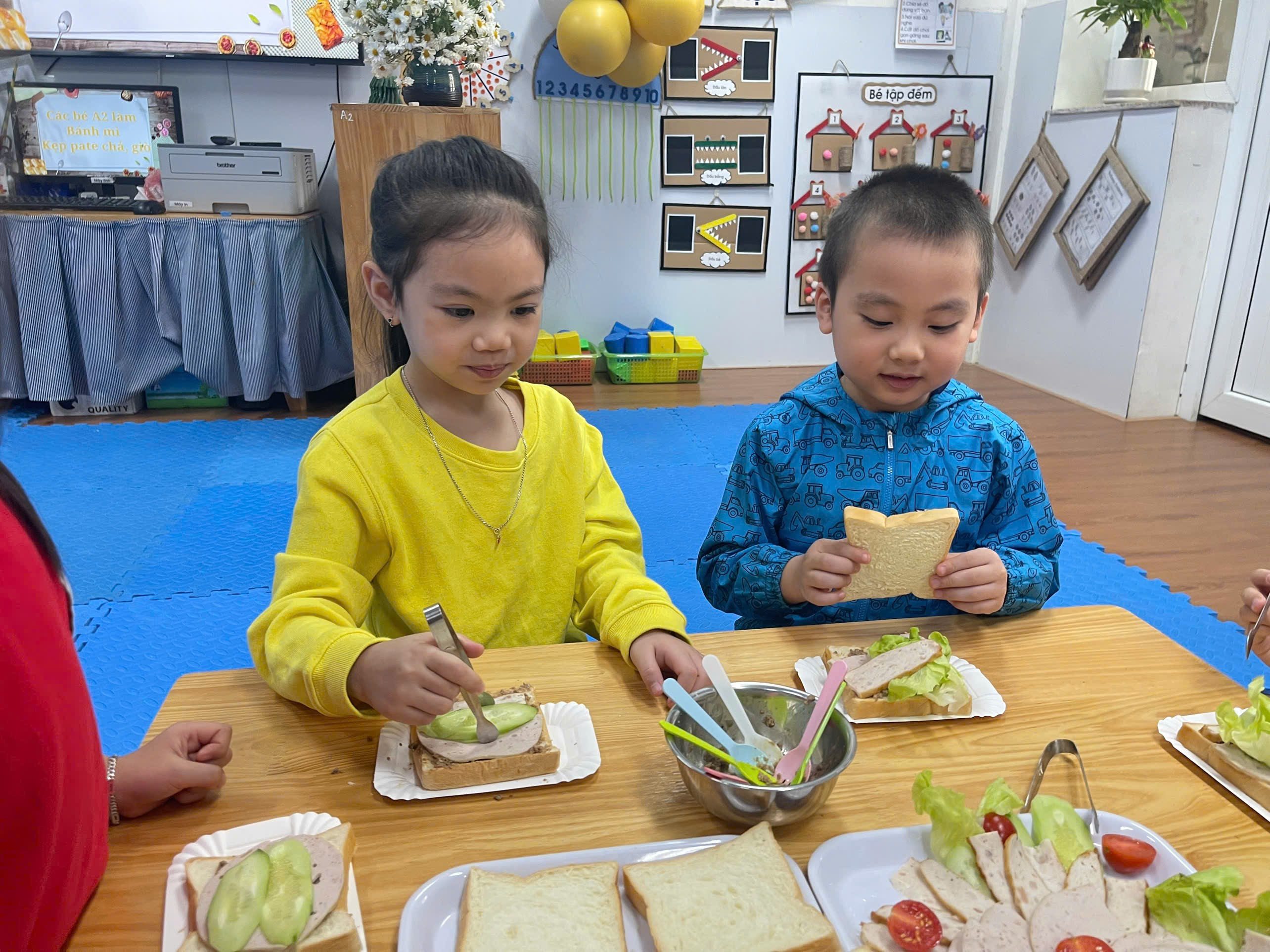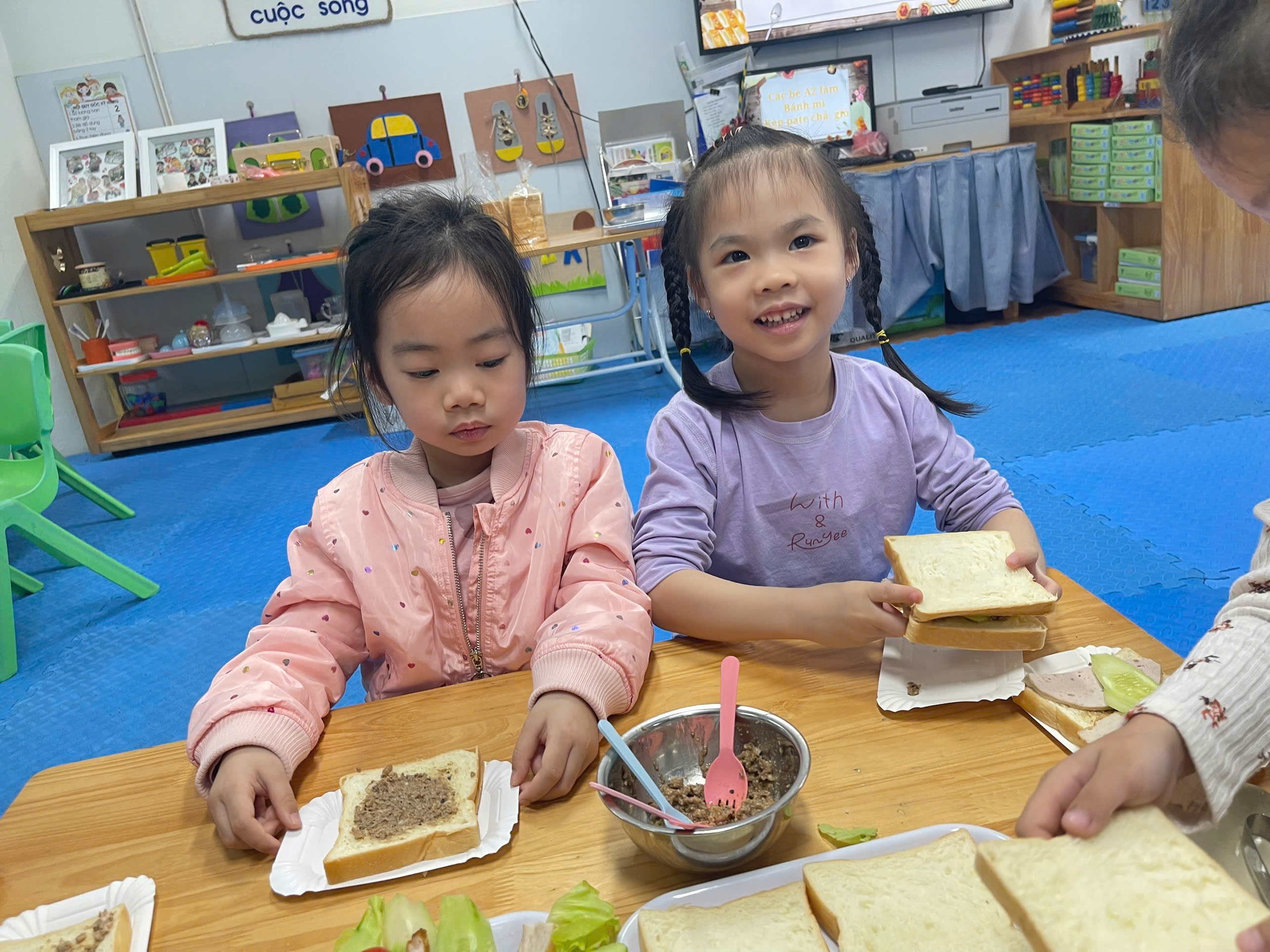 Các bạn lớp MGL A2 được trải nghiệm hoạt động nội trợ bằng việc làm món bánh mì kẹp pate – chả,… thêm chút rau thơm, dưa chuột, cà chua bi các bé rất hào hứng và phấn khởi khi được tự trải nghiệm và chế biến món ăn cho chính mình.