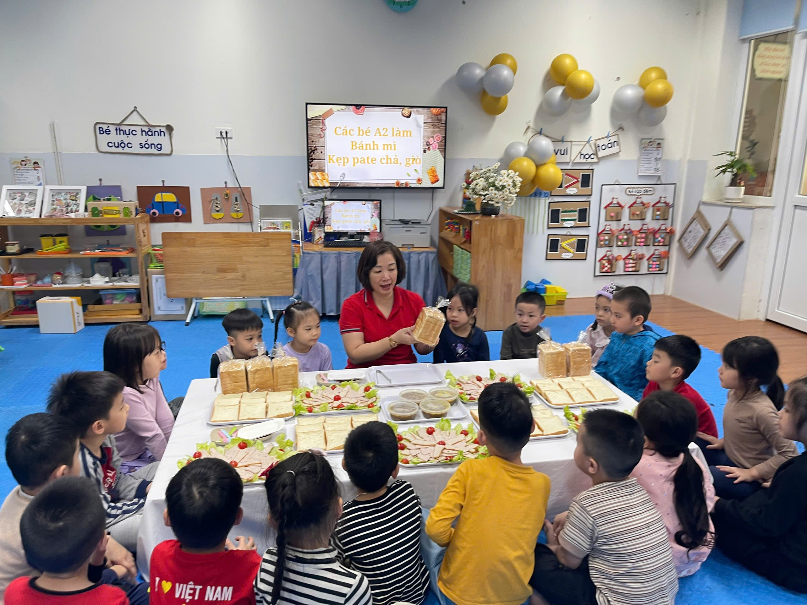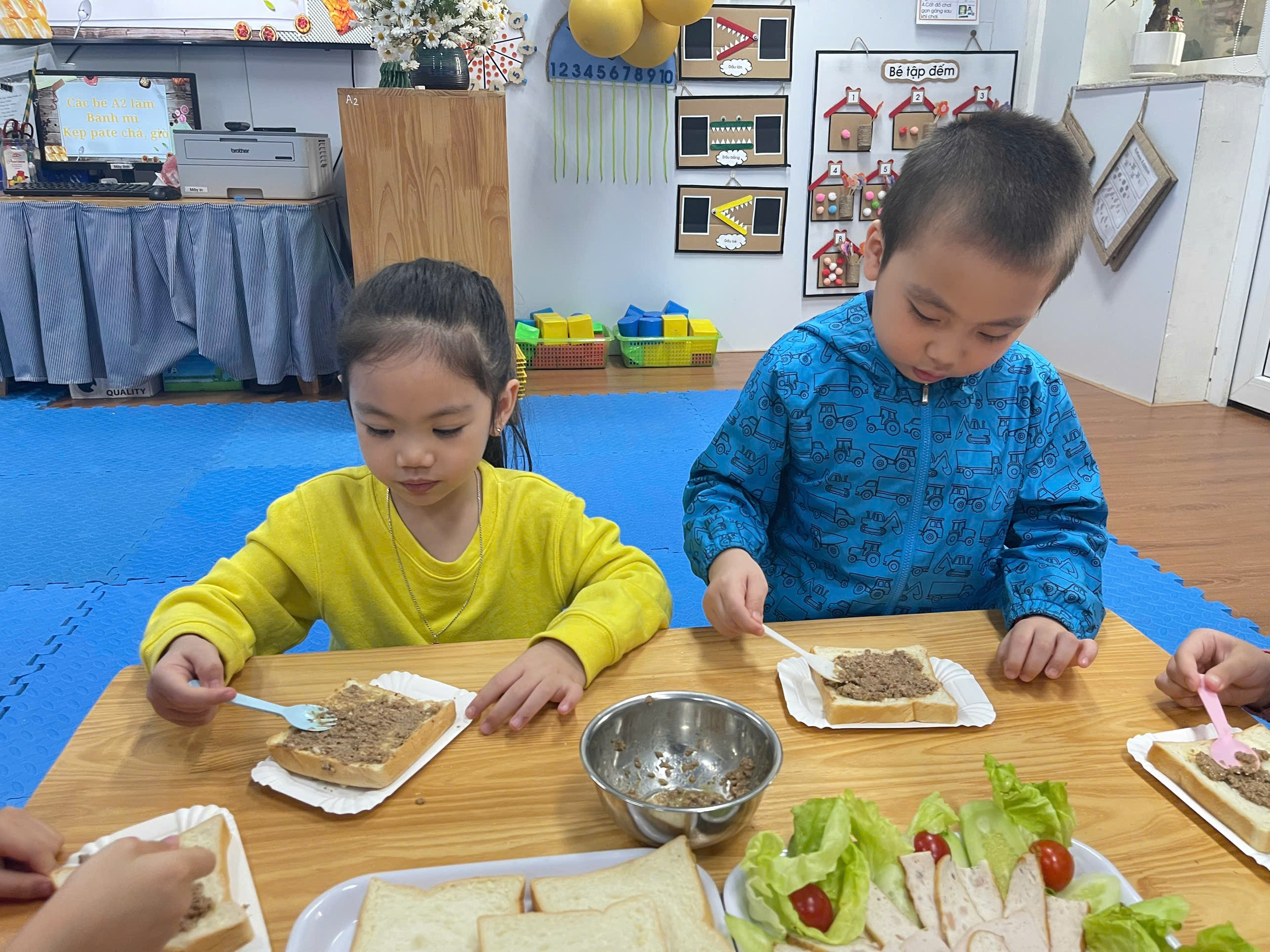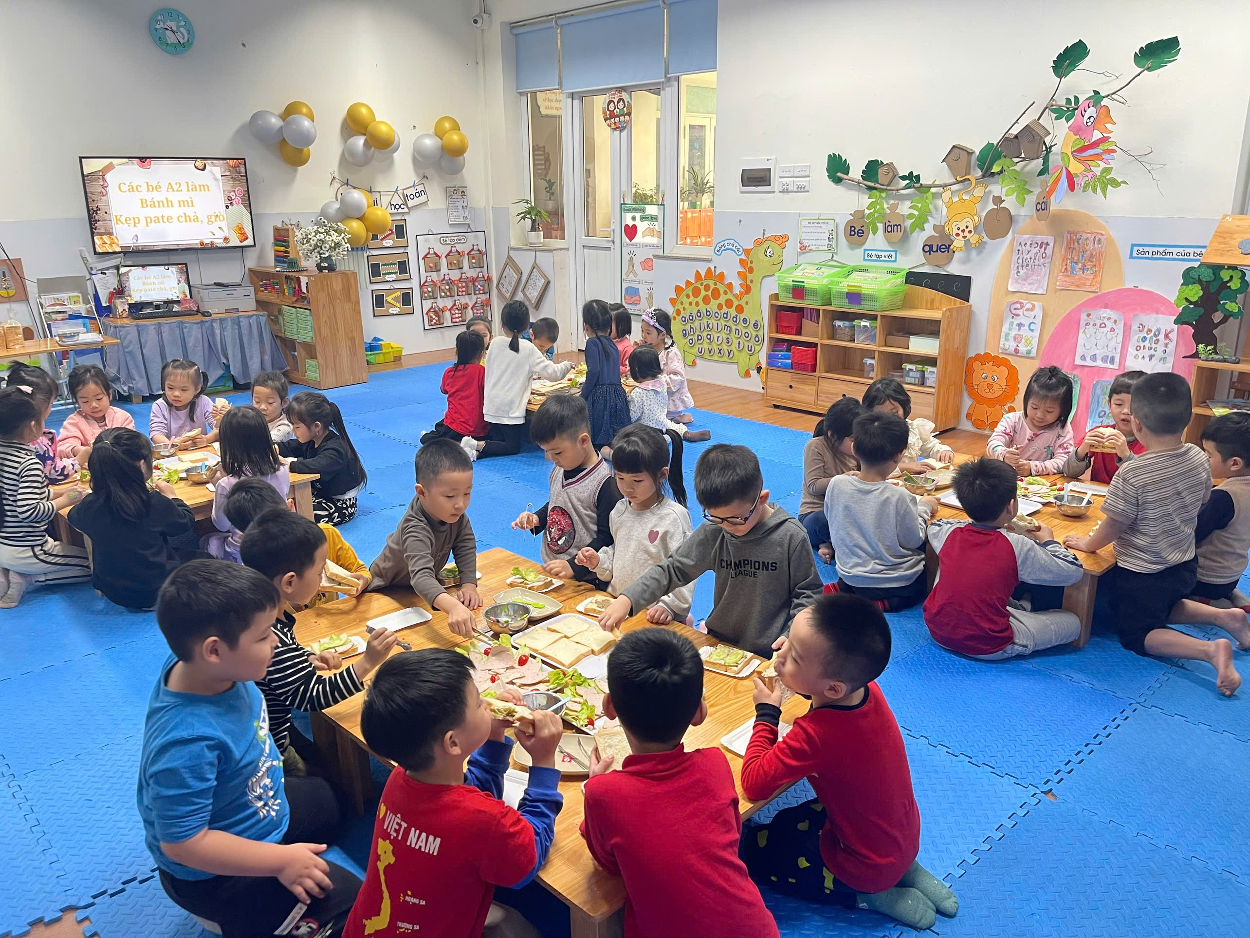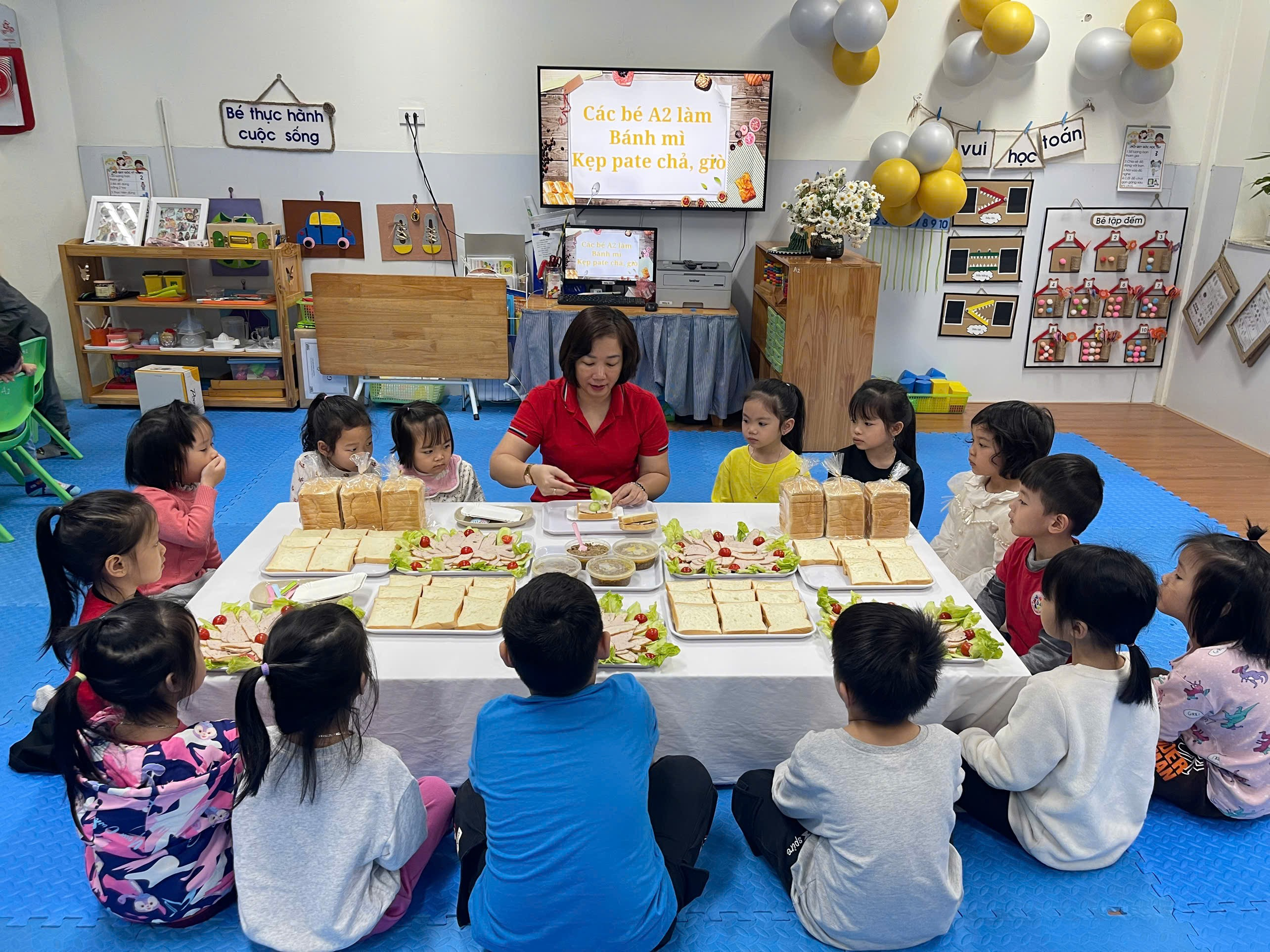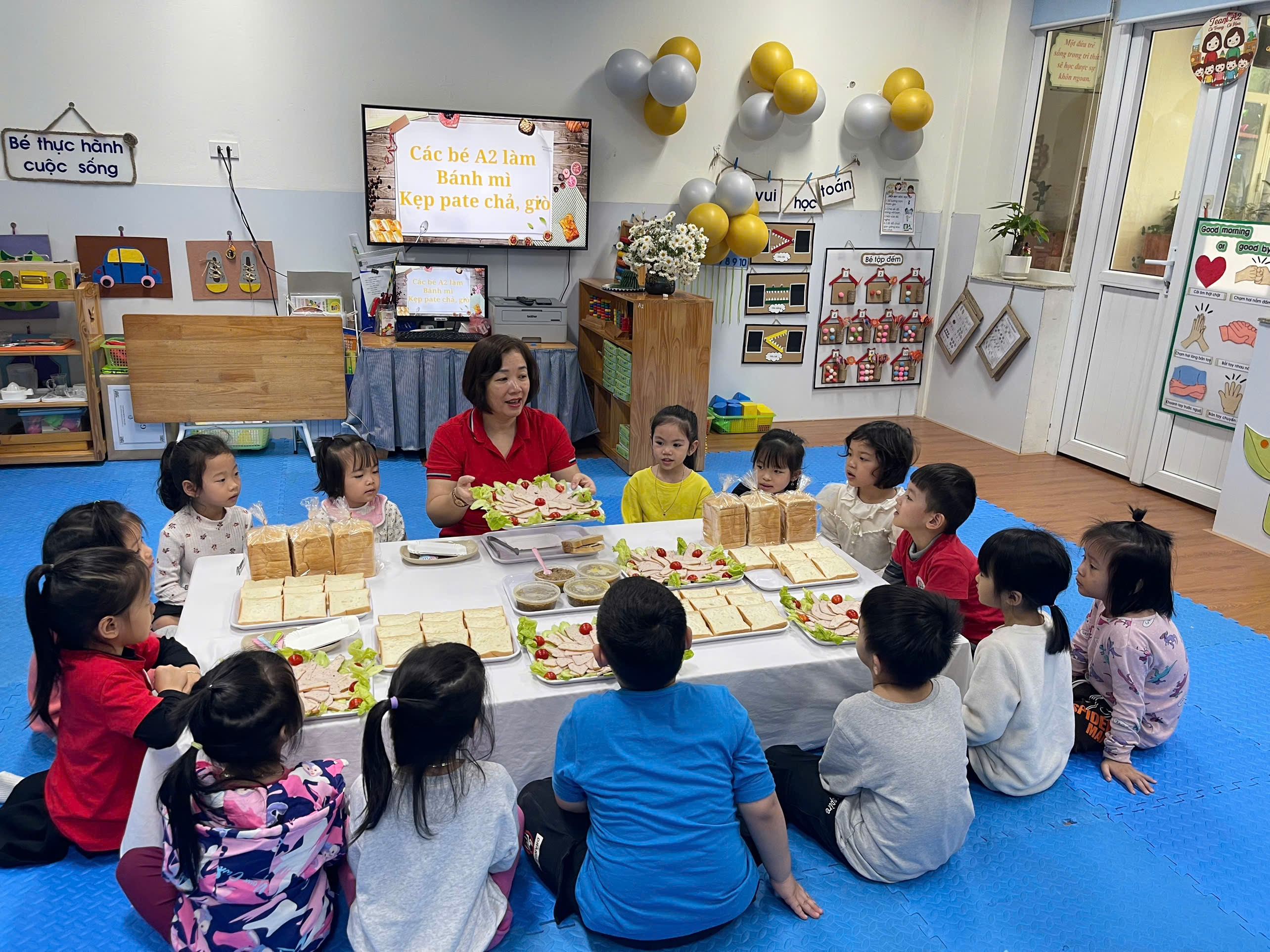 Các bạn lớp MGL A2 được trải nghiệm hoạt động nội trợ bằng việc làm món bánh mì kẹp pate – chả,… thêm chút rau thơm, dưa chuột, cà chua bi các bé rất hào hứng và phấn khởi khi được tự trải nghiệm và chế biến món ăn cho chính mình.