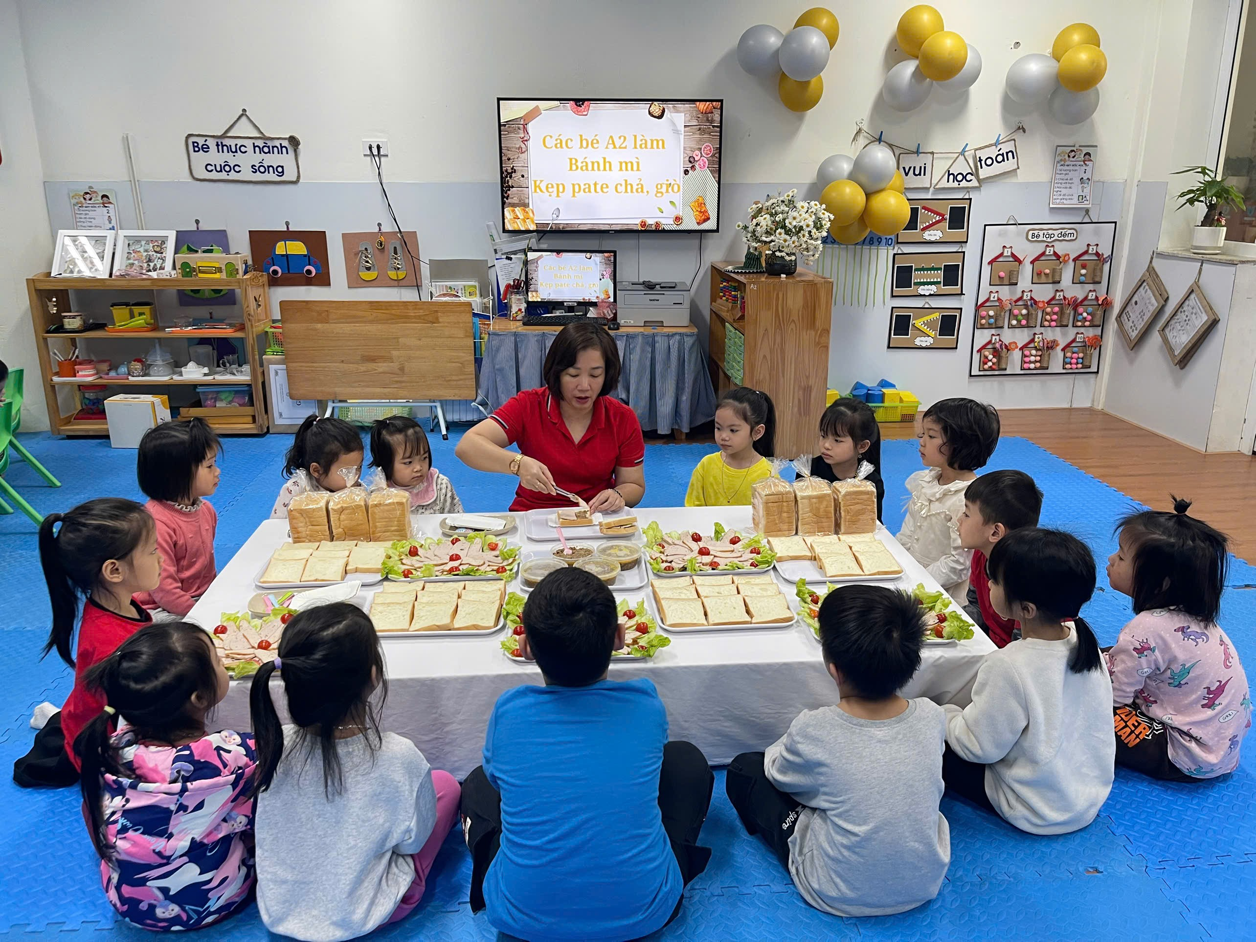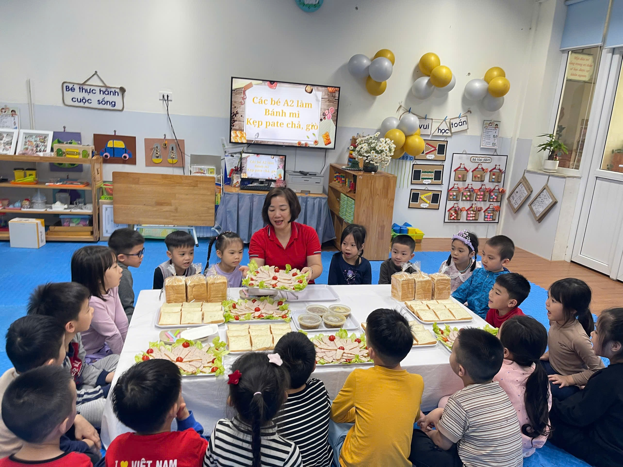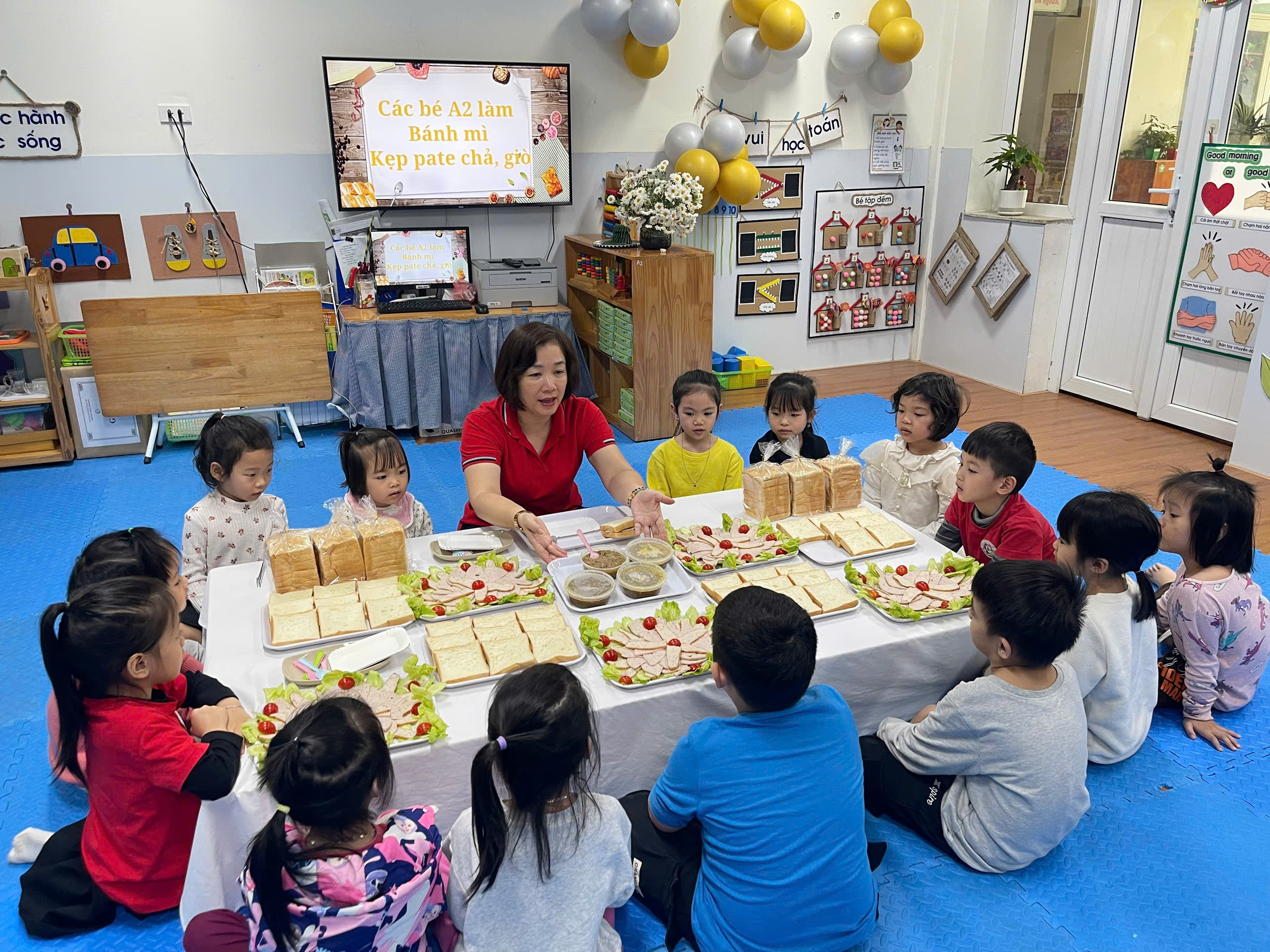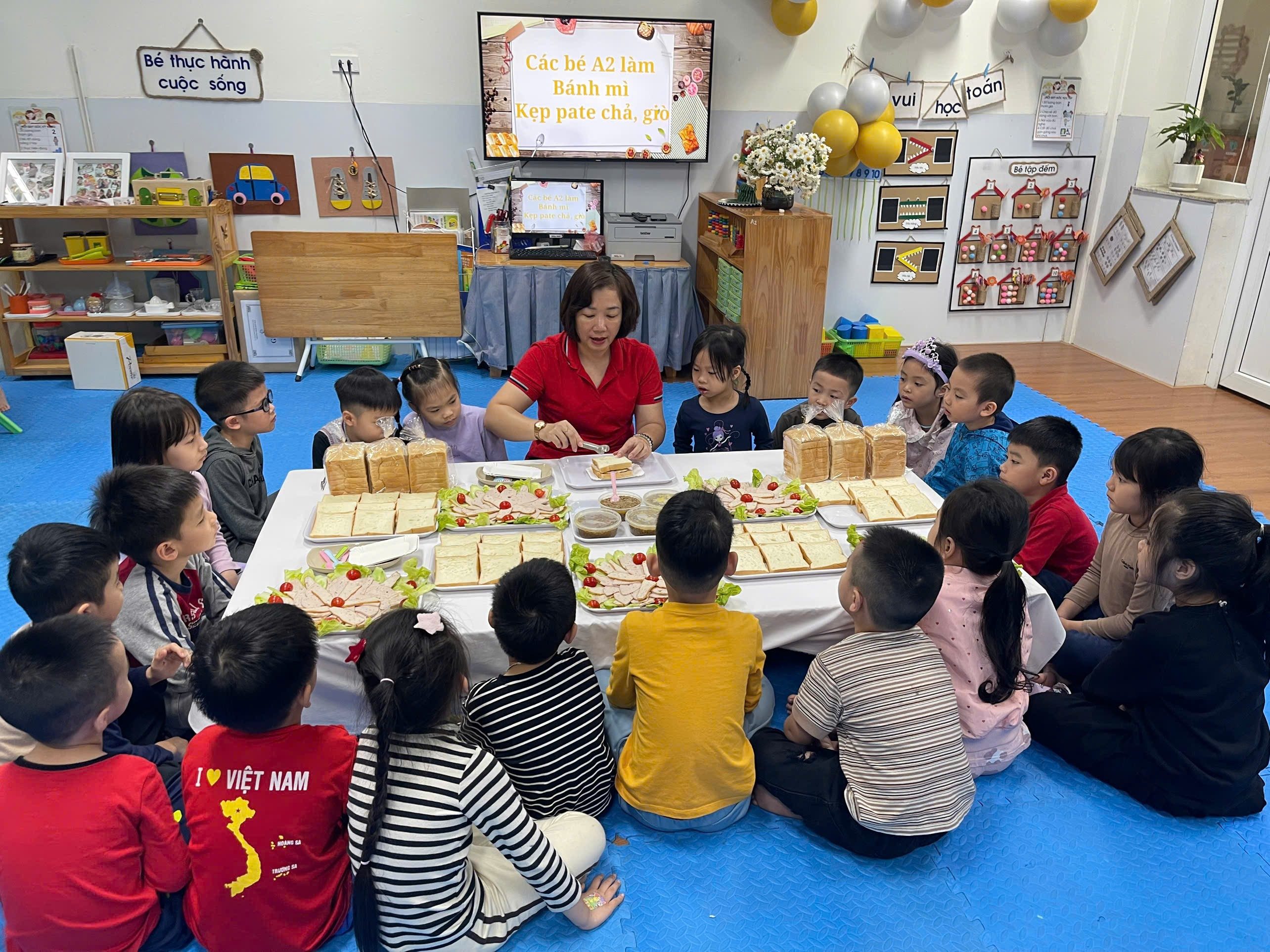 Các bạn lớp MGL A2 được trải nghiệm hoạt động nội trợ bằng việc làm món bánh mì kẹp pate – chả,… thêm chút rau thơm, dưa chuột, cà chua bi các bé rất hào hứng và phấn khởi khi được tự trải nghiệm và chế biến món ăn cho chính mình.