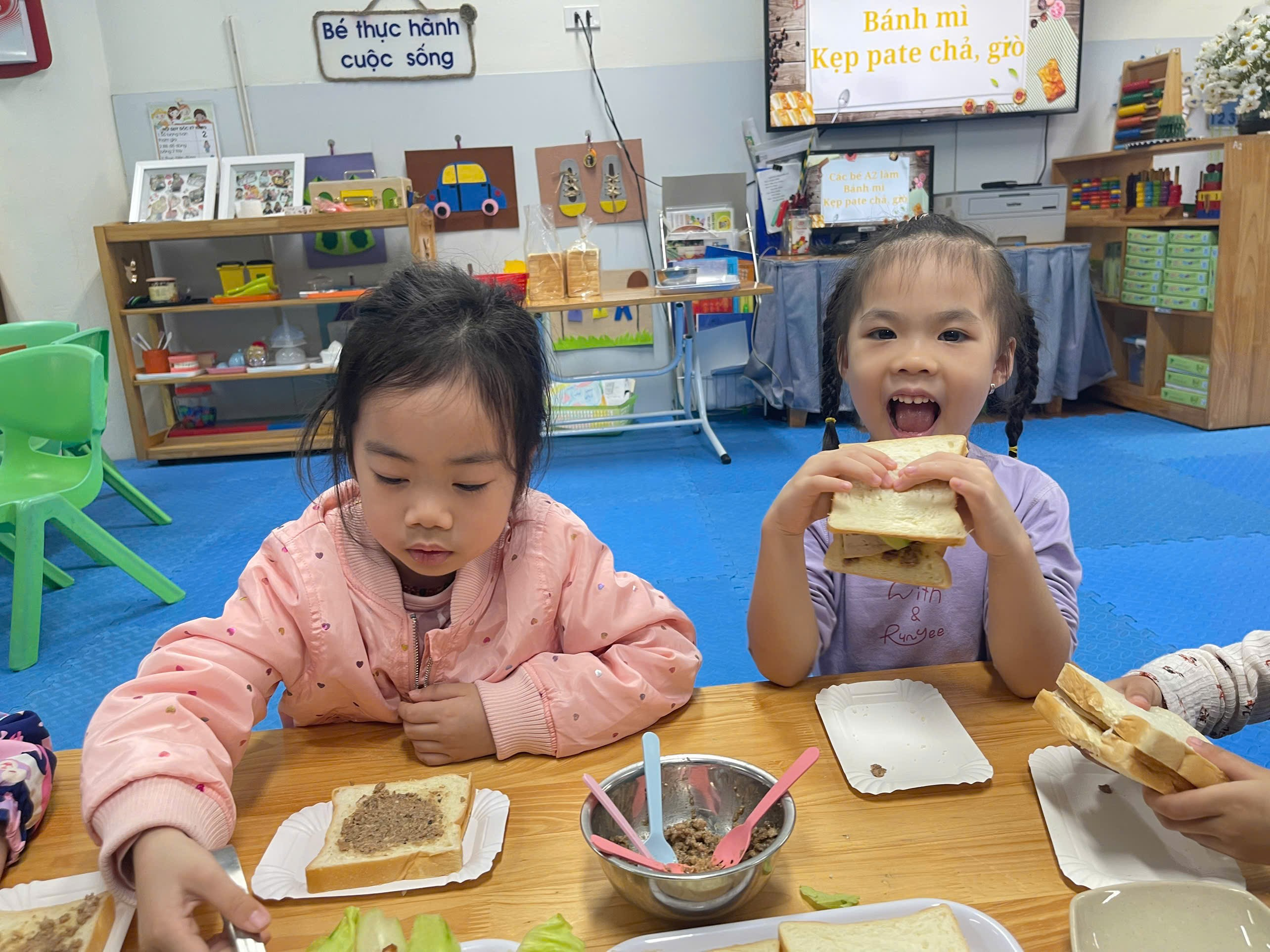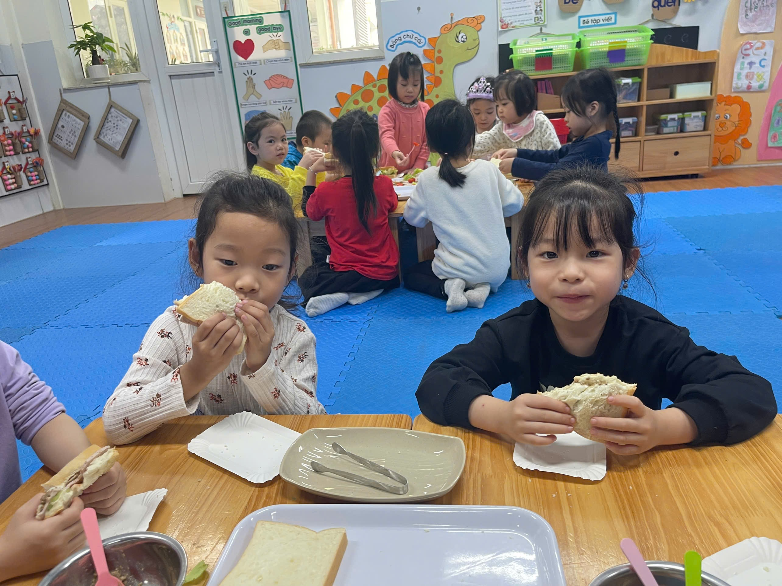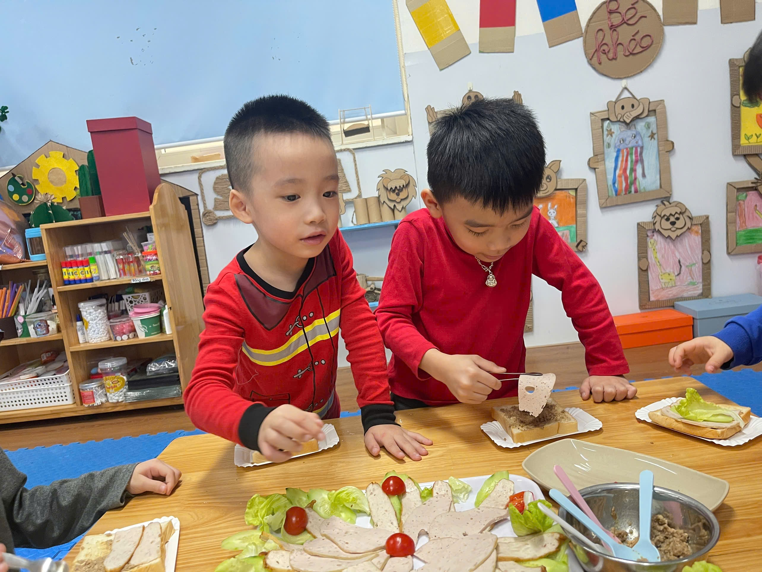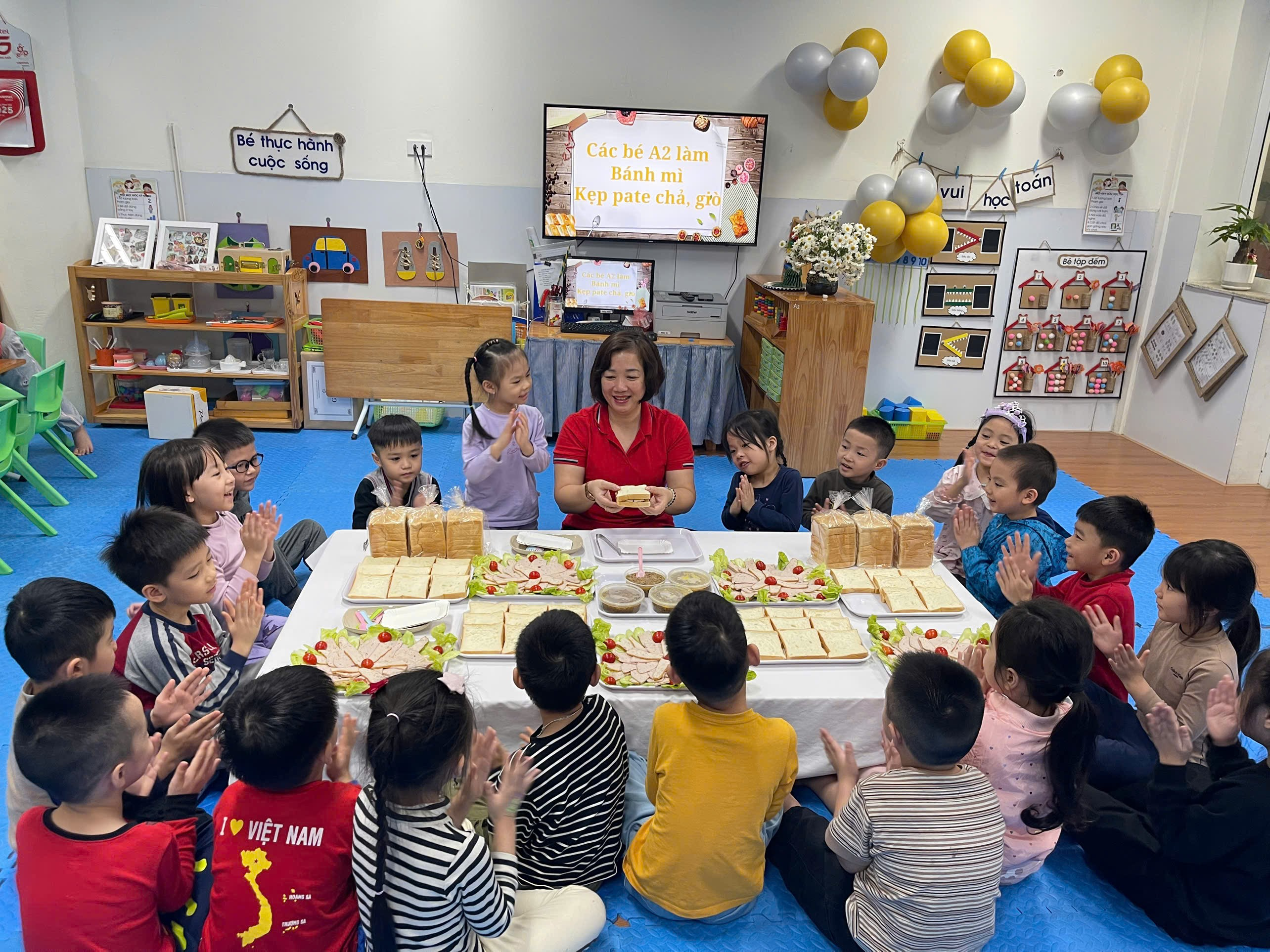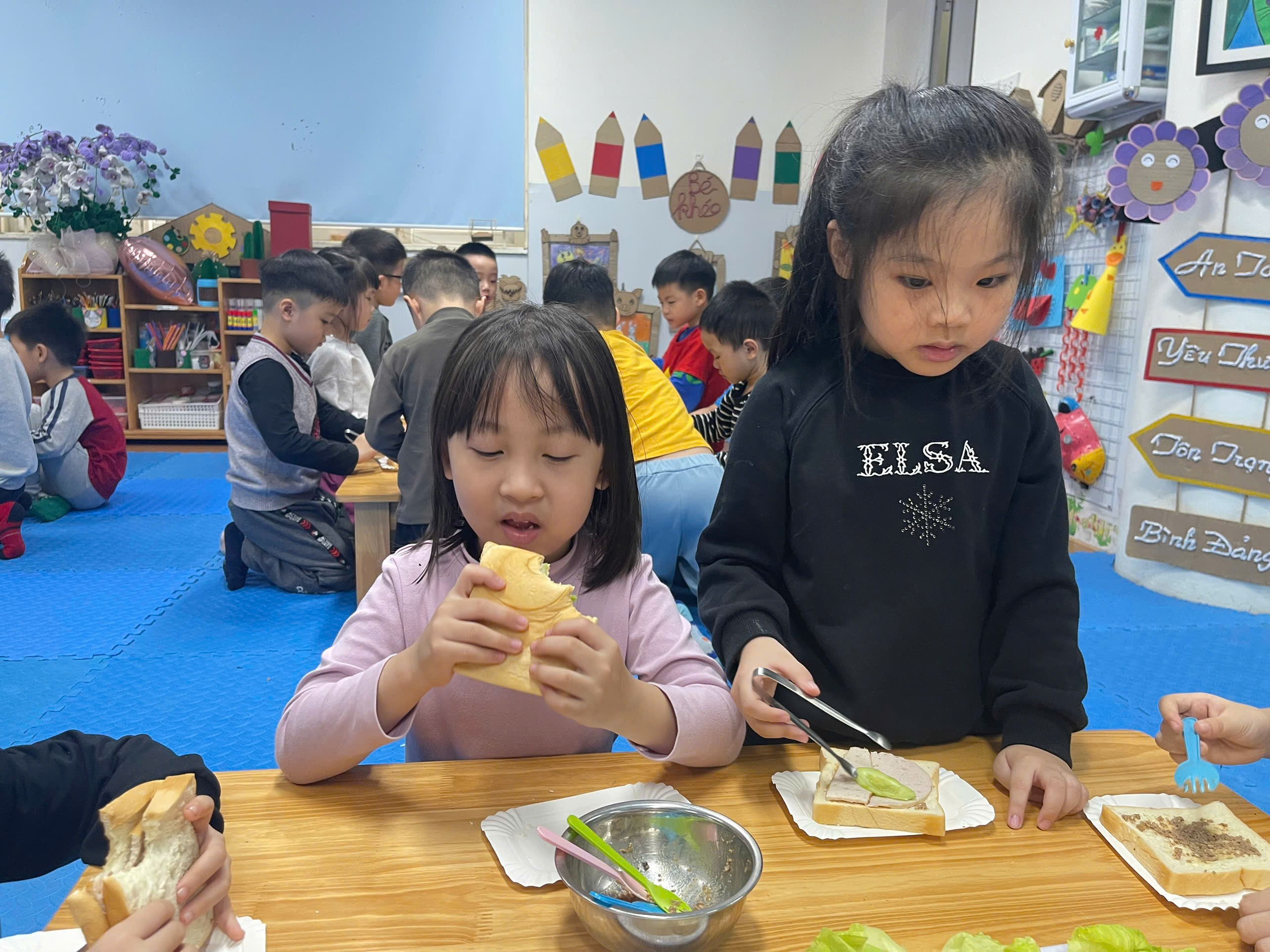 Các bạn lớp MGL A2 được trải nghiệm hoạt động nội trợ bằng việc làm món bánh mì kẹp pate – chả,… thêm chút rau thơm, dưa chuột, cà chua bi các bé rất hào hứng và phấn khởi khi được tự trải nghiệm và chế biến món ăn cho chính mình.