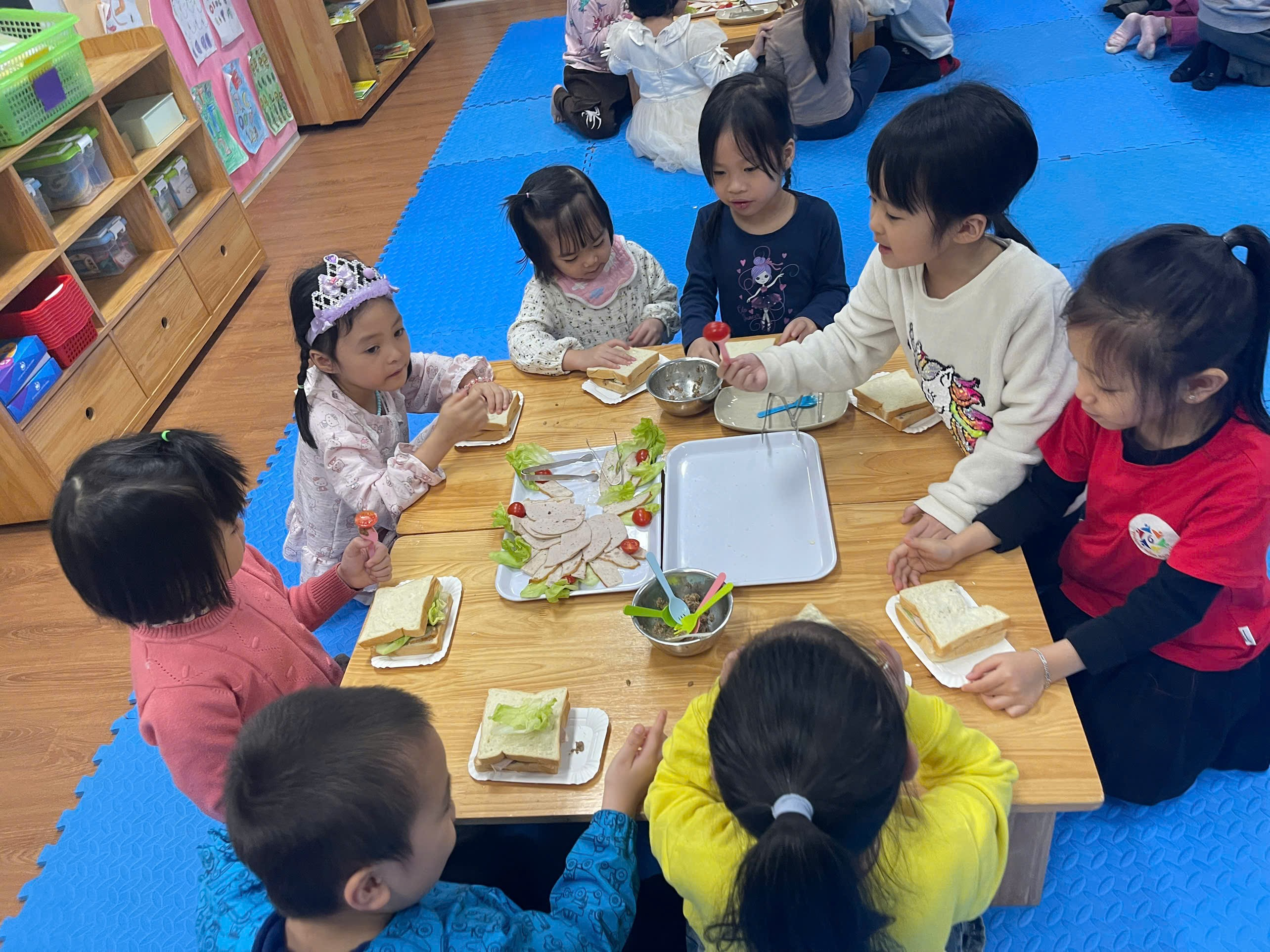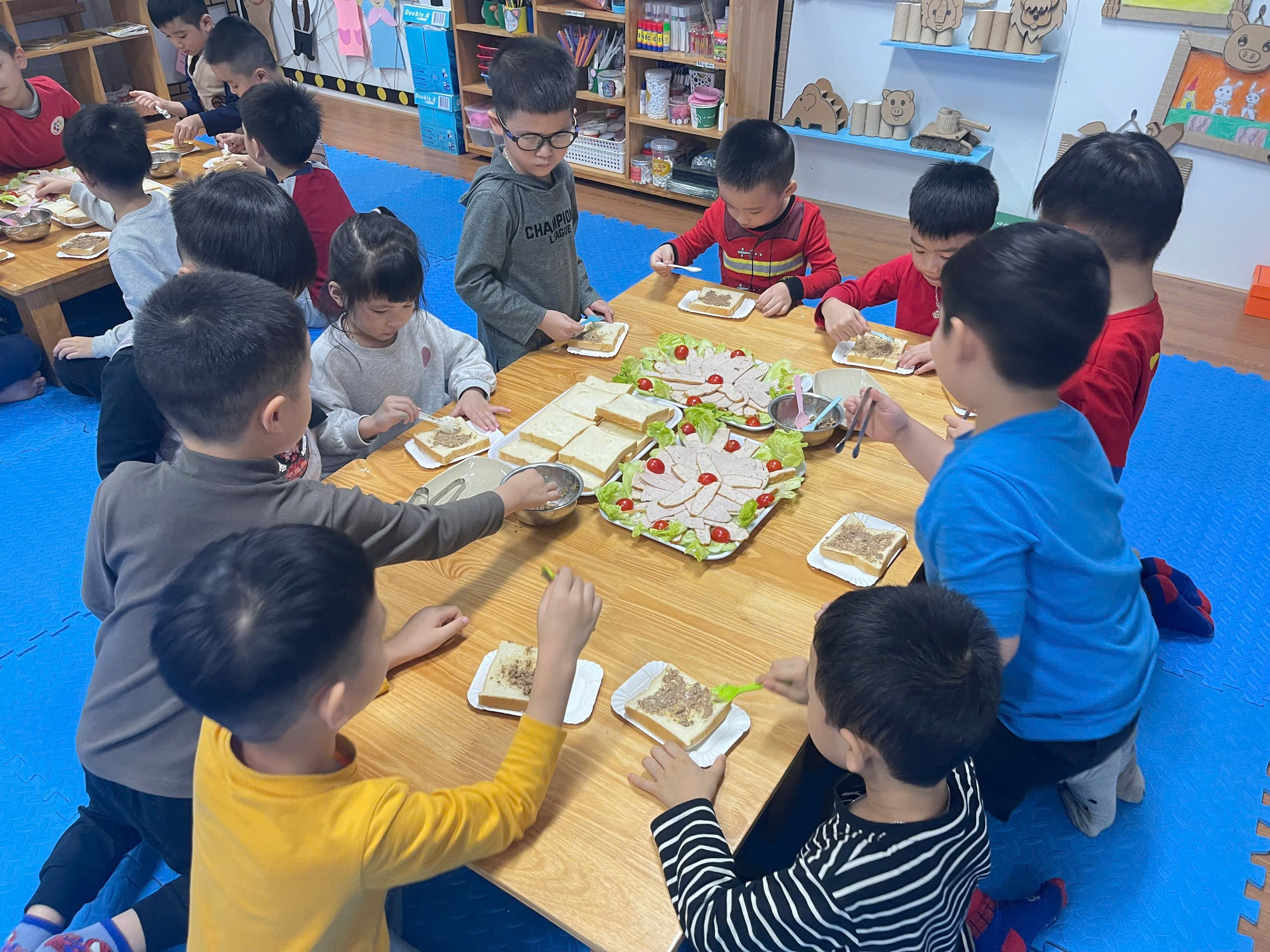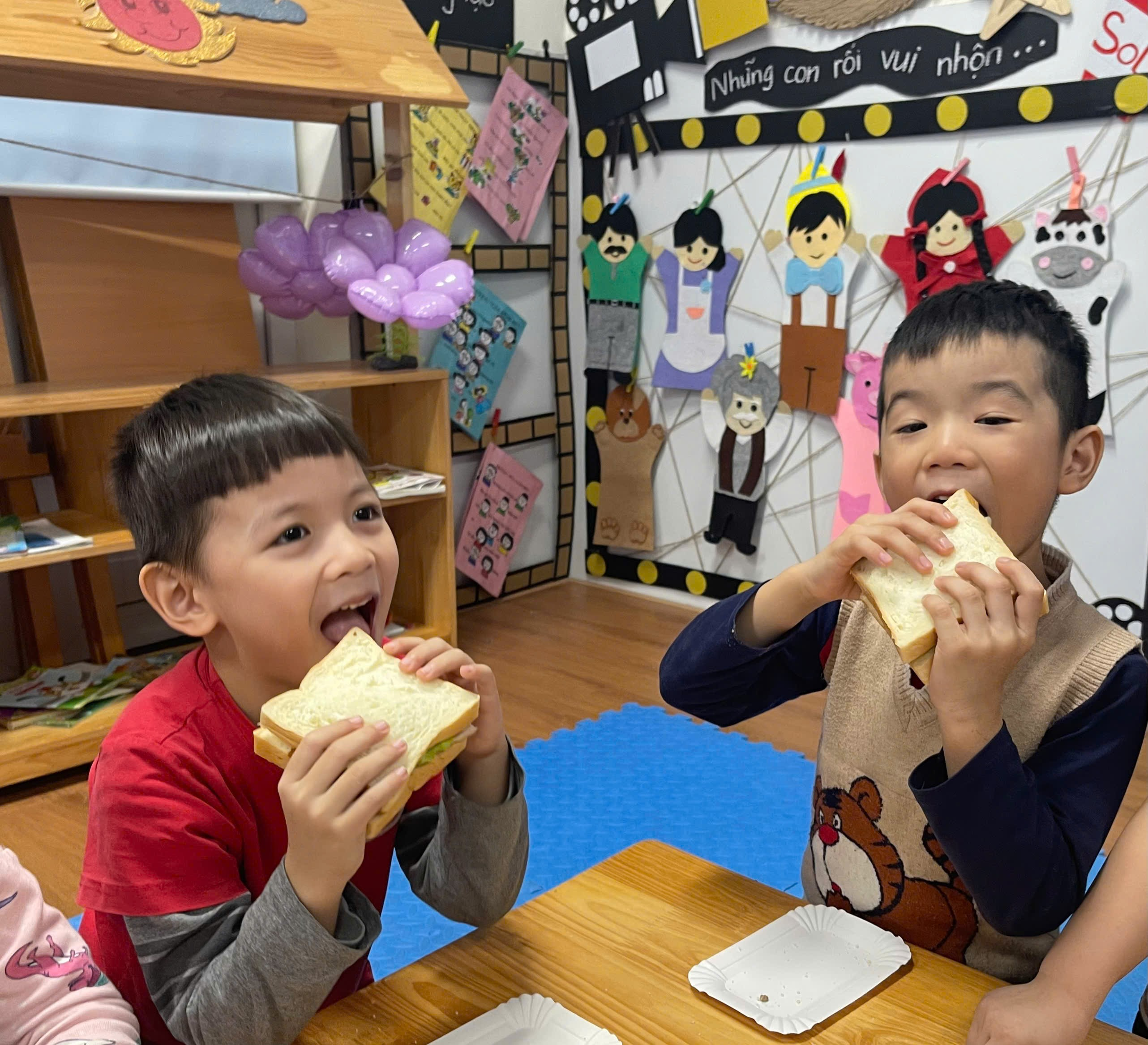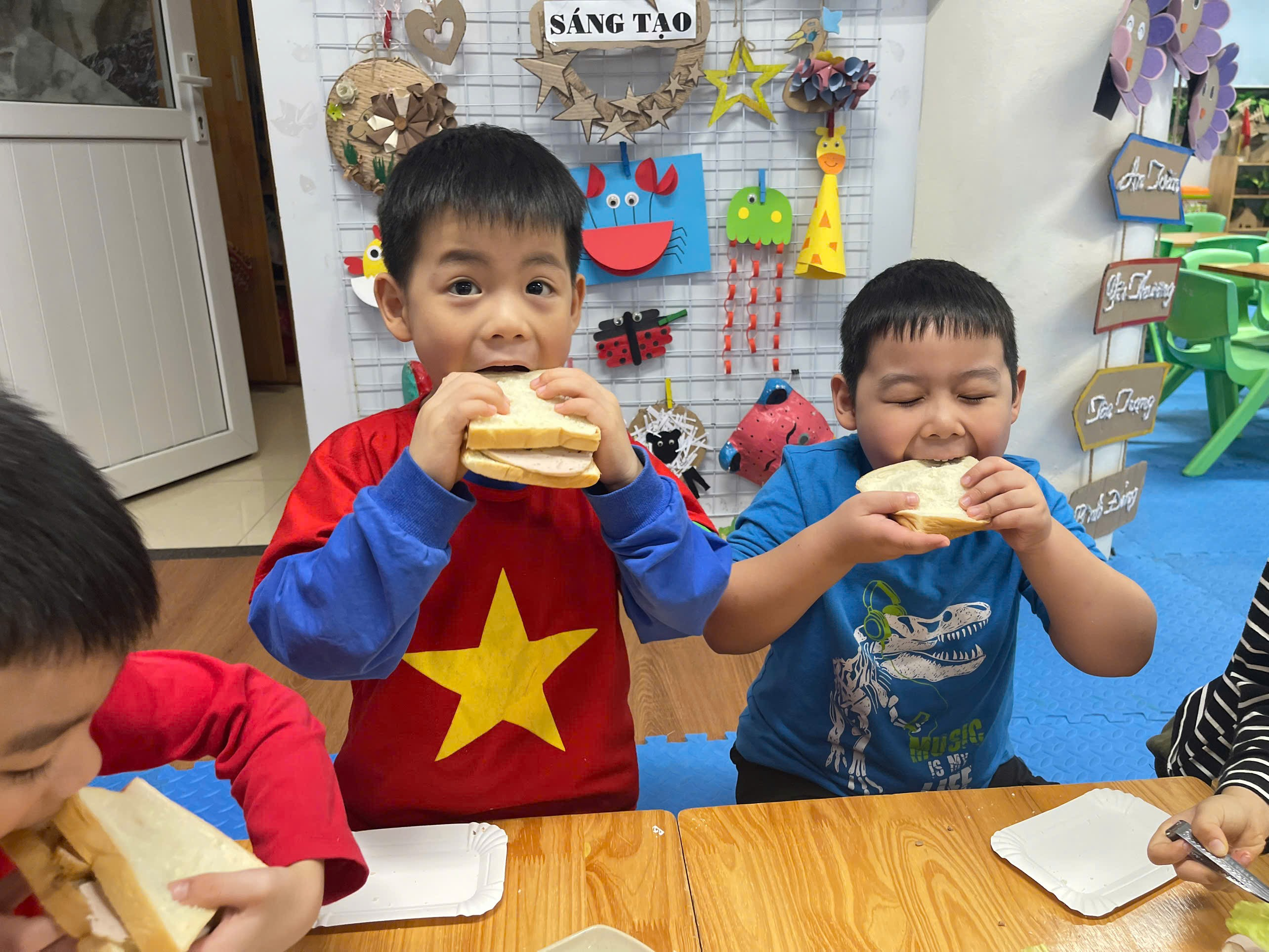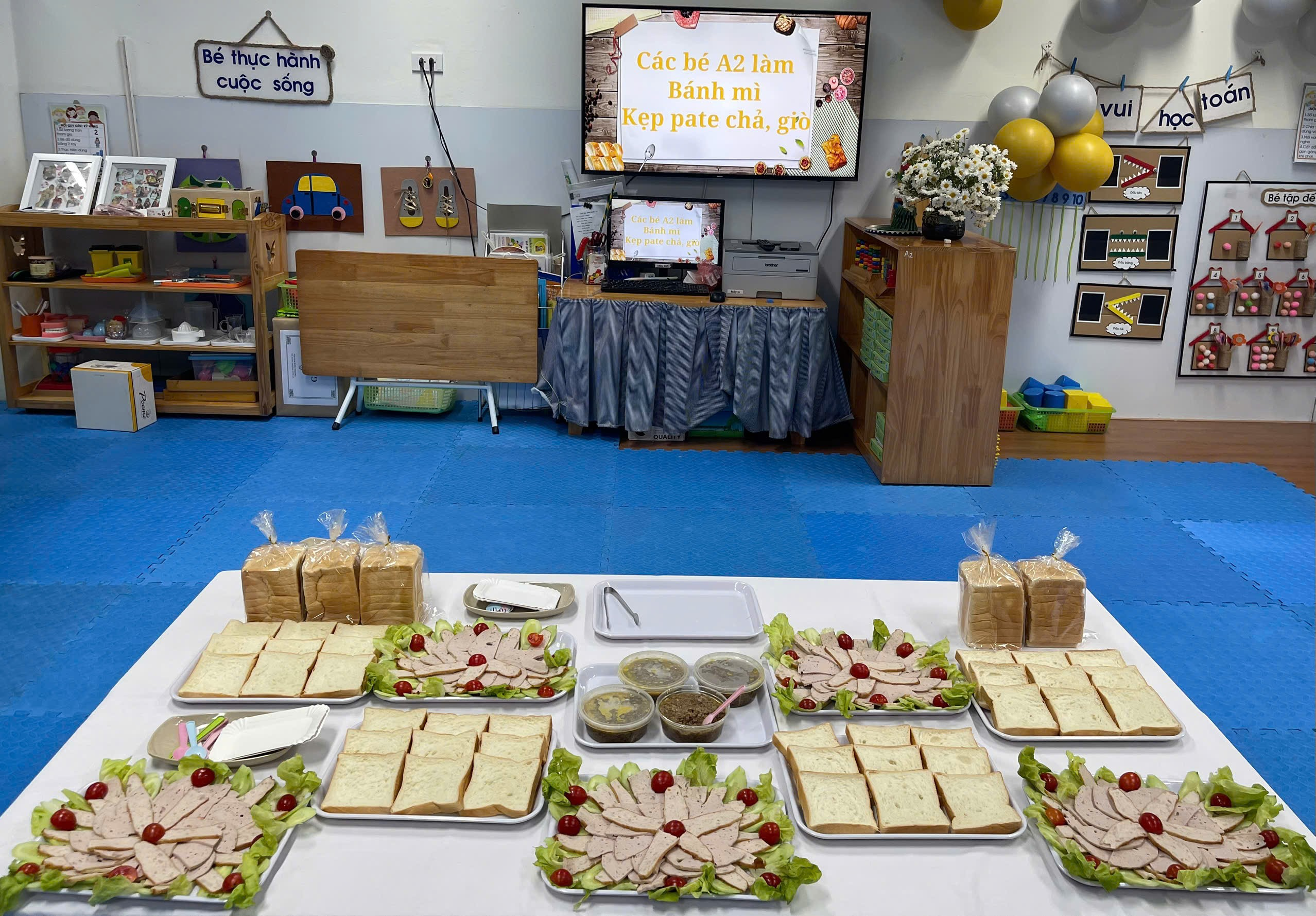Các bạn lớp MGL A2 được trải nghiệm hoạt động nội trợ bằng việc làm món bánh mì kẹp pate – chả,… thêm chút rau thơm, dưa chuột, cà chua bi các bé rất hào hứng và phấn khởi khi được tự trải nghiệm và chế biến món ăn cho chính mình.