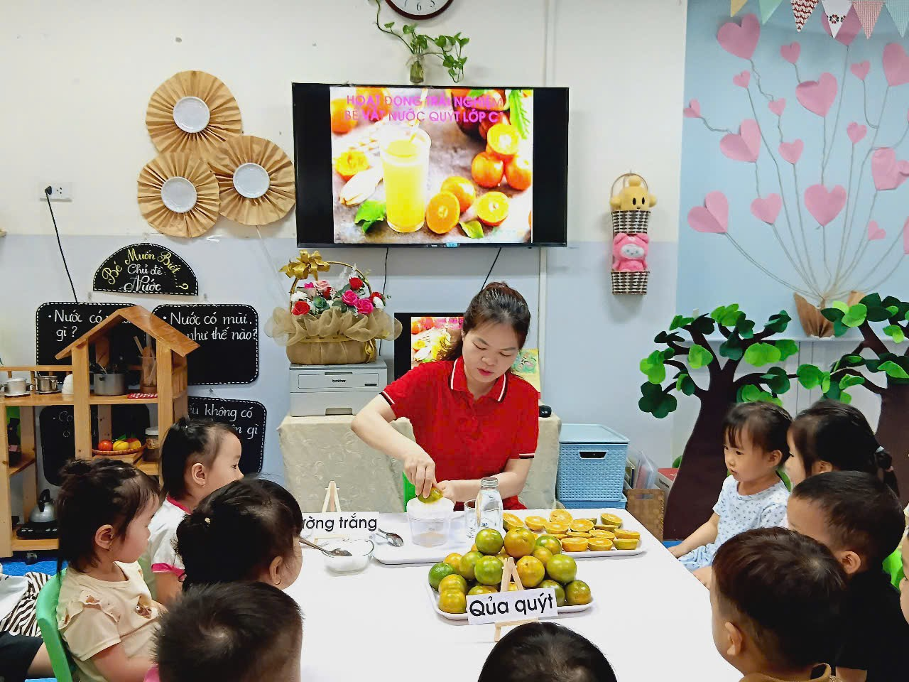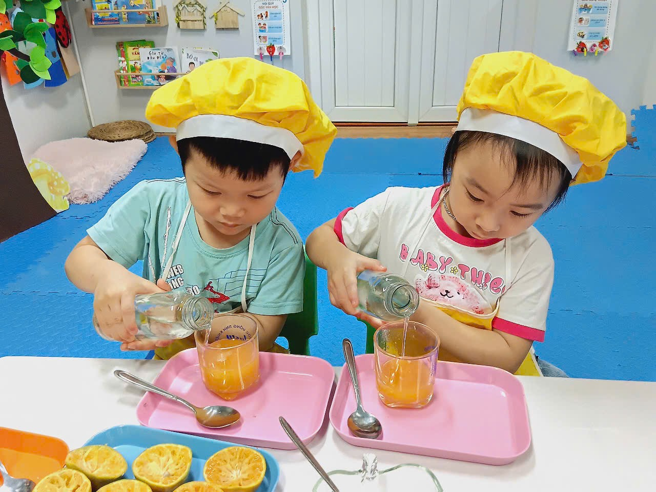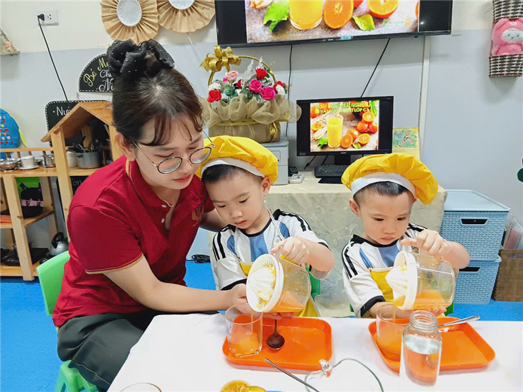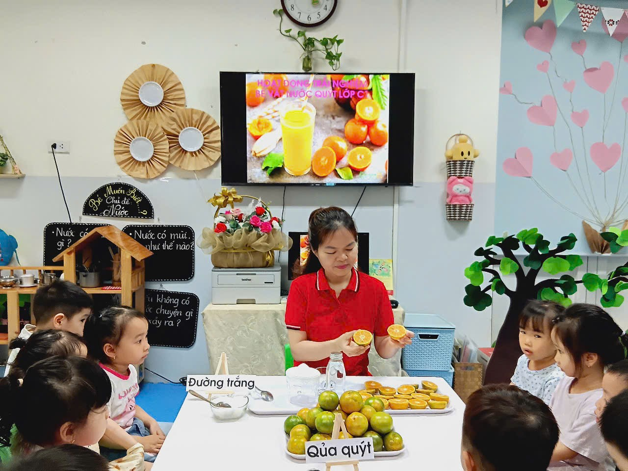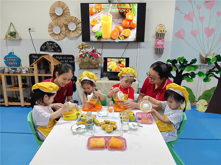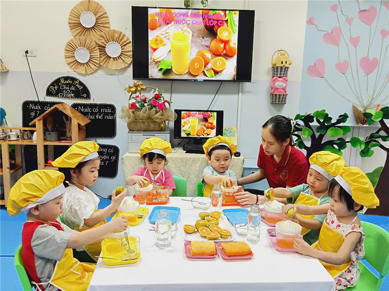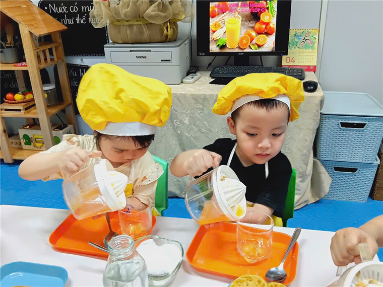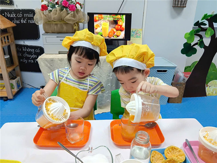 Với sự chuẩn bị và cách hướng dẫn của cô giáo, Từ những kỹ năng đơn giản đến phức tạp cô đã hướng dẫn các con. Đôi bàn tay nhỏ xinh xoay xoay trái quýt vắt lấy nước, bỏ đường và điều chỉnh độ chua ngọt phù hợp theo ý thích của các bạn nhỏ đã làm được một cốc nước hoa quả thật ngon lành.