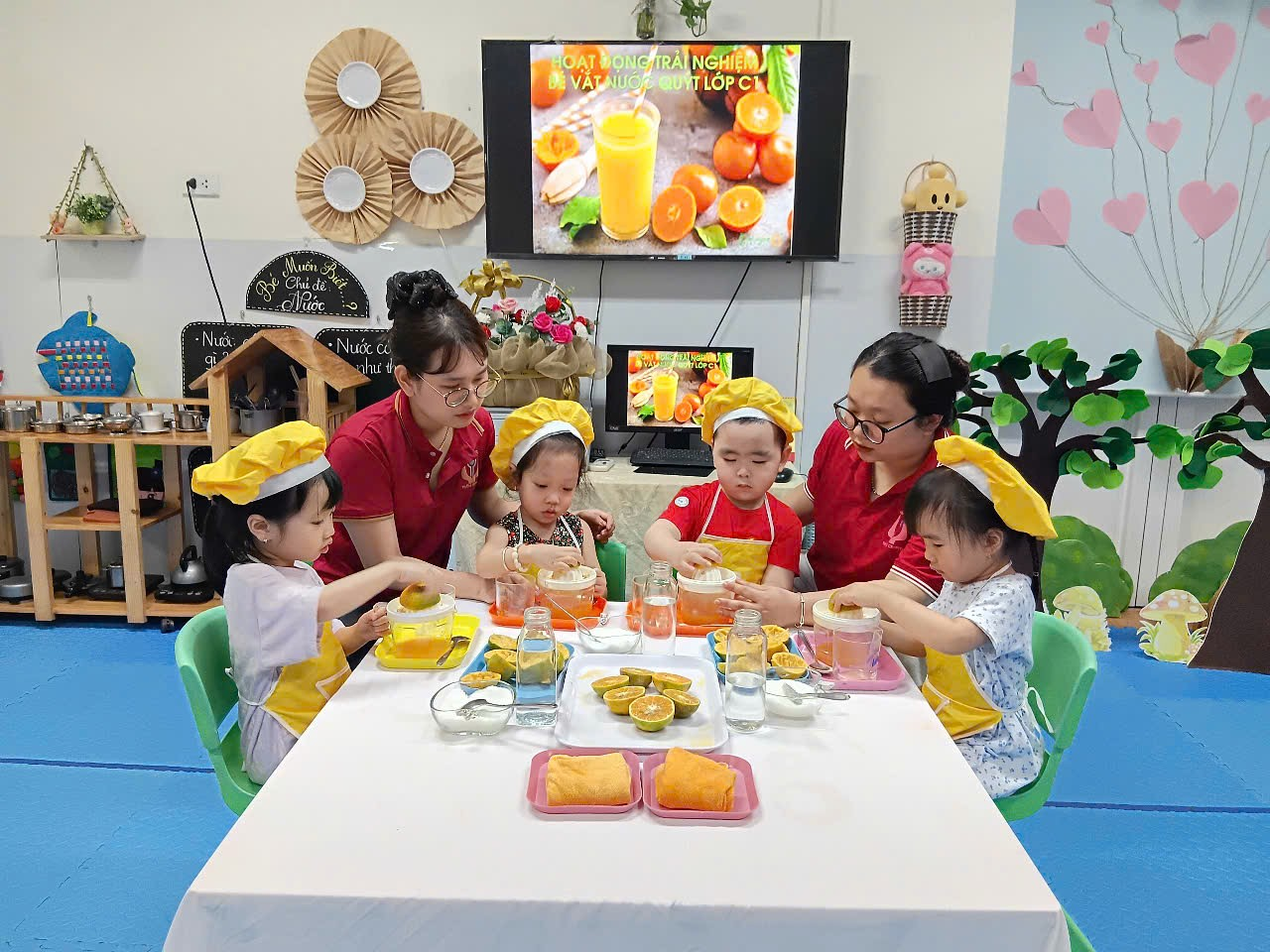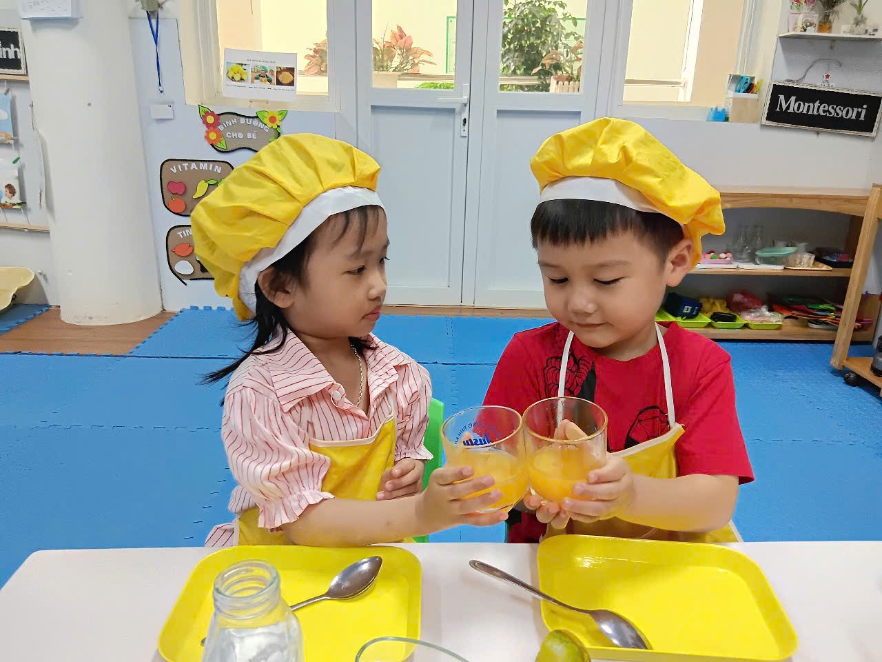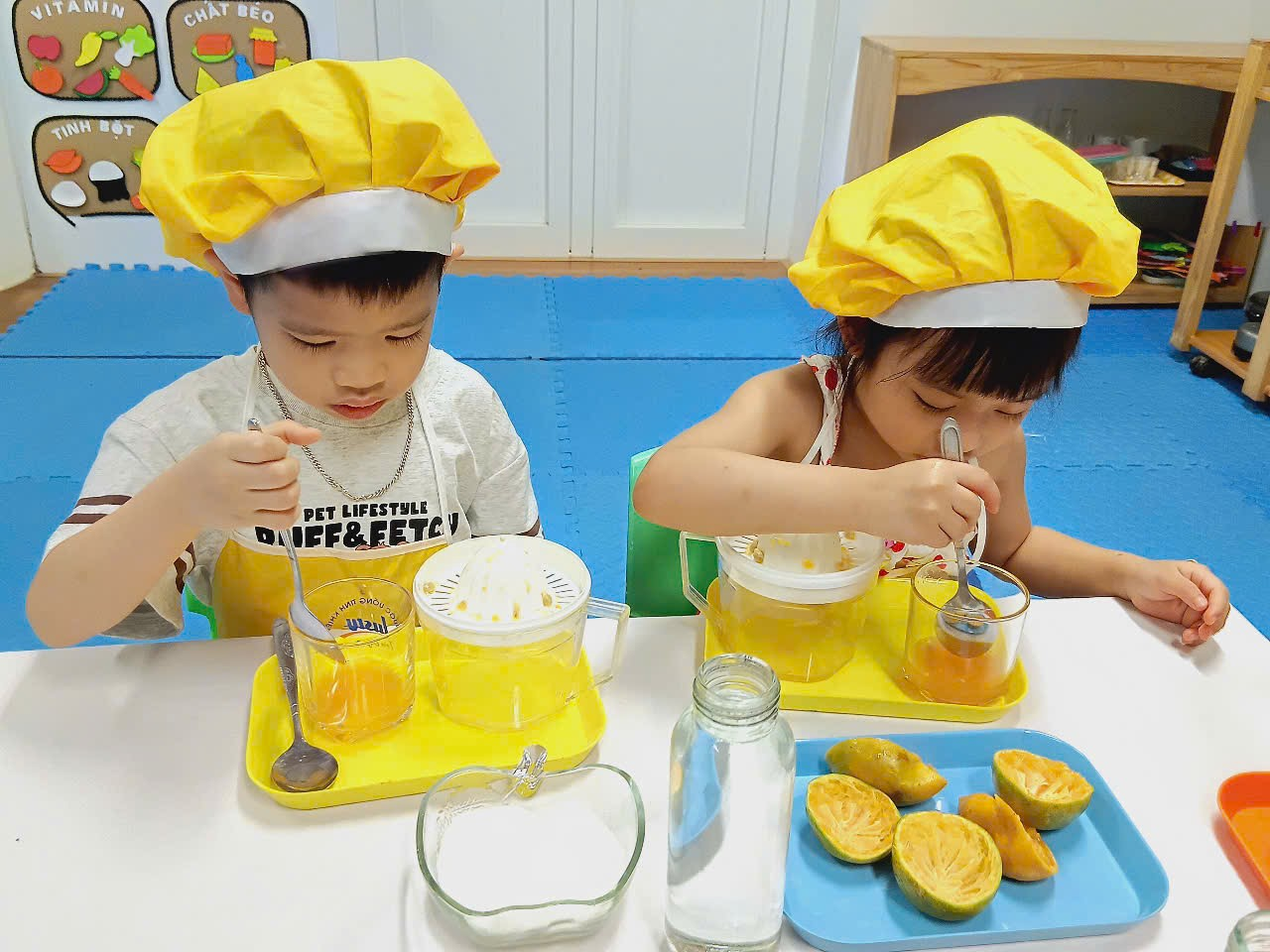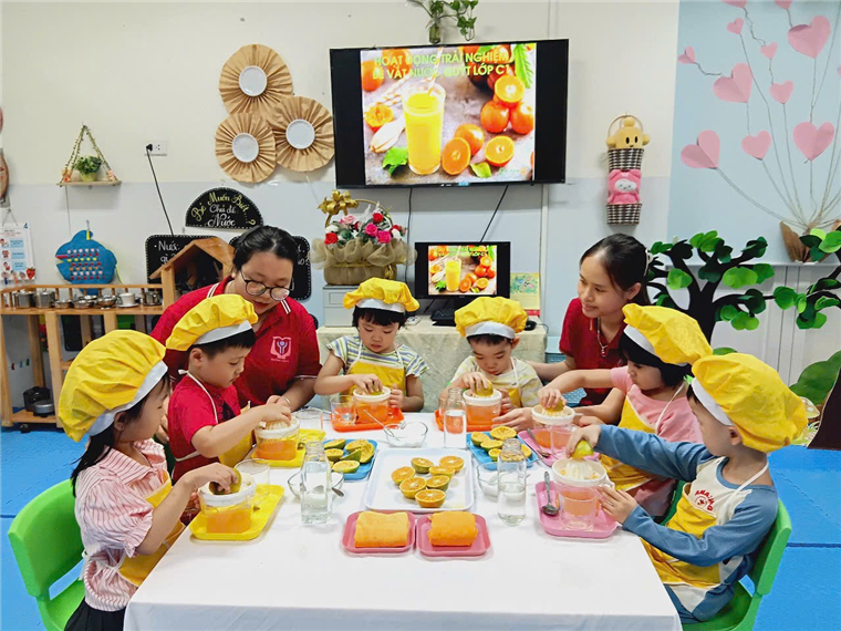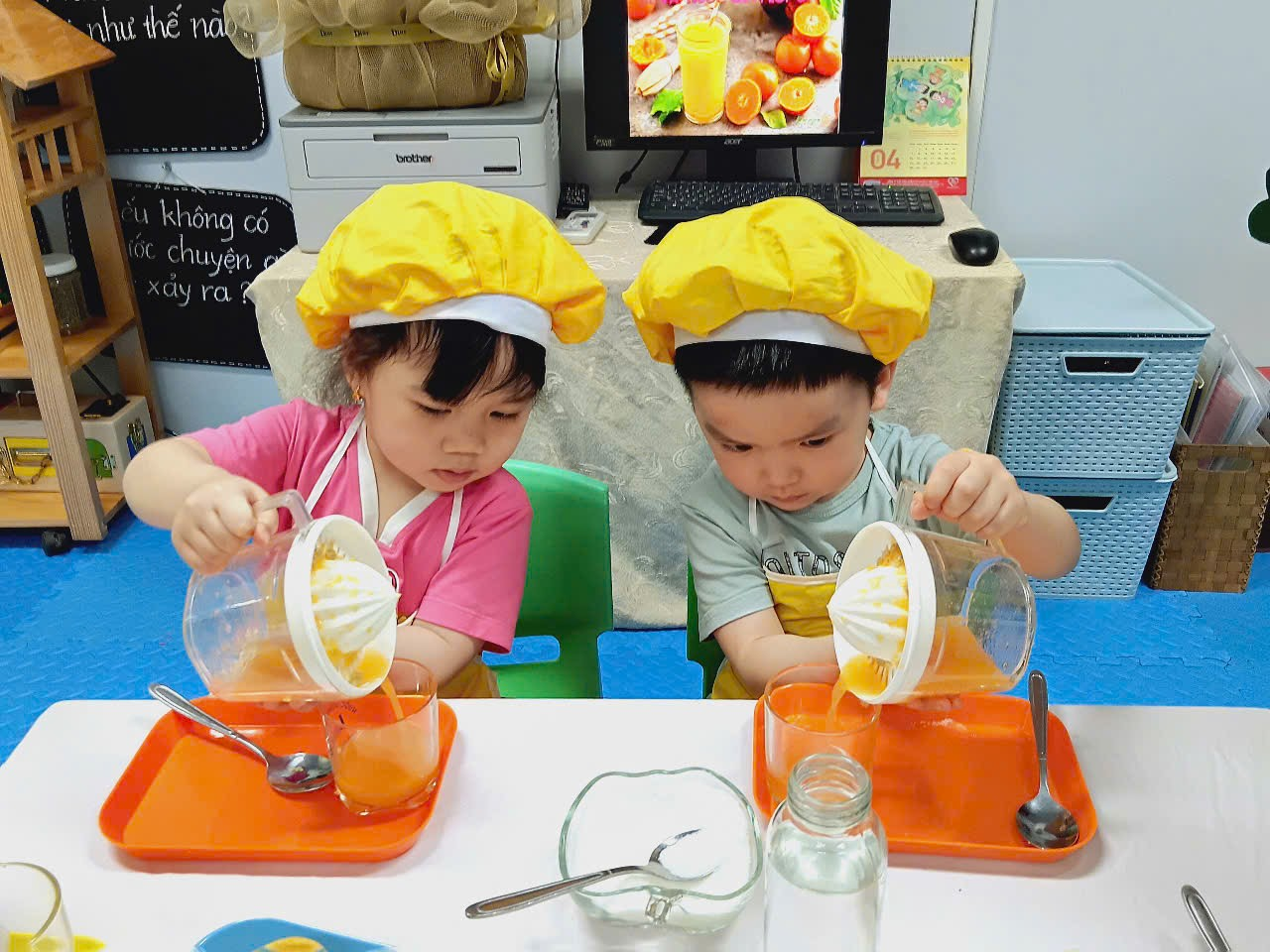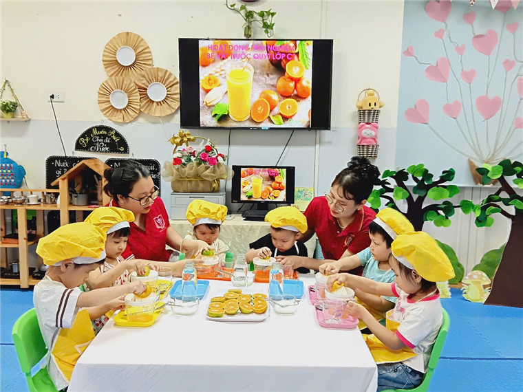 Với sự chuẩn bị và cách hướng dẫn của cô giáo, Từ những kỹ năng đơn giản đến phức tạp cô đã hướng dẫn các con. Đôi bàn tay nhỏ xinh xoay xoay trái quýt vắt lấy nước, bỏ đường và điều chỉnh độ chua ngọt phù hợp theo ý thích của các bạn nhỏ đã làm được một cốc nước hoa quả thật ngon lành.
