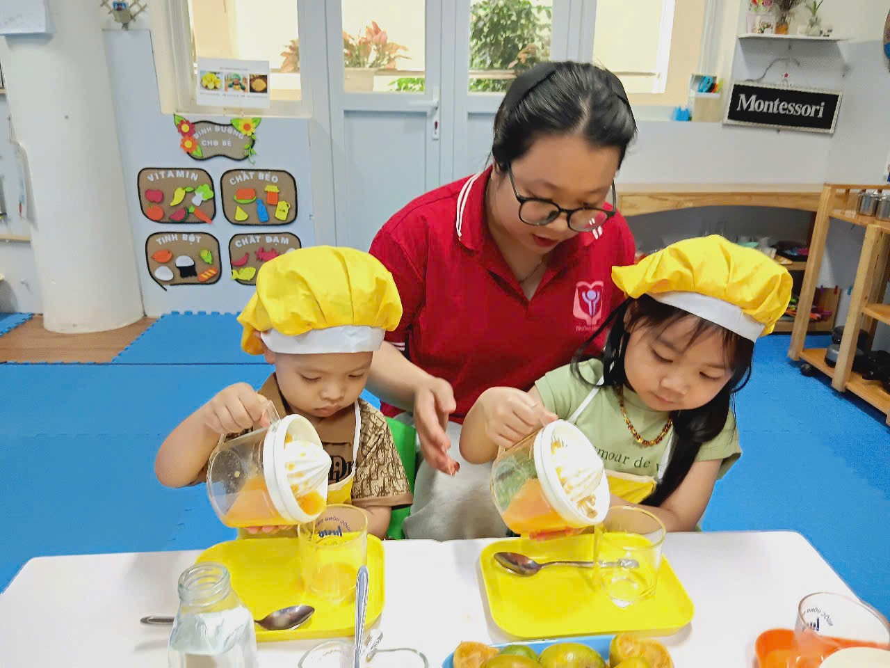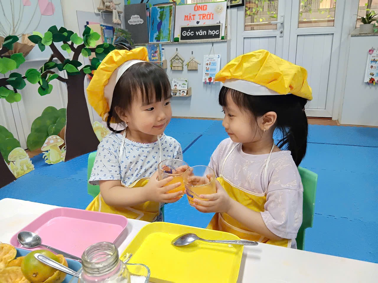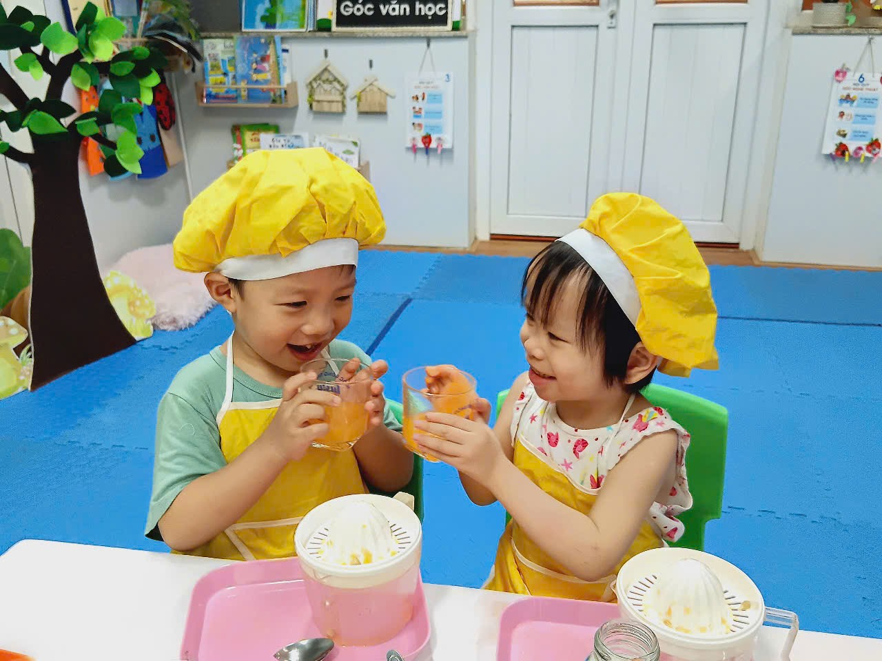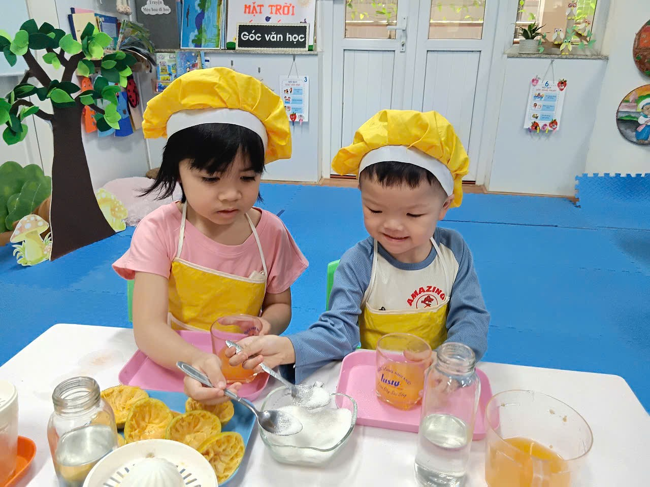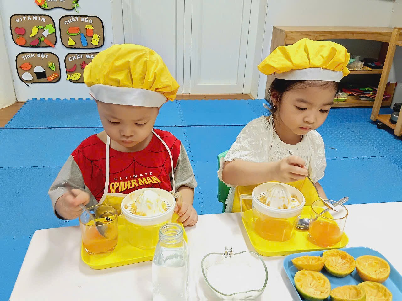 Với sự chuẩn bị và cách hướng dẫn của cô giáo, Từ những kỹ năng đơn giản đến phức tạp cô đã hướng dẫn các con. Đôi bàn tay nhỏ xinh xoay xoay trái quýt vắt lấy nước, bỏ đường và điều chỉnh độ chua ngọt phù hợp theo ý thích của các bạn nhỏ đã làm được một cốc nước hoa quả thật ngon lành.