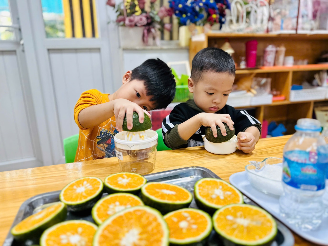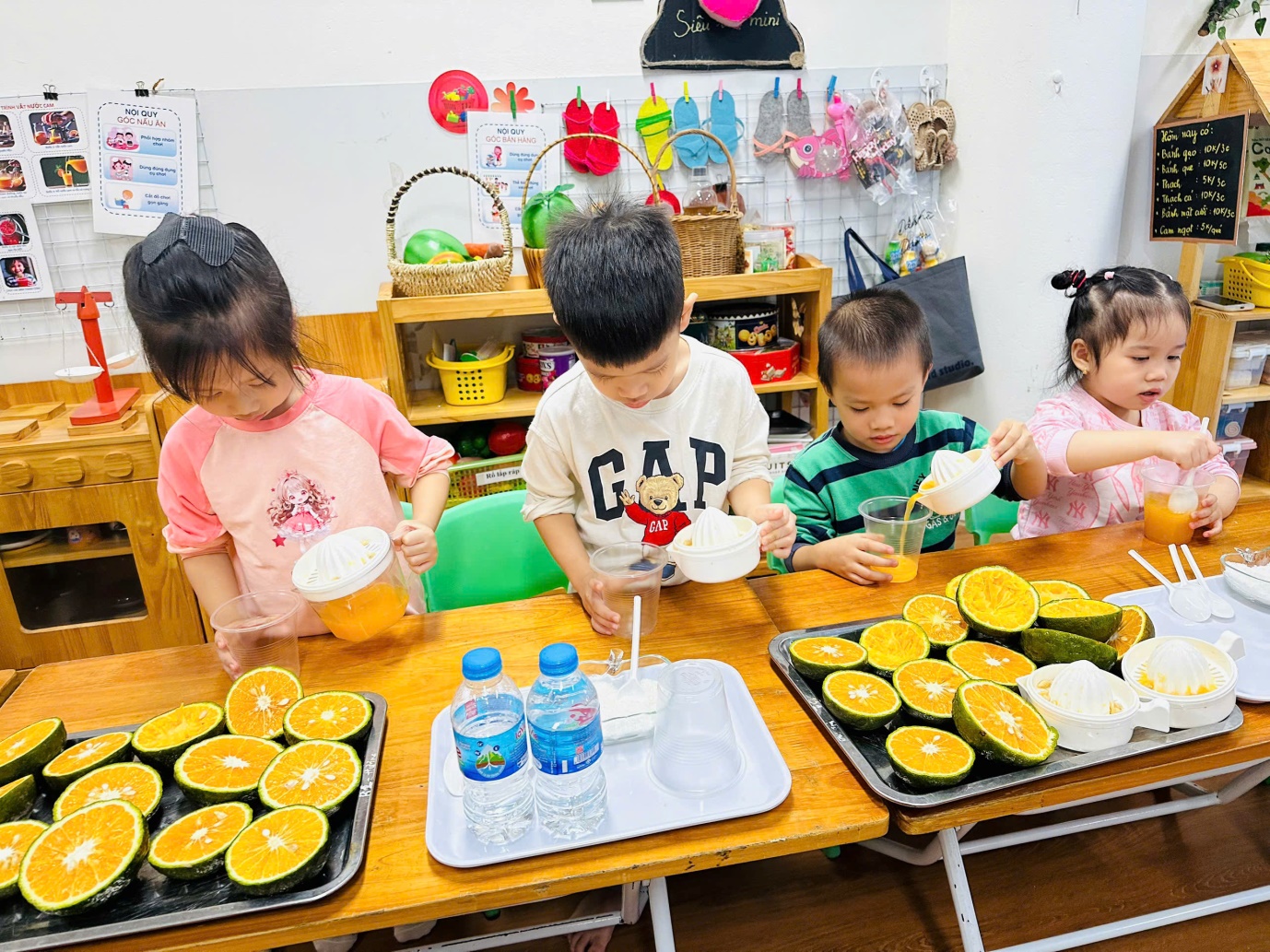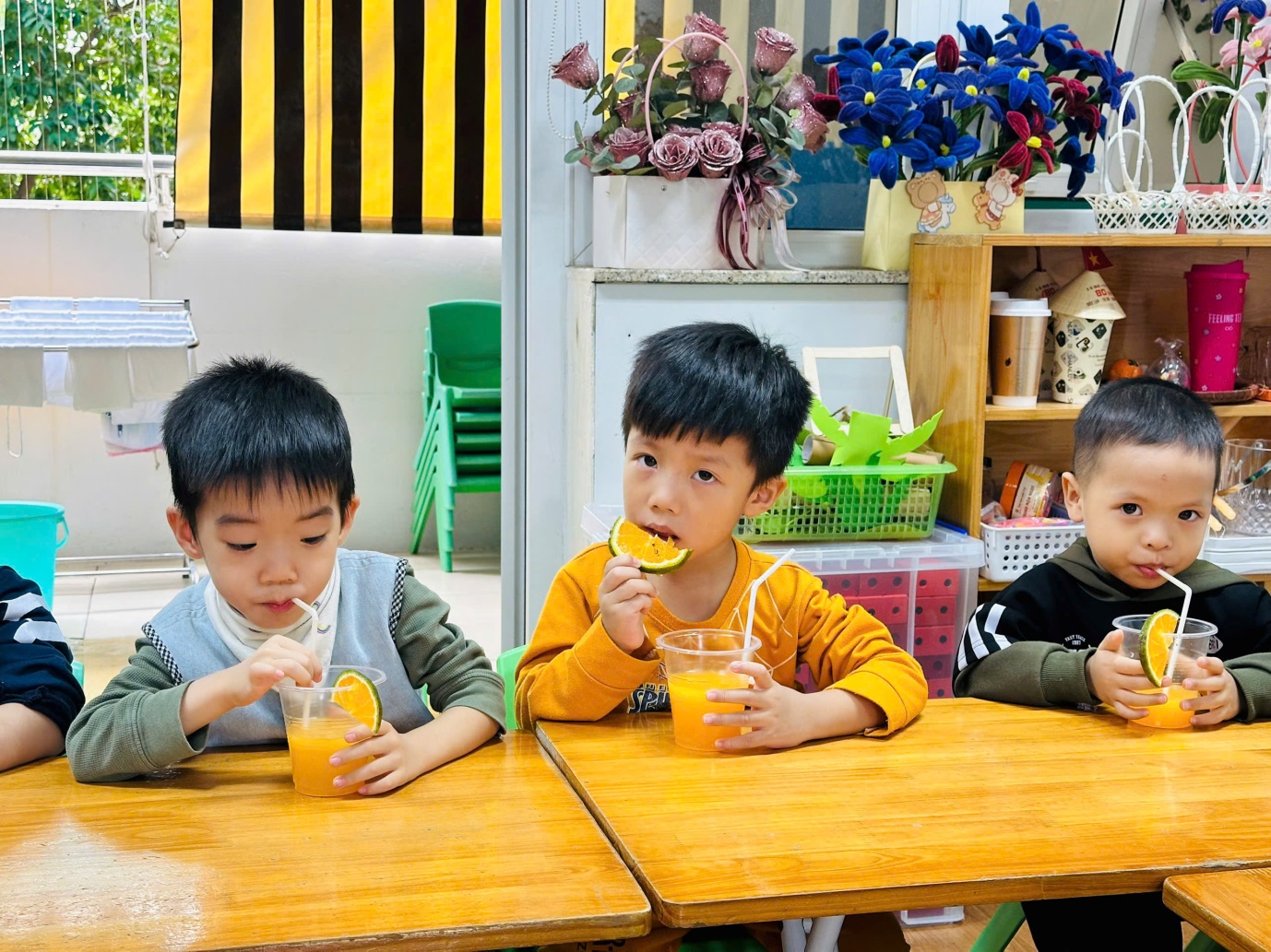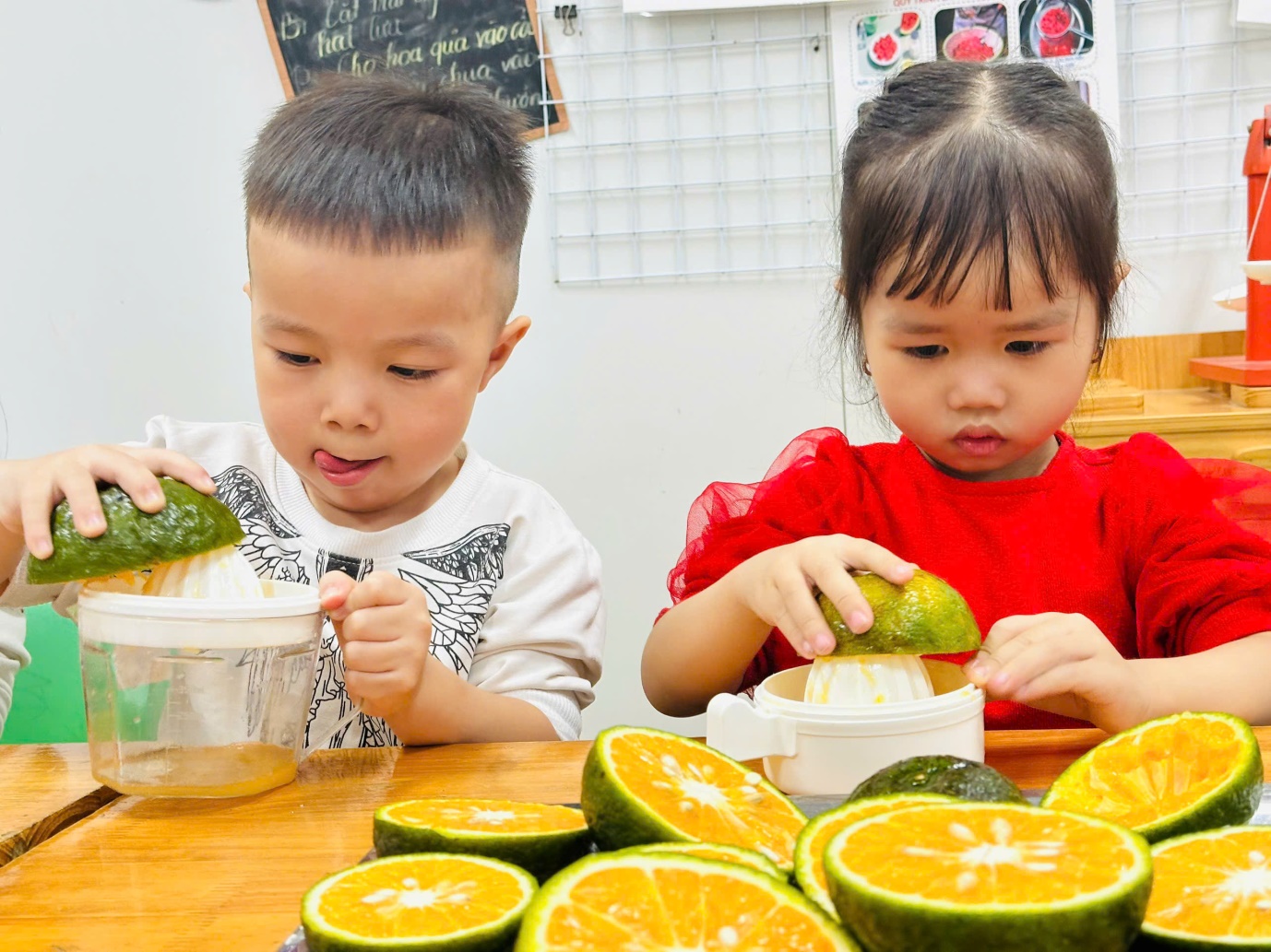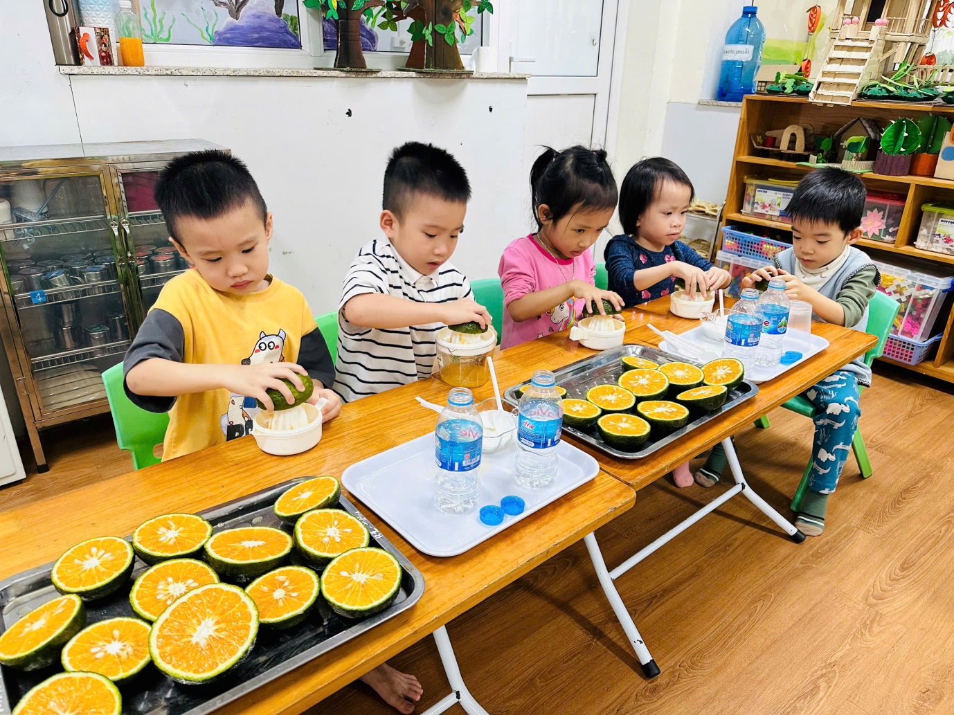 Trong hoạt động “Bé vắt nước cam”, các bé sẽ được làm quen với dụng cụ vắt cam và khám phá bên trong của trái cam có những gì. Đây là một trong những hoạt động rất hấp dẫn đối với các bé, bởi các bé được tự tay làm món nước uống rất bổ dưỡng. Qua hoạt động này, các cô giúp các bé hiểu được muốn cơ thể khỏe mạnh thì cần phải ăn uống đủ chất và cần bổ sung các loại hoa quả chứa nhiều vitamin.