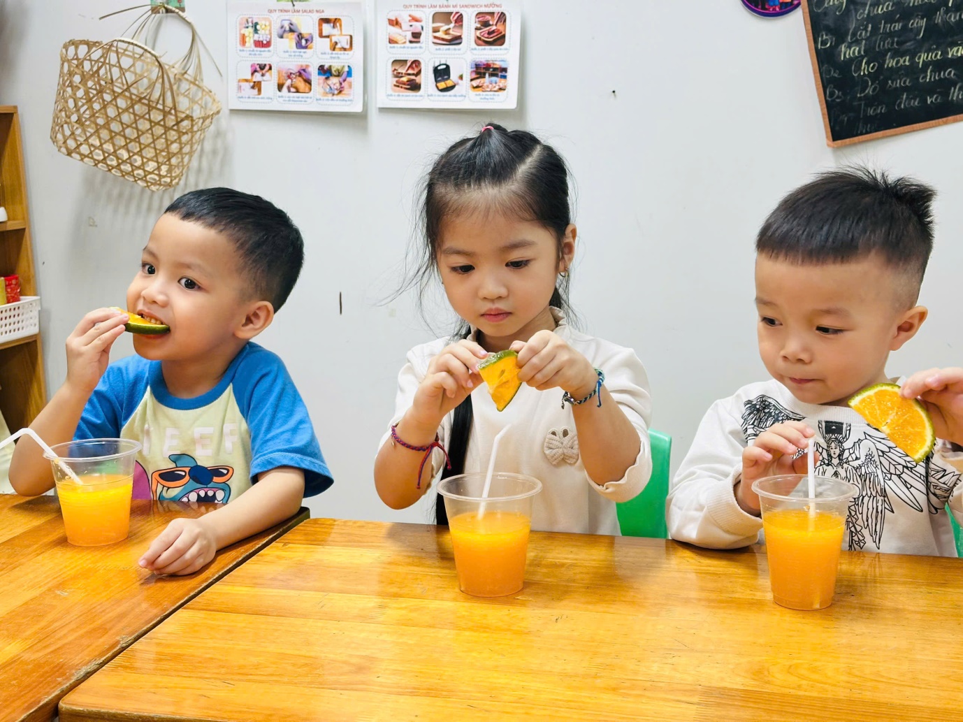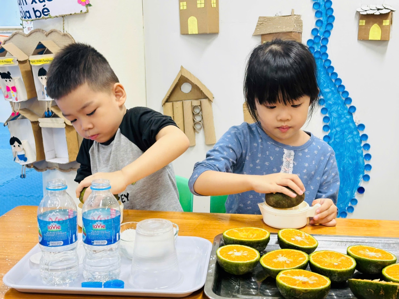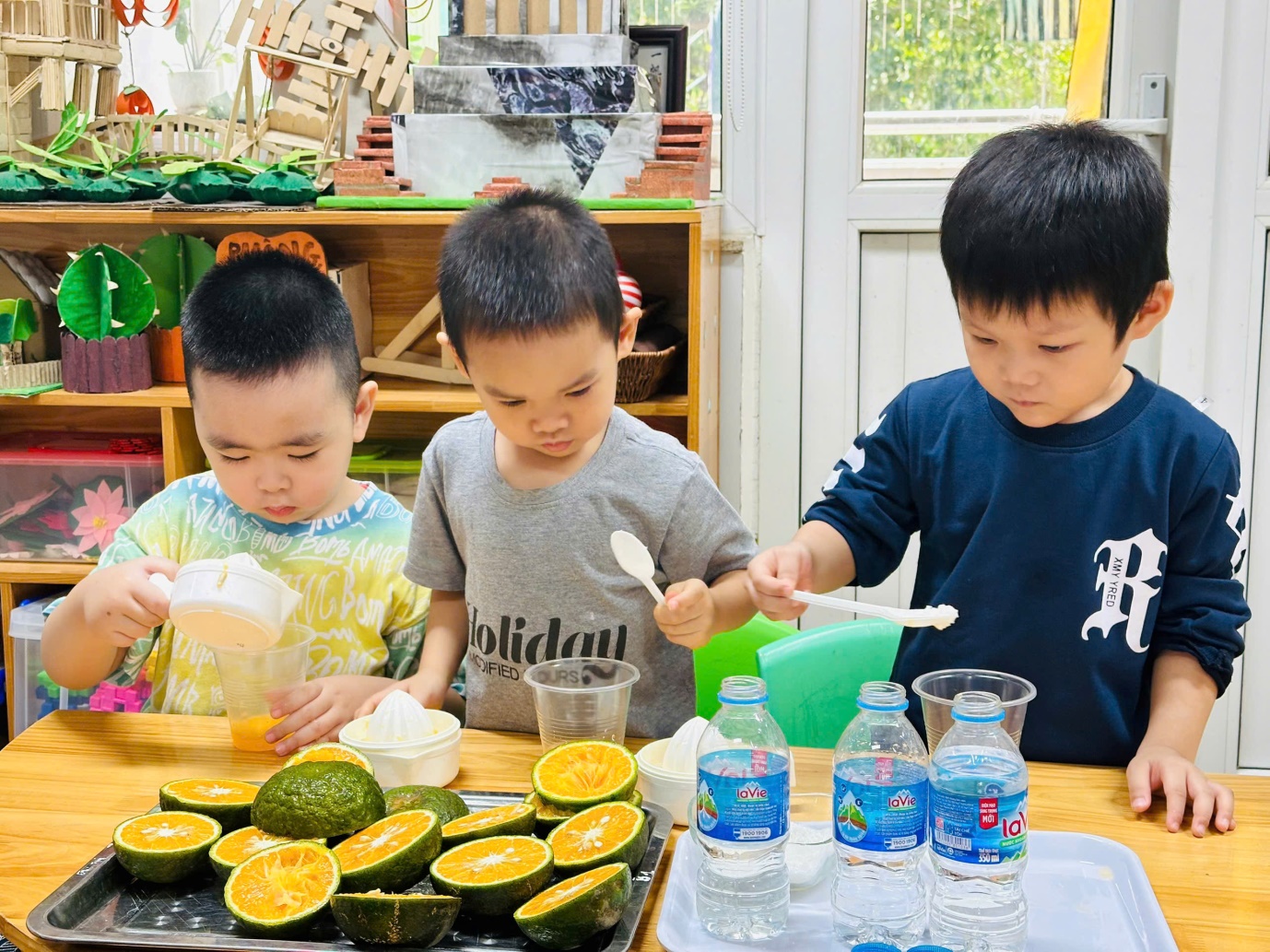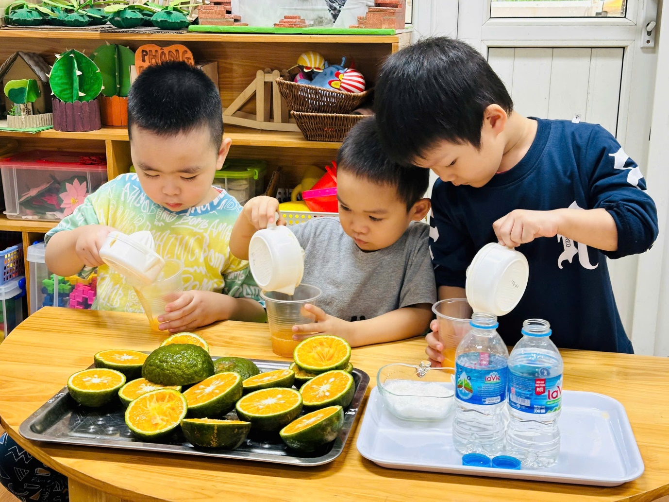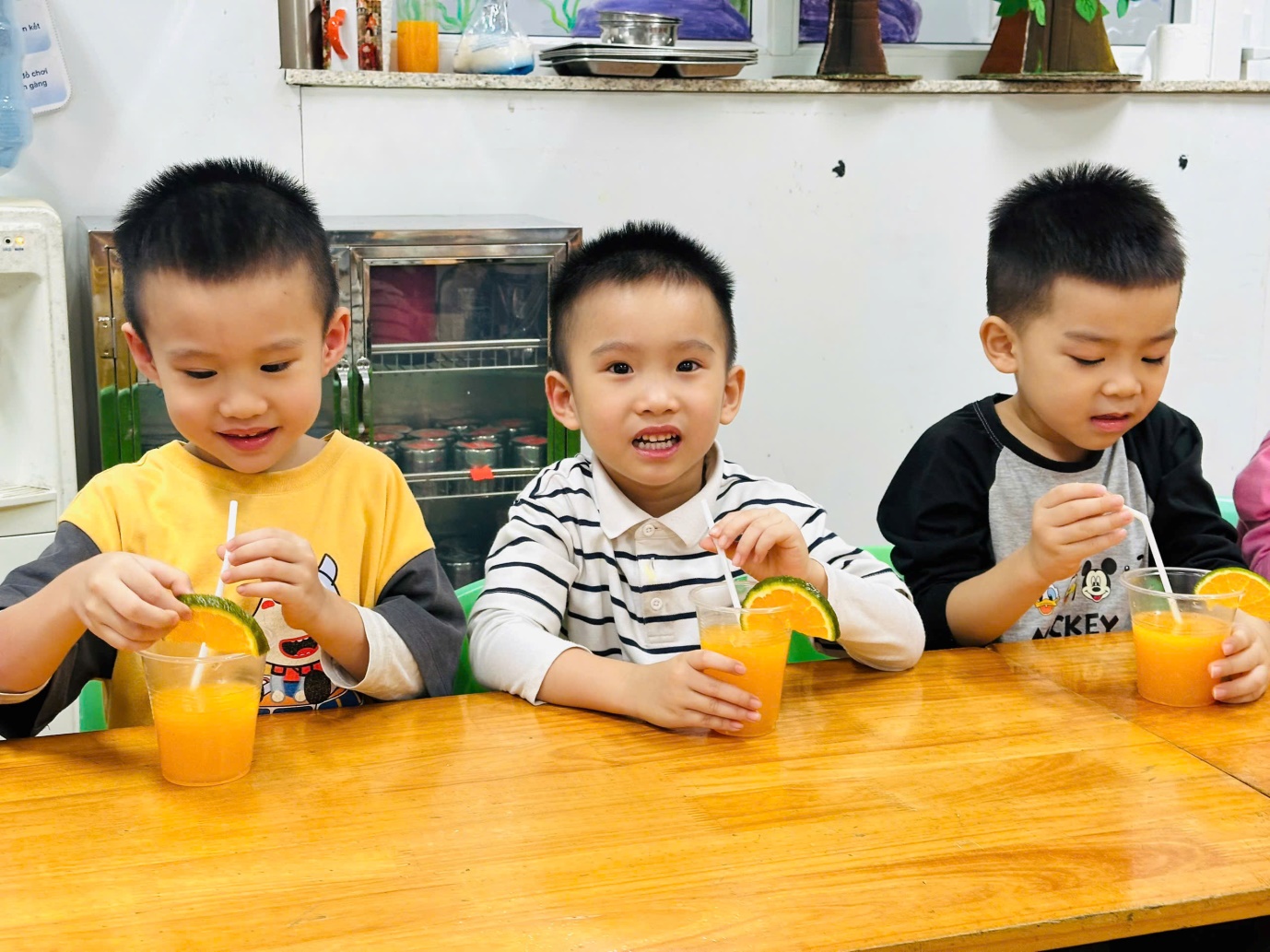 Trong hoạt động “Bé vắt nước cam”, các bé sẽ được làm quen với dụng cụ vắt cam và khám phá bên trong của trái cam có những gì. Đây là một trong những hoạt động rất hấp dẫn đối với các bé, bởi các bé được tự tay làm món nước uống rất bổ dưỡng. Qua hoạt động này, các cô giúp các bé hiểu được muốn cơ thể khỏe mạnh thì cần phải ăn uống đủ chất và cần bổ sung các loại hoa quả chứa nhiều vitamin.