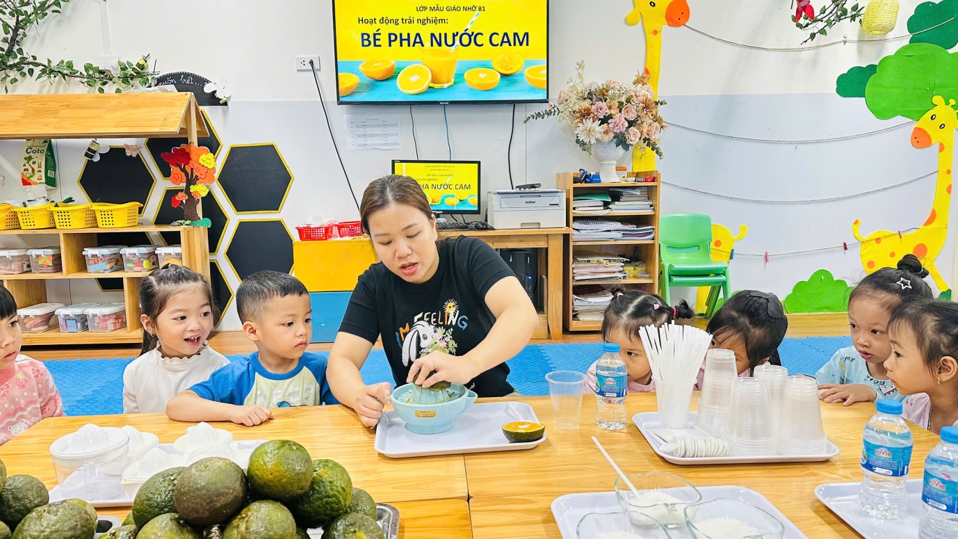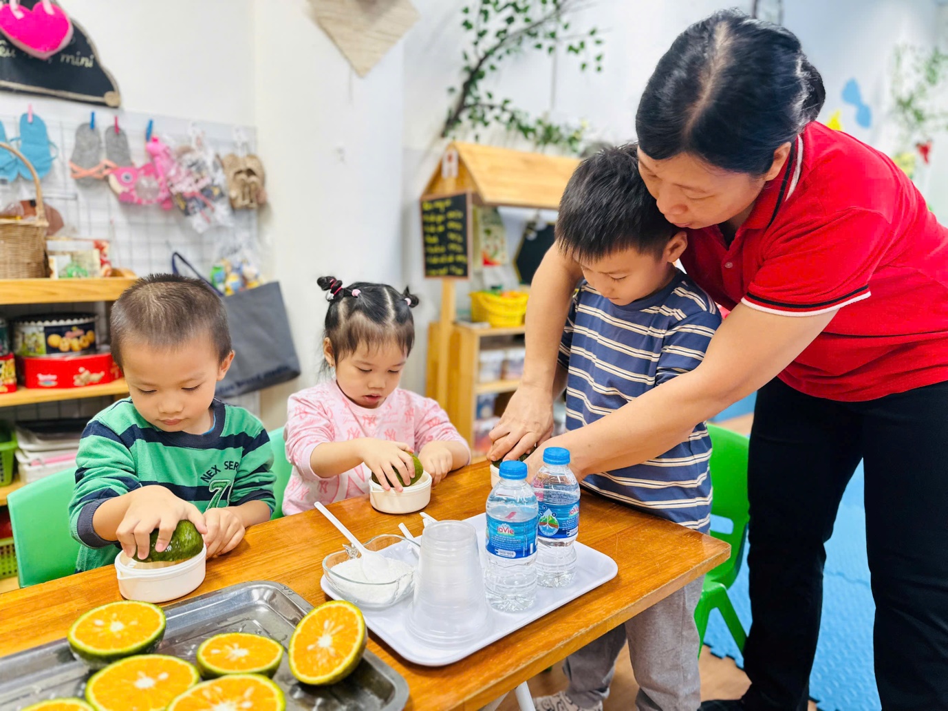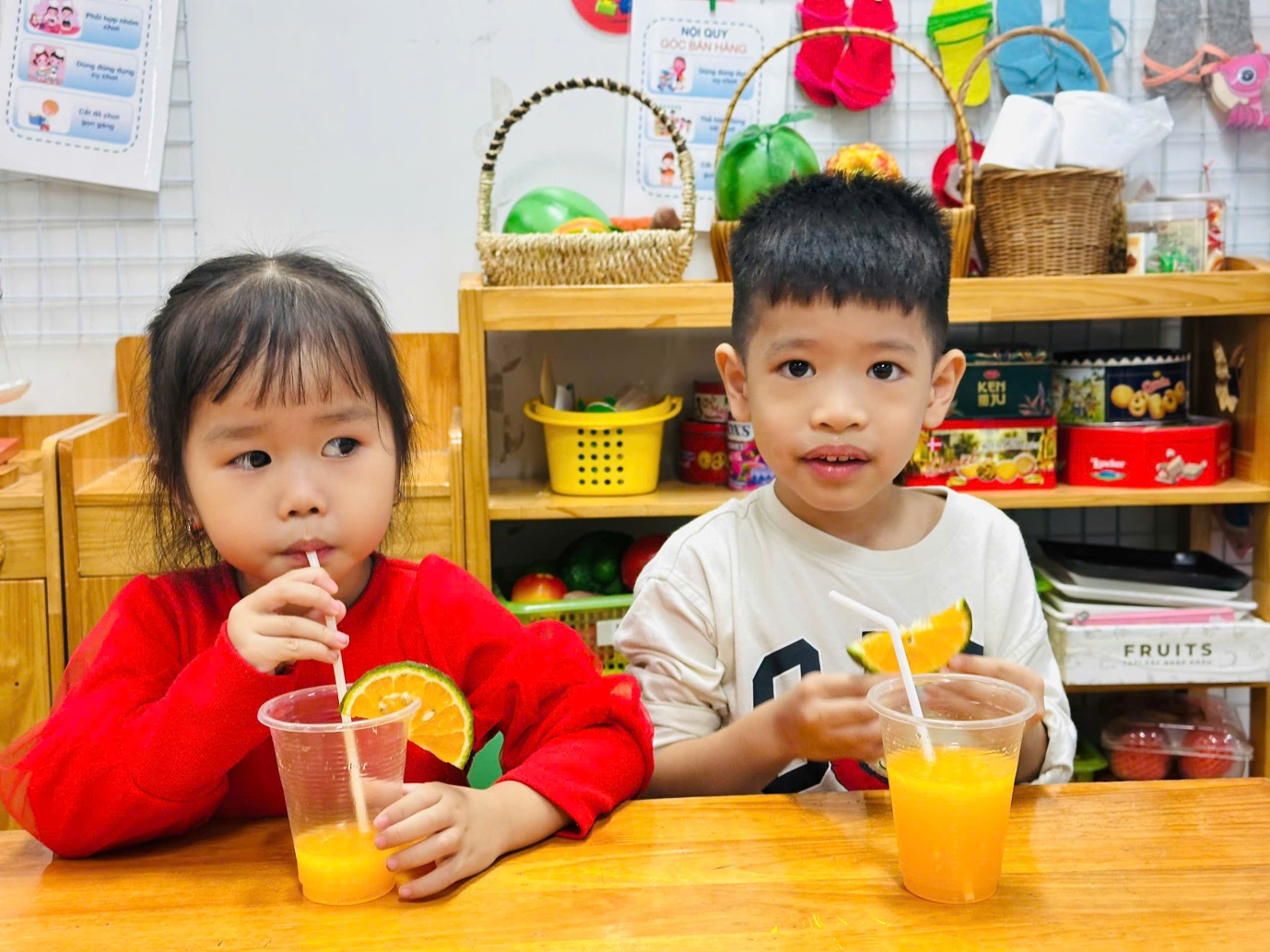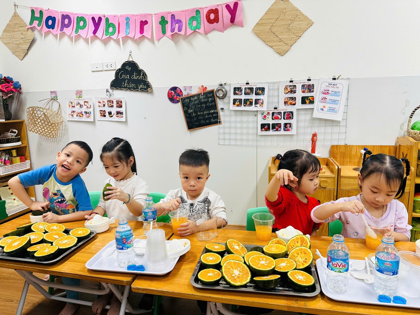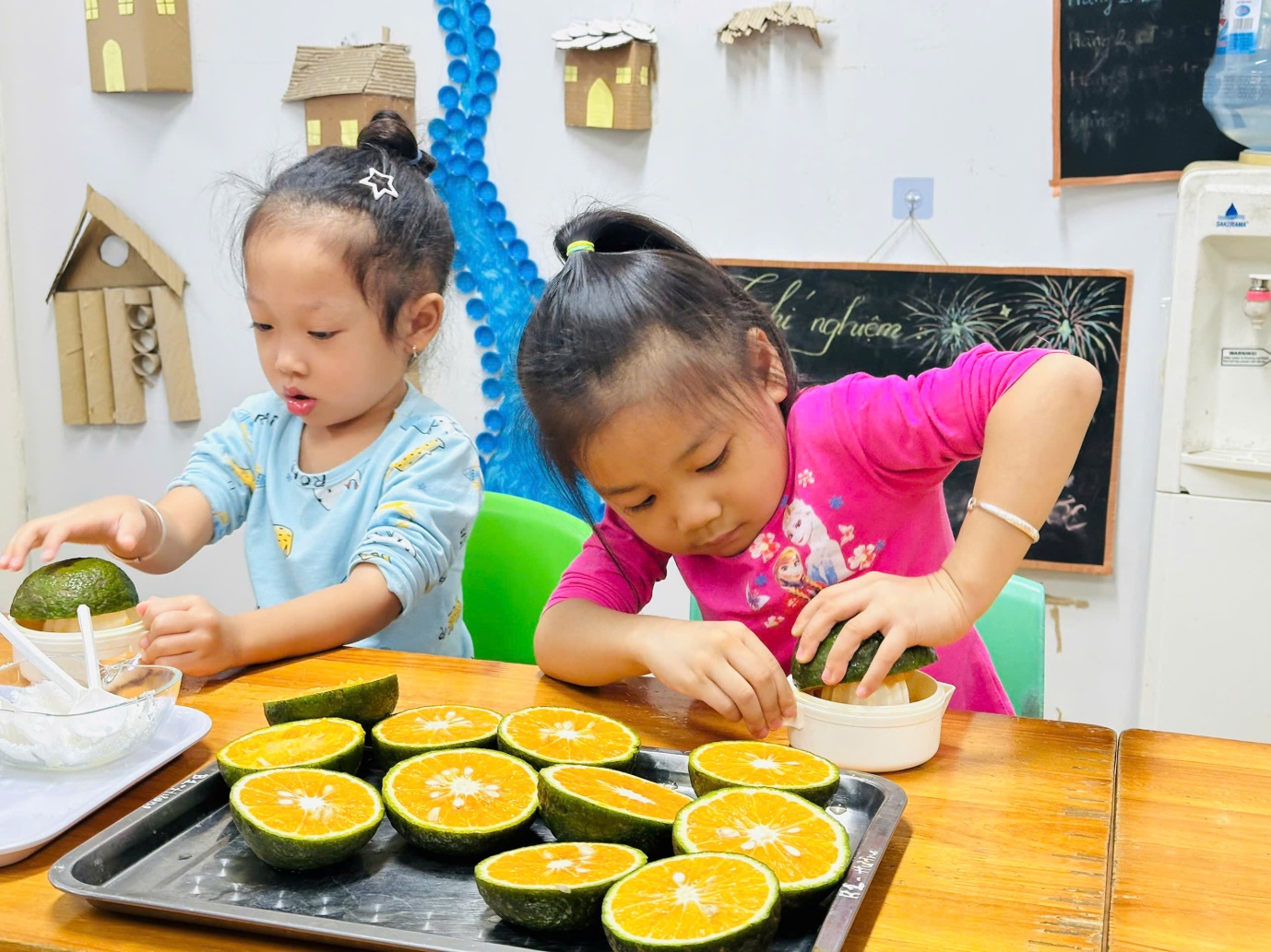 Trong hoạt động “Bé vắt nước cam”, các bé sẽ được làm quen với dụng cụ vắt cam và khám phá bên trong của trái cam có những gì. Đây là một trong những hoạt động rất hấp dẫn đối với các bé, bởi các bé được tự tay làm món nước uống rất bổ dưỡng. Qua hoạt động này, các cô giúp các bé hiểu được muốn cơ thể khỏe mạnh thì cần phải ăn uống đủ chất và cần bổ sung các loại hoa quả chứa nhiều vitamin.