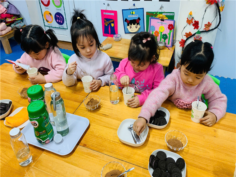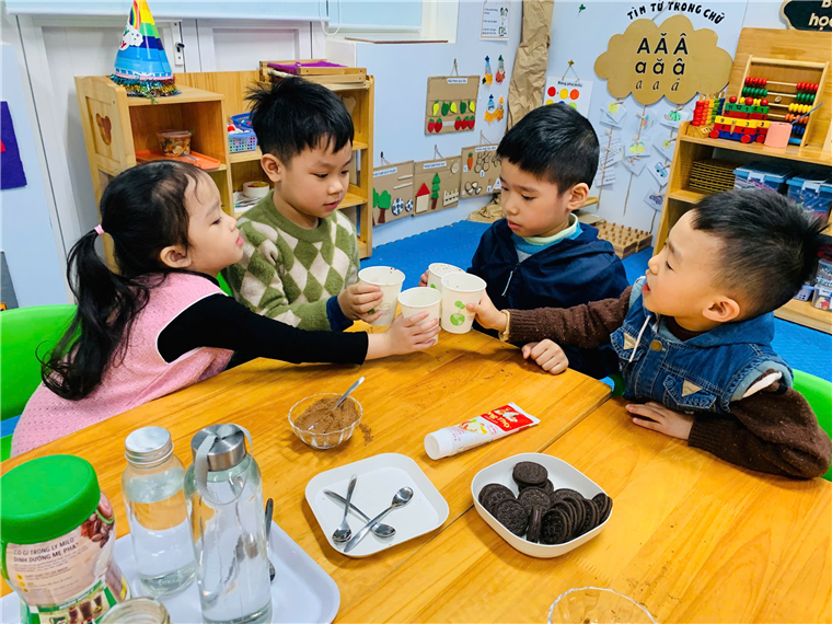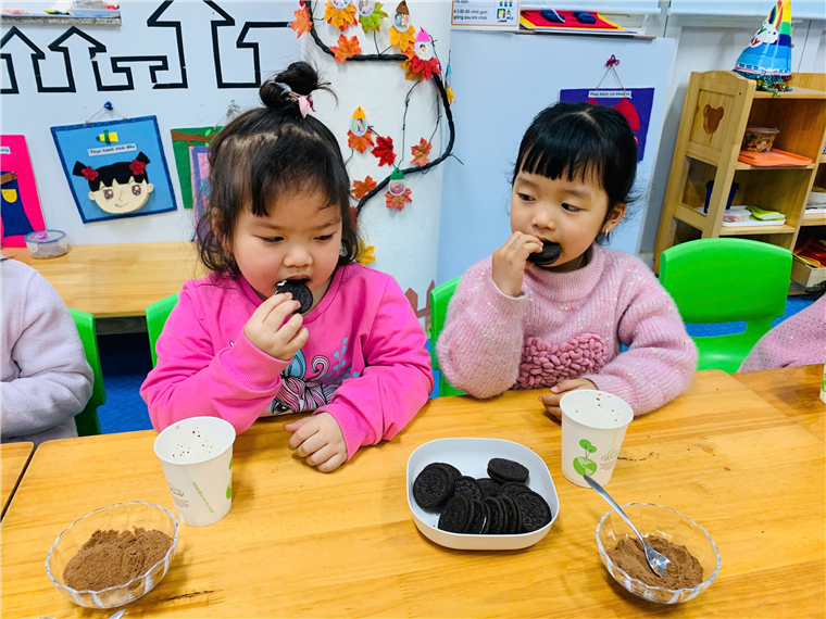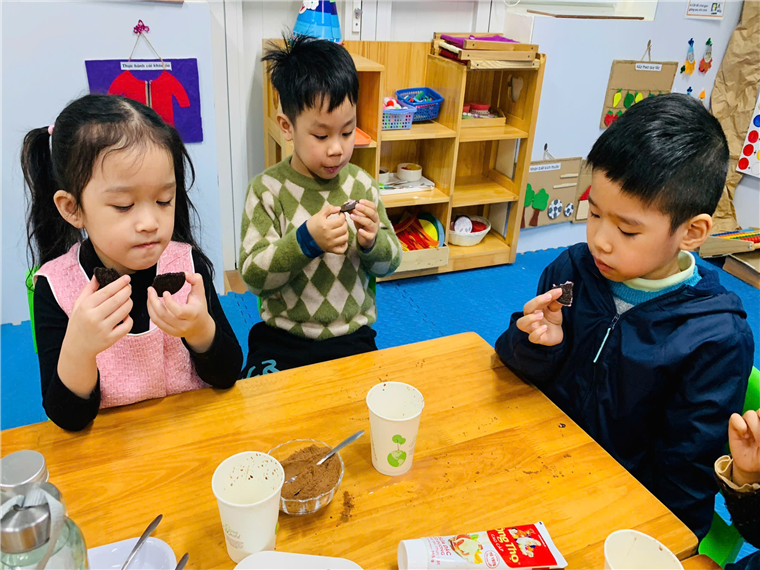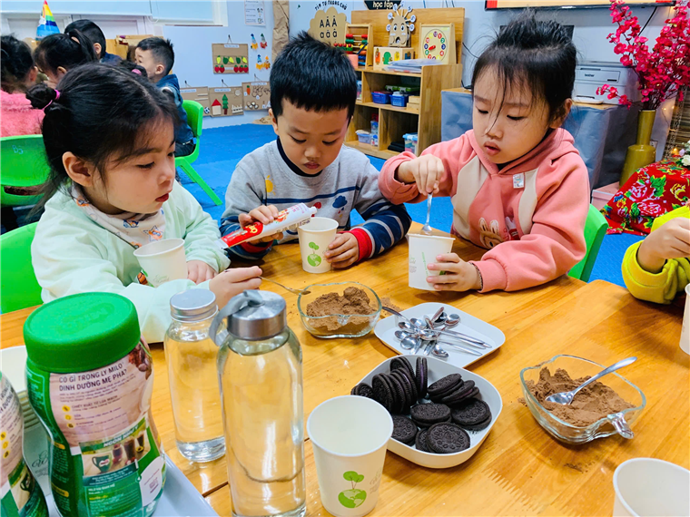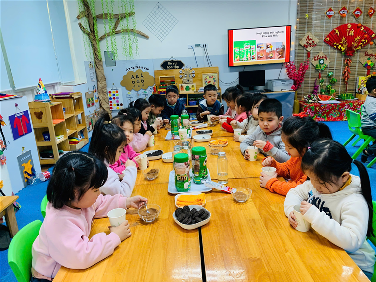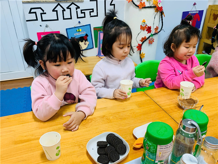 Sau khi pha xong, các bé bắt đầu cùng nhau thưởng thức sữa MILO cùng với những chiếc bánh quy trông thật là ngon.