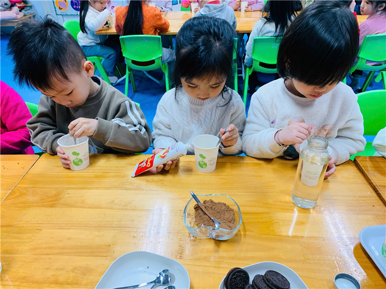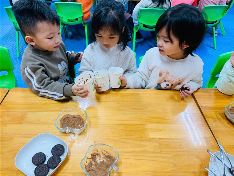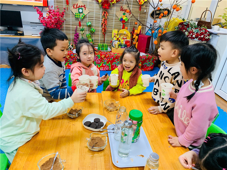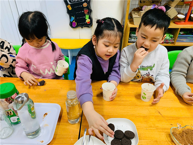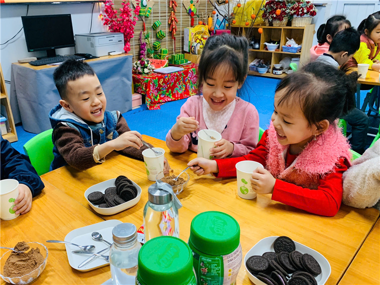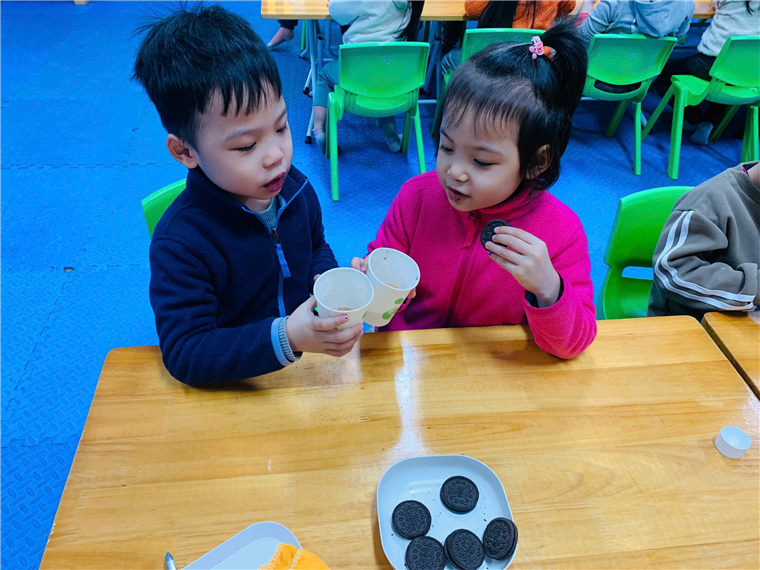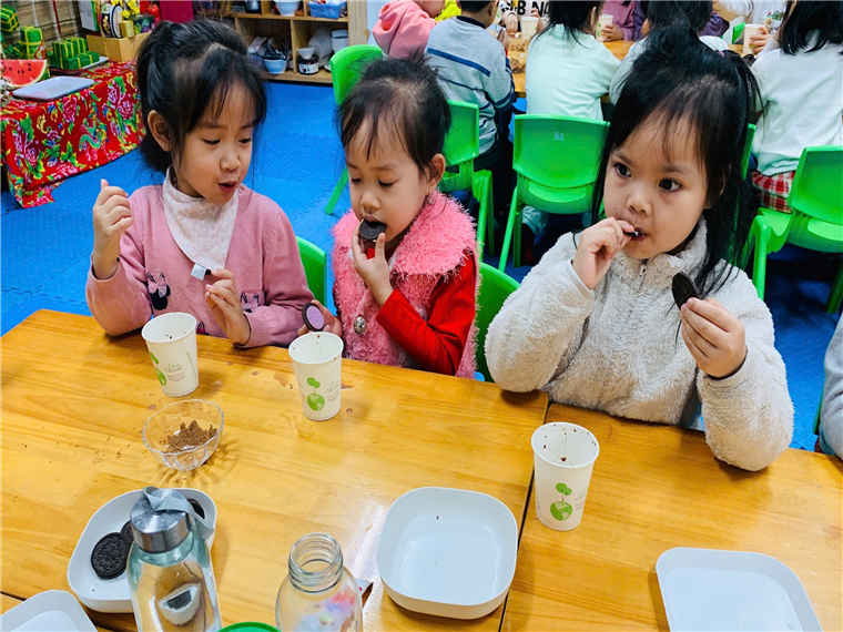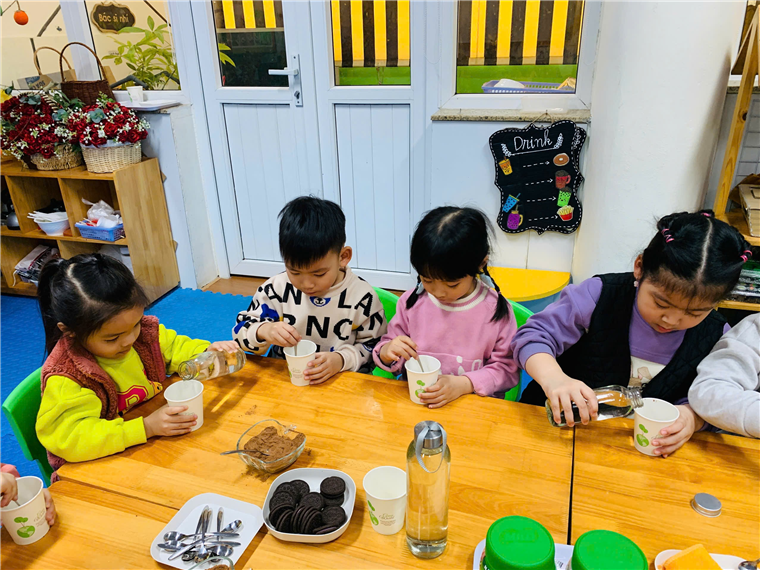 Sau khi pha xong, các bé bắt đầu cùng nhau thưởng thức sữa MILO cùng với những chiếc bánh quy trông thật là ngon.
