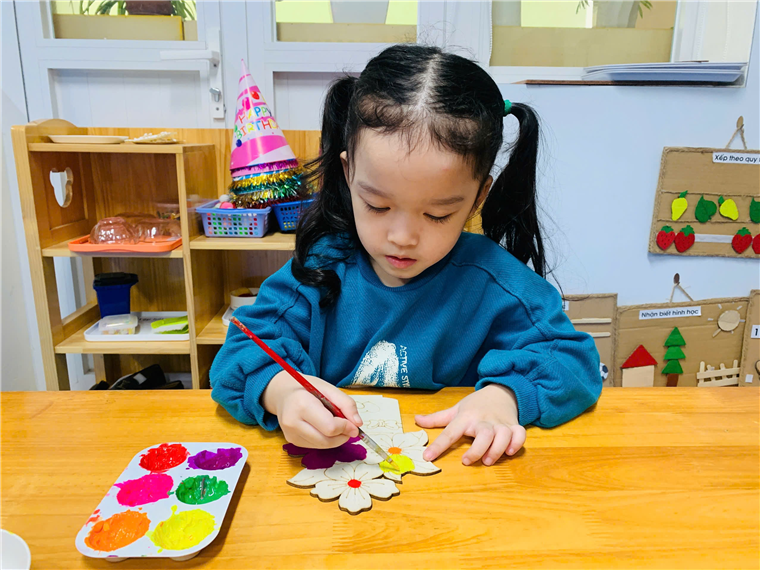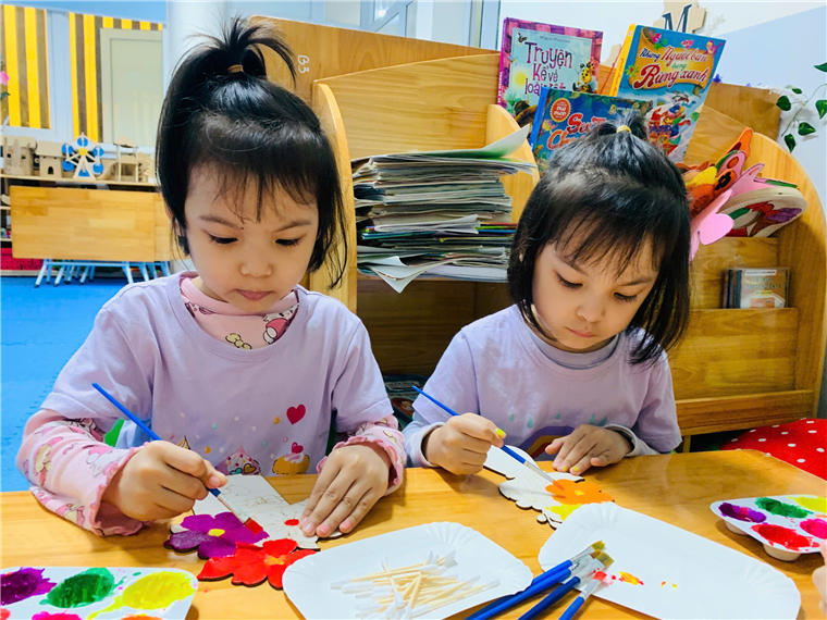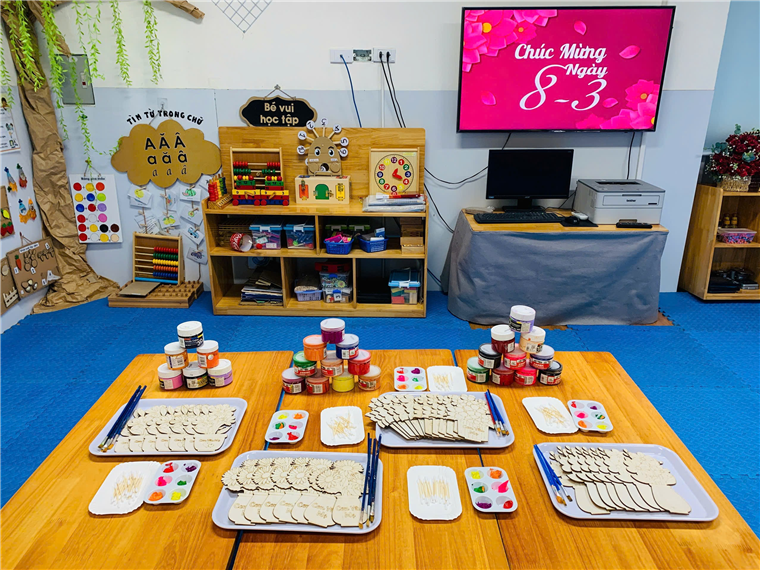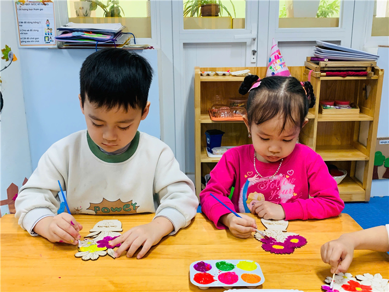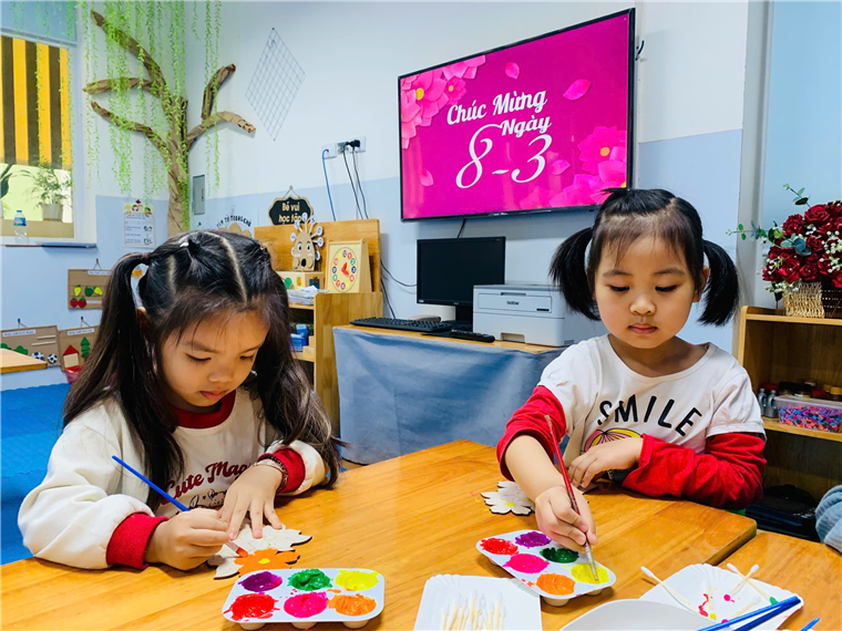 Đầu tiên, cô giáo đã chuẩn bị cho các con những tấm thiệp hoa gỗ vô cùng xinh xắn, đáng yêu để các con có thể thỏa sức lựa chọn và nêu ra ý tưởng của mình về cách trang trí và tô màu tấm thiệp hoa. Bằng đôi bàn tay khéo léo, các con đã tự mình tô được những tấm thiệp hoa gỗ đẹp xinh để mang về tặng bà, tặng mẹ. Qua đó phần nào giáo dục trẻ biết yêu thương và chăm sóc những người phụ nữ xung quanh mình hơn.