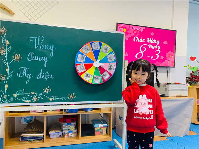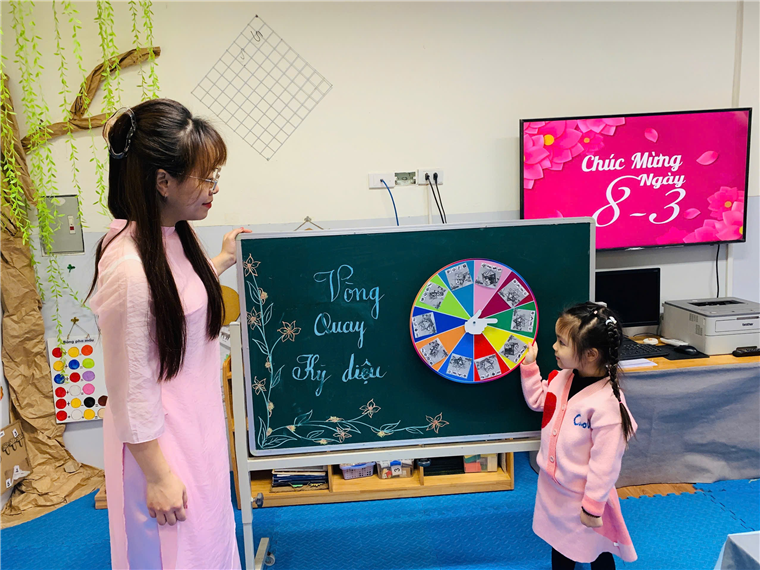 Để buổi chào mừng ngày Quốc tế Phụ nữ được ý nghĩa hơn, các con còn được tham gia trò chơi “Vòng quay kỳ diệu” và trò chơi “Hái hoa dân chủ”. Sau đây là một số hình ảnh về hoạt động này: