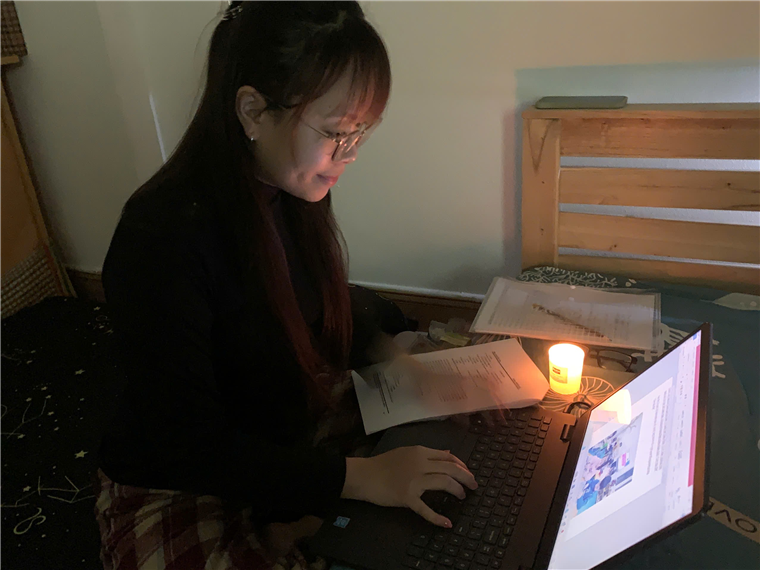 Cô giáo đang làm việc dưới ánh sáng của ngọn nến