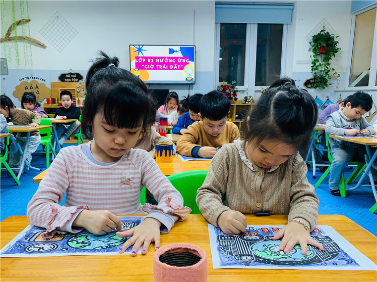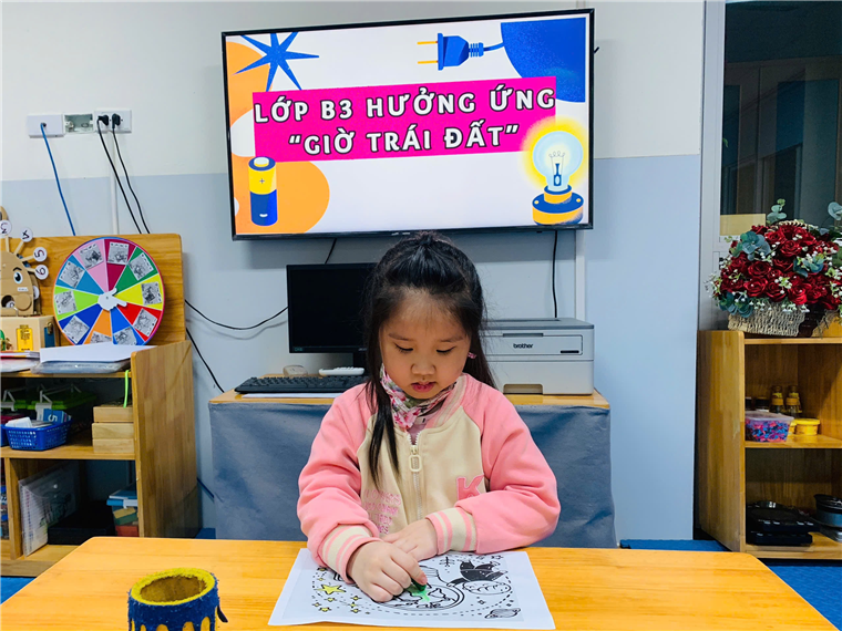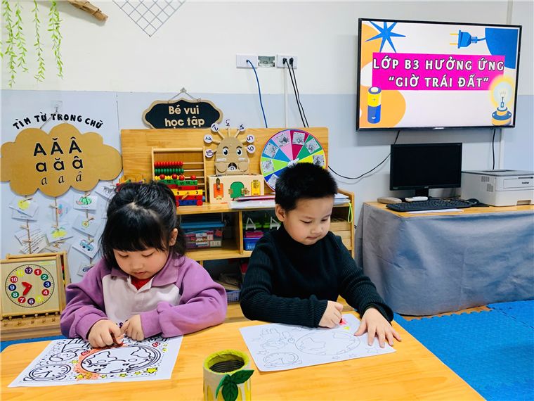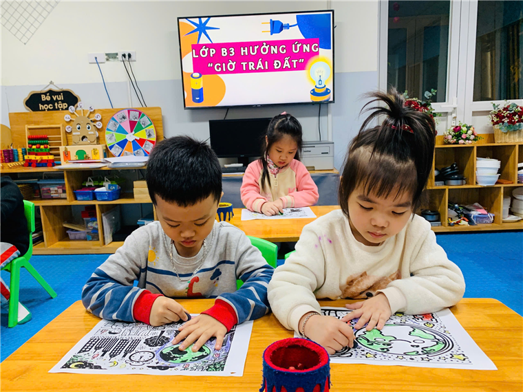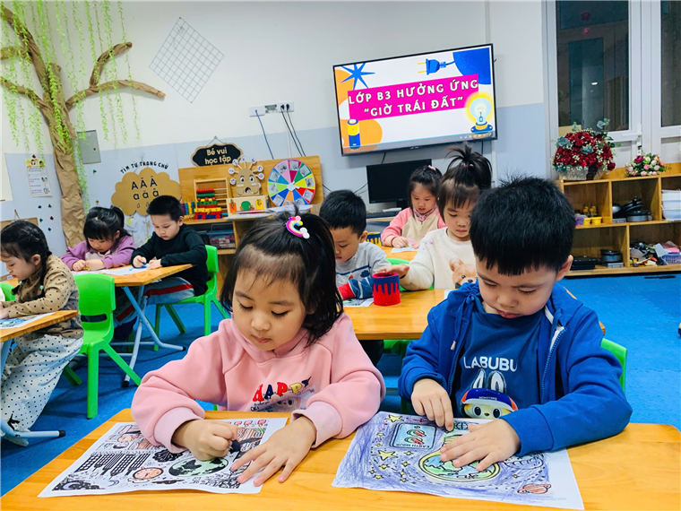 Để hưởng ứng “Giờ trái đất” cô và trò lớp B3 đã cùng nhau sử dụng tiết kiệm điện. Nhằm đem lại hiệu quả tuyên truyền cao và thiết thực tới mọi người xung quanh, các bạn nhỏ tham gia tìm hiểu về cách tiết kiệm điện và tô màu những bức tranh nói về việc tiết kiệm điện, không sử dụng điện nhân chiến dịch “Giờ trái đất”.