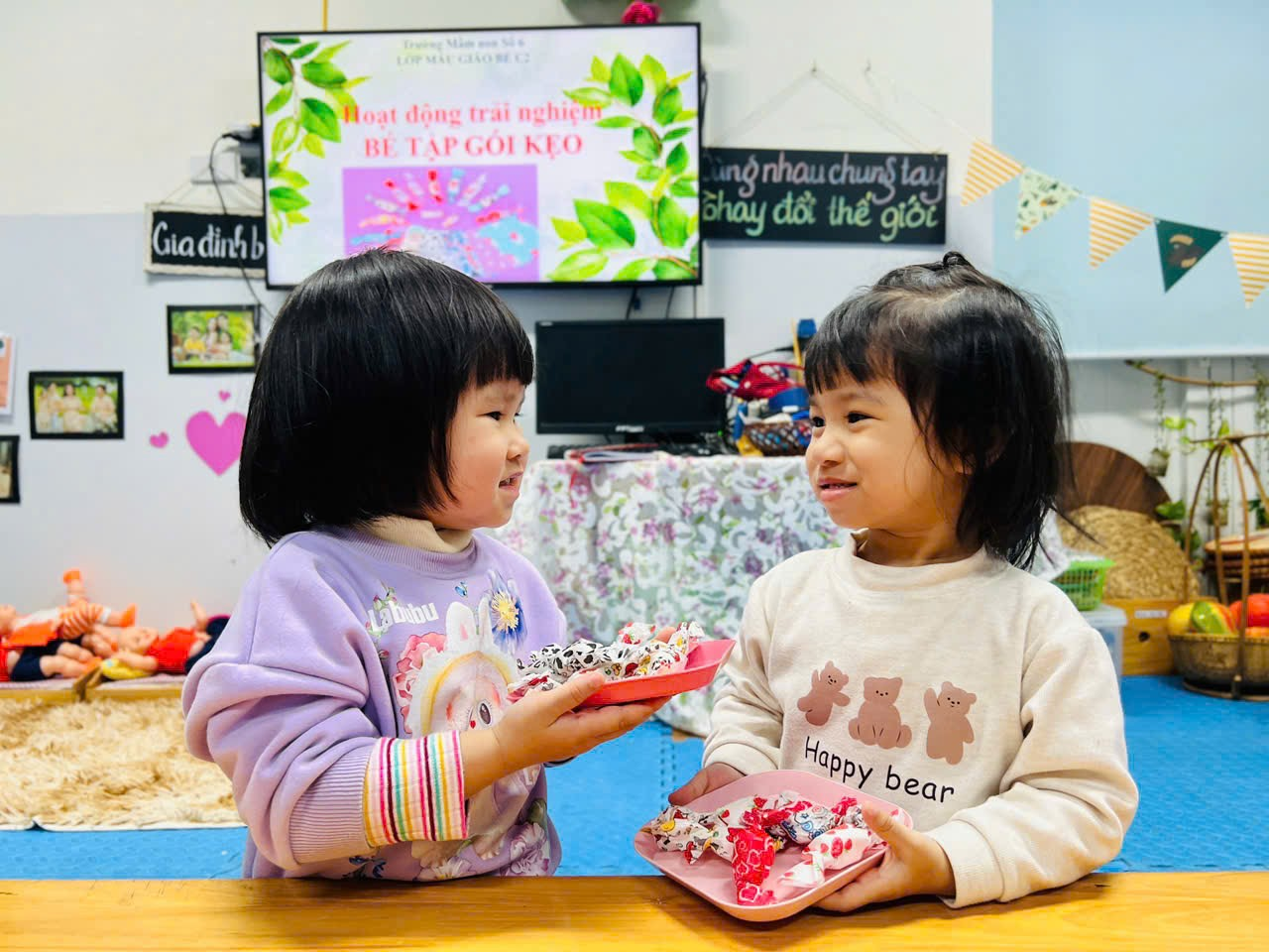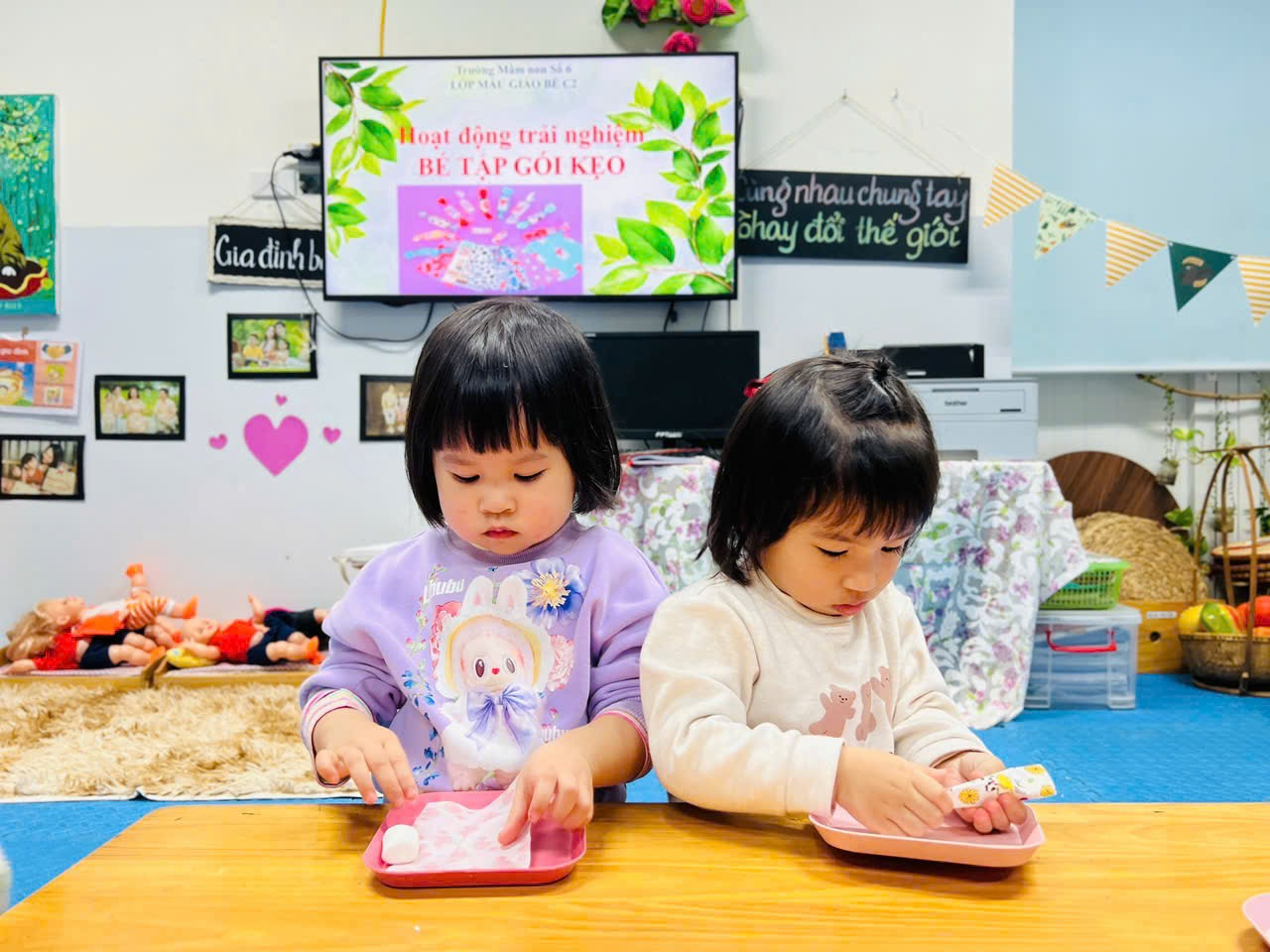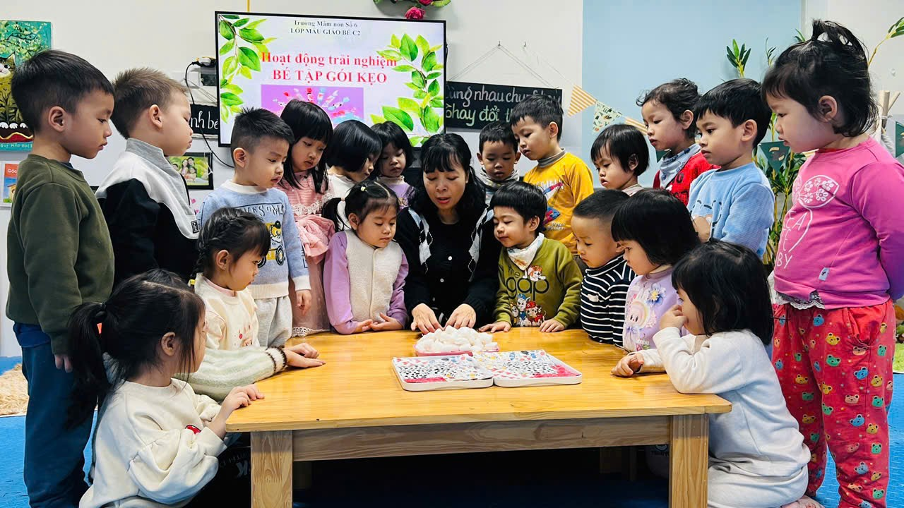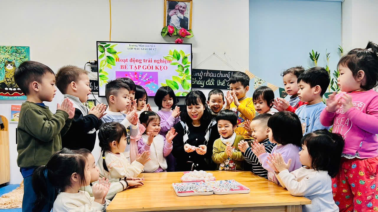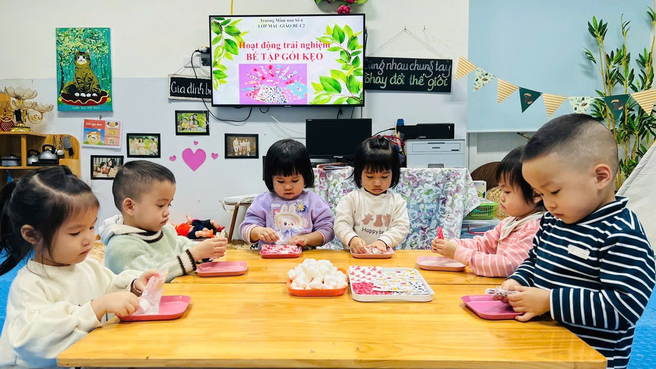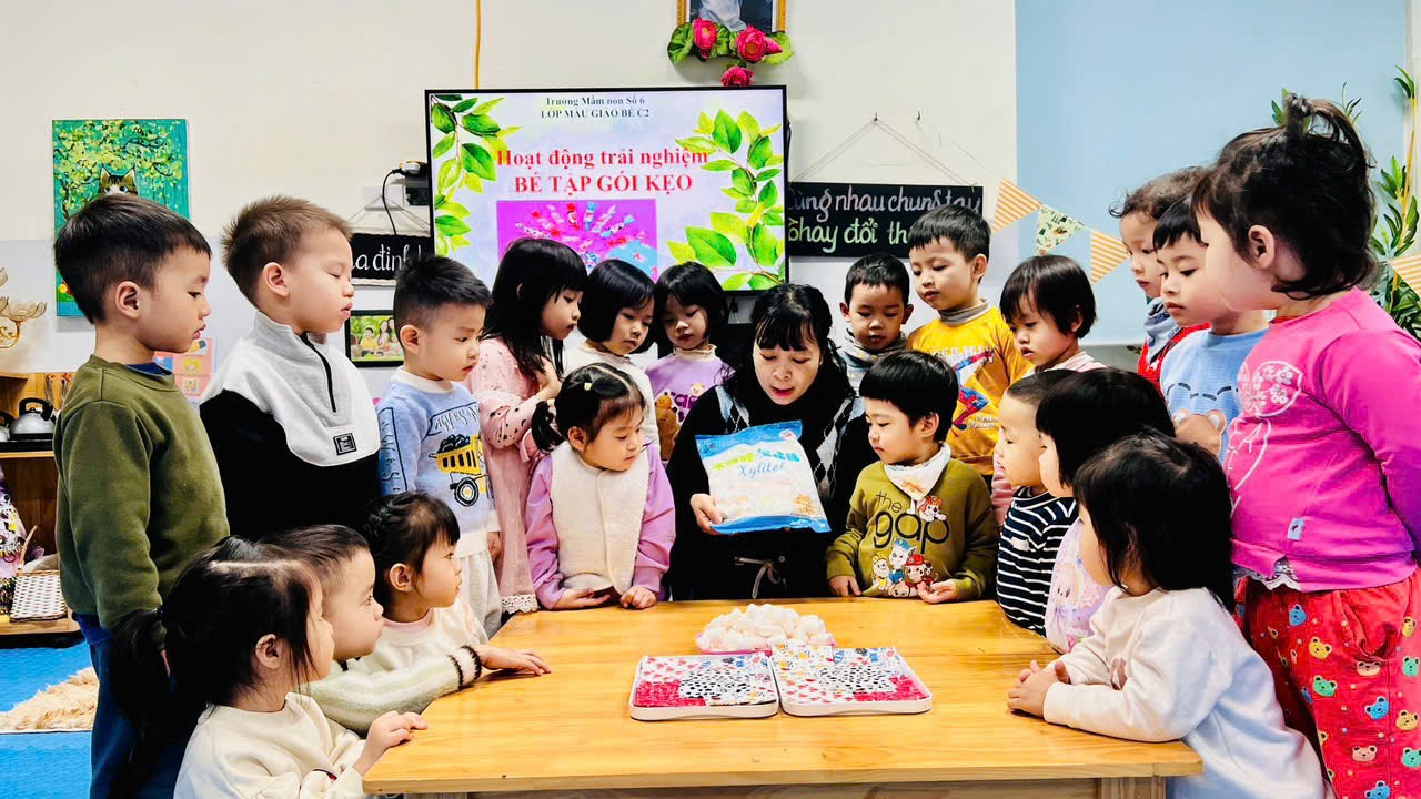 Hoạt động trải nghiệm ‘‘Bé tập gói kẹo’’ của các bạn nhỏ lớp C2 được cô giáo hướng dẫn gói kẹo rất vui bố mẹ ạ!