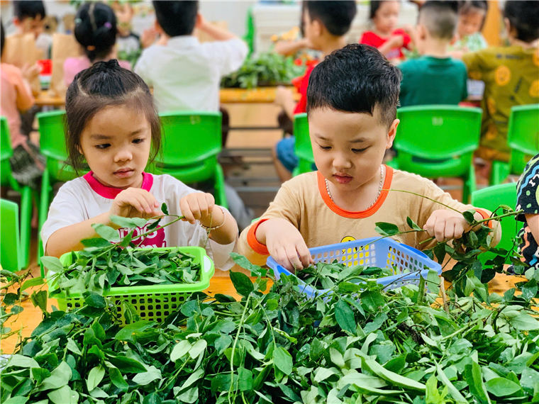 Các con hào hứng và thích thú cùng nhau tuốt rau ngót
