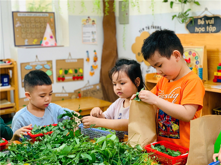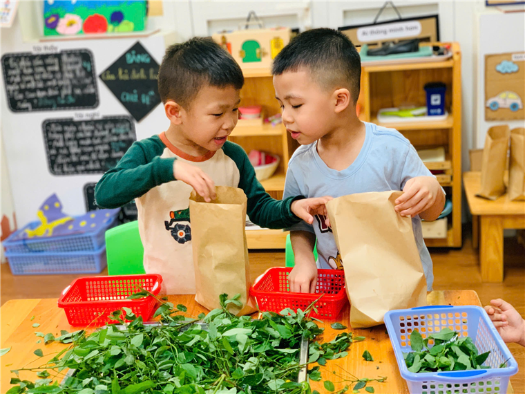 Các con cho rau mình đã tuốt vào túi giấy để bảo quản