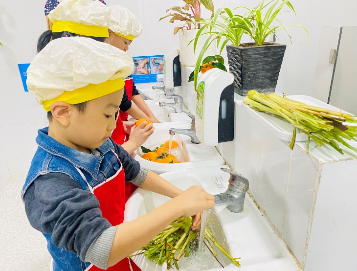 Các bạn nhỏ đang sơ chế nguyên vật liệu