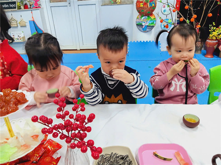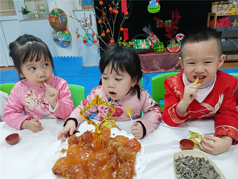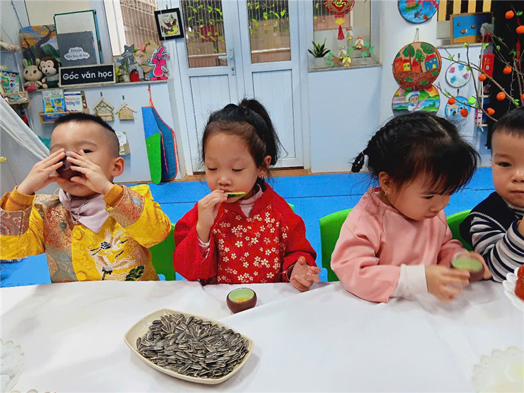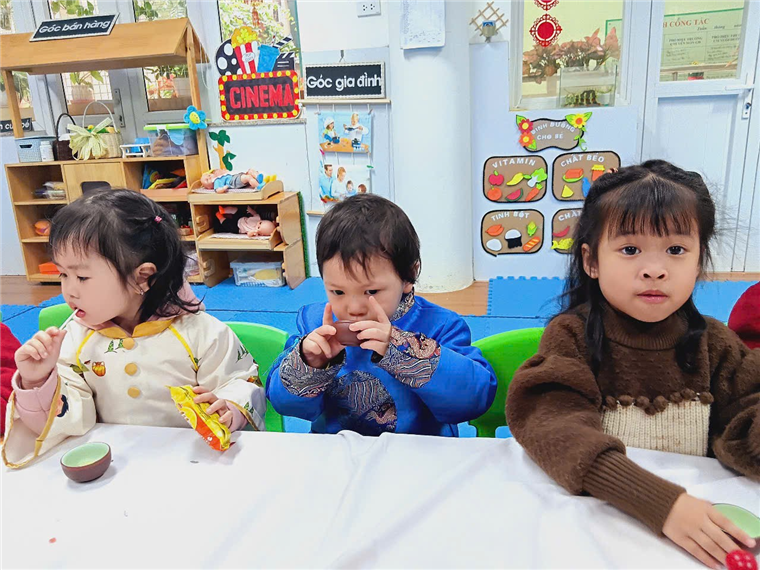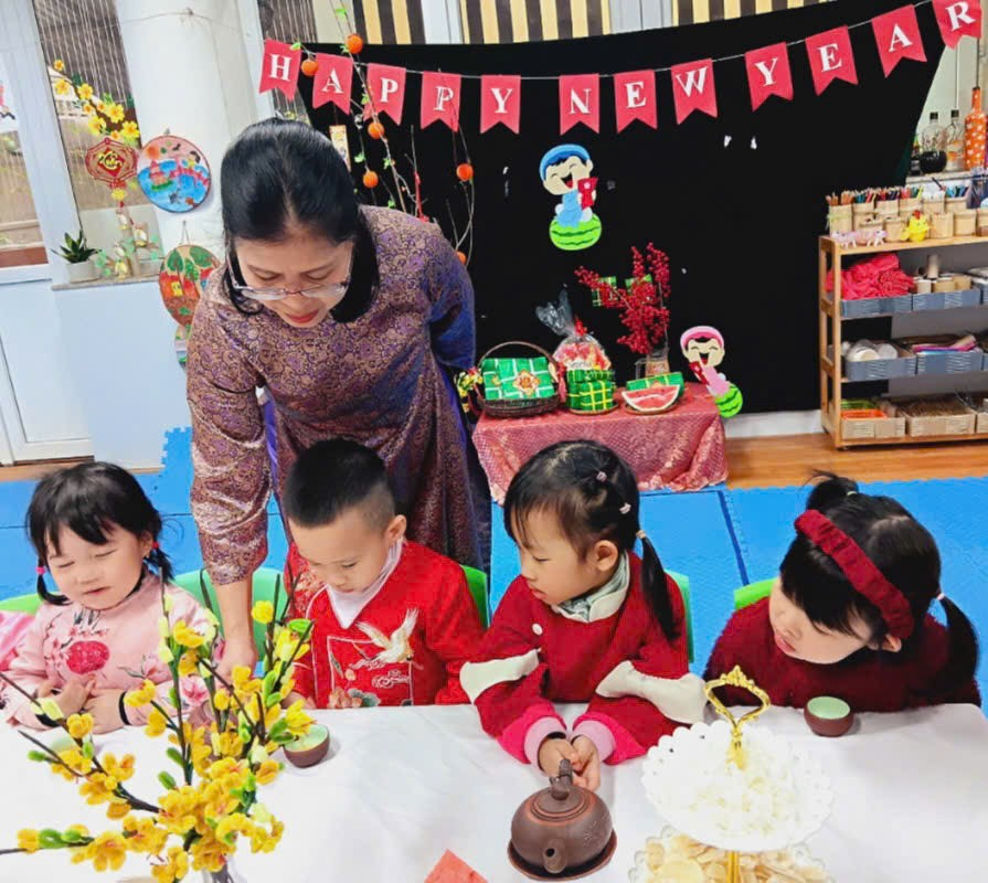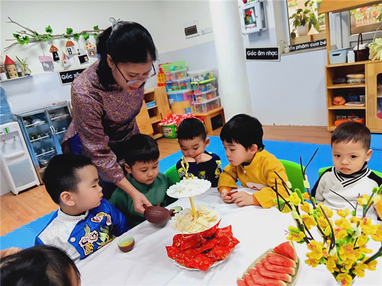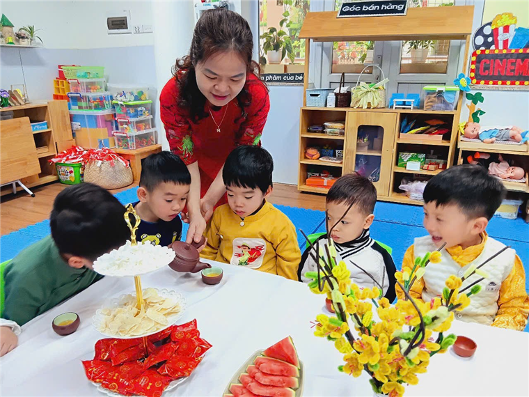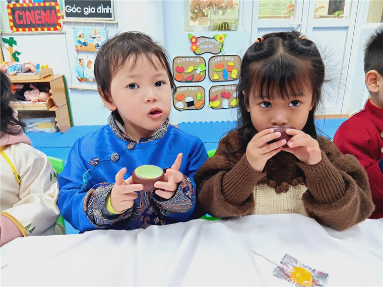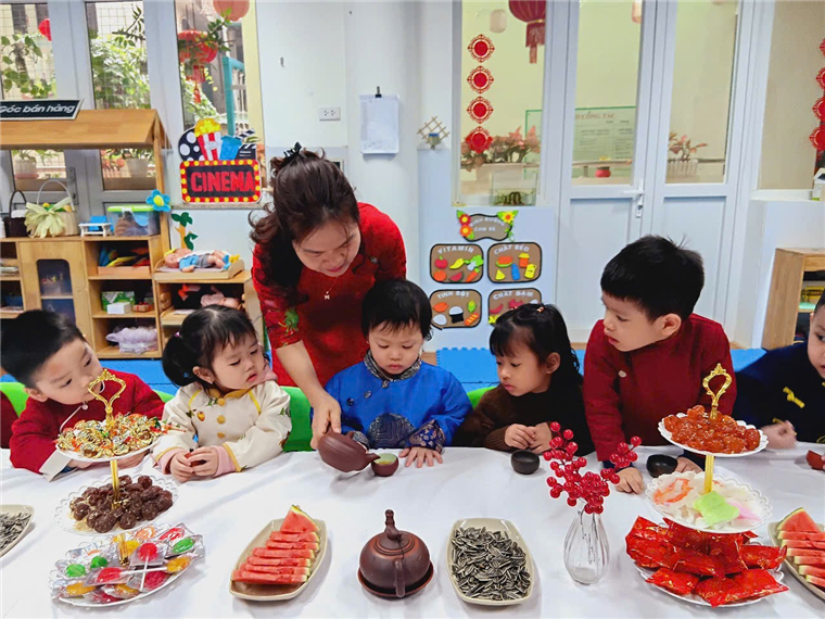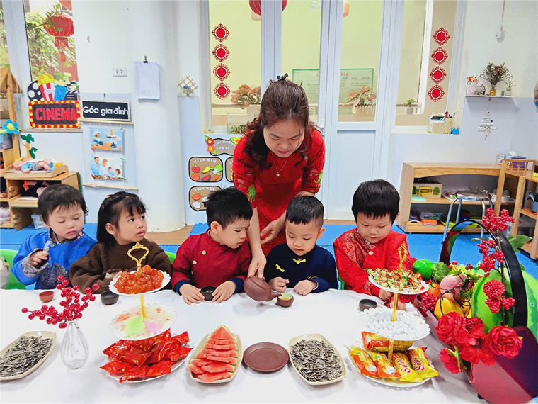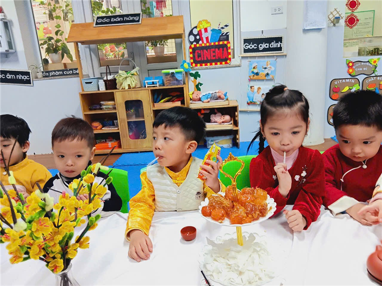 Với bàn tiệc được trang trí nhẹ nhàng, đầy sắc xuân, các bạn nhỏ đã cùng nhau thưởng thức những tách trà thơm, bánh mứt truyền thống và chia sẻ những lời chúc tốt đẹp đầu năm. Hoạt động không chỉ giúp các con cảm nhận sự ấm áp của mùa xuân mà còn giáo dục về giá trị của sự đoàn kết, yêu thương và văn hóa giao tiếp trong ngày Tết.