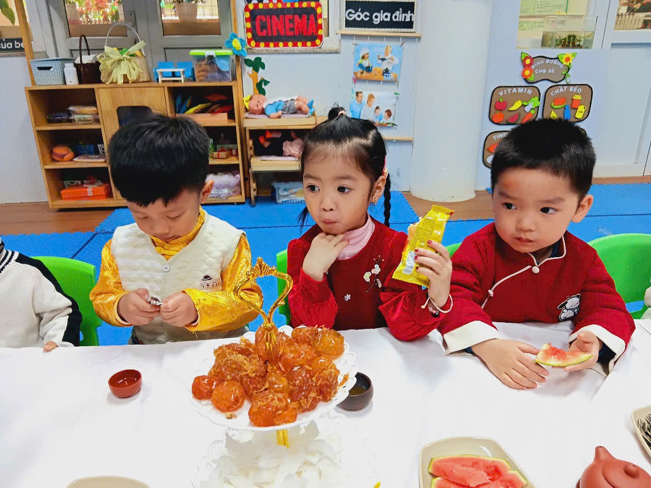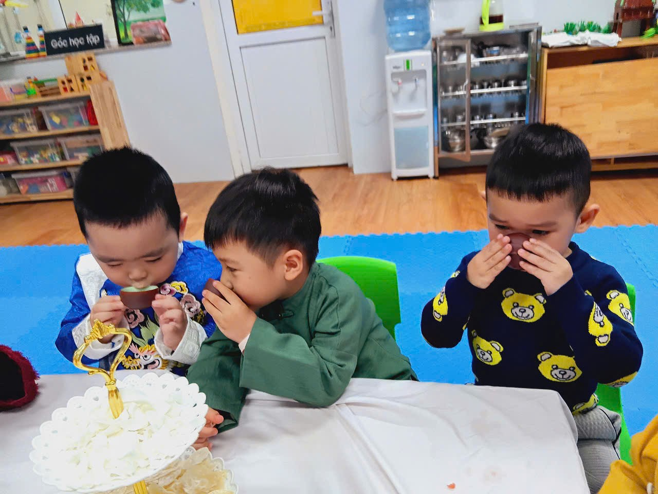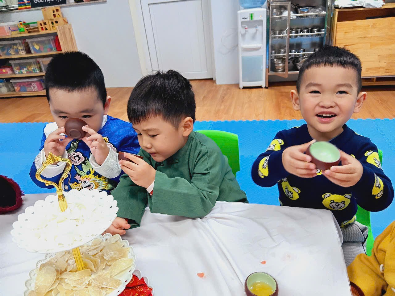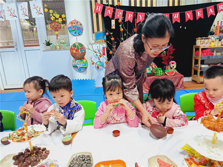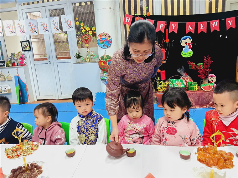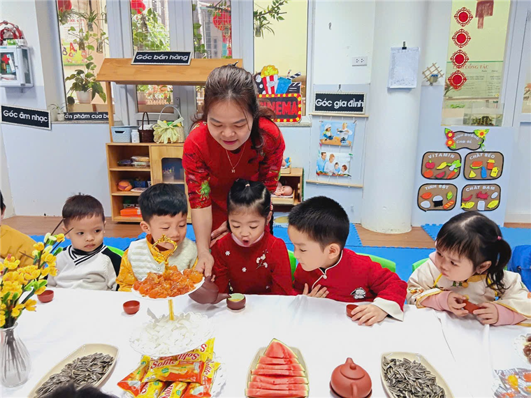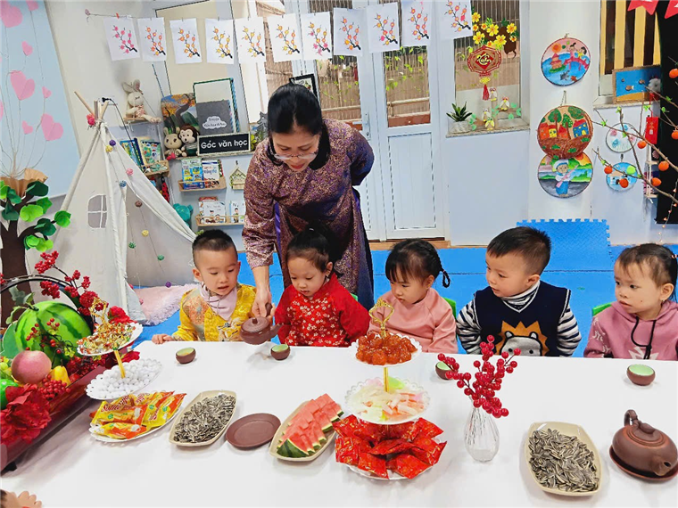 Với bàn tiệc được trang trí nhẹ nhàng, đầy sắc xuân, các bạn nhỏ đã cùng nhau thưởng thức những tách trà thơm, bánh mứt truyền thống và chia sẻ những lời chúc tốt đẹp đầu năm. Hoạt động không chỉ giúp các con cảm nhận sự ấm áp của mùa xuân mà còn giáo dục về giá trị của sự đoàn kết, yêu thương và văn hóa giao tiếp trong ngày Tết.