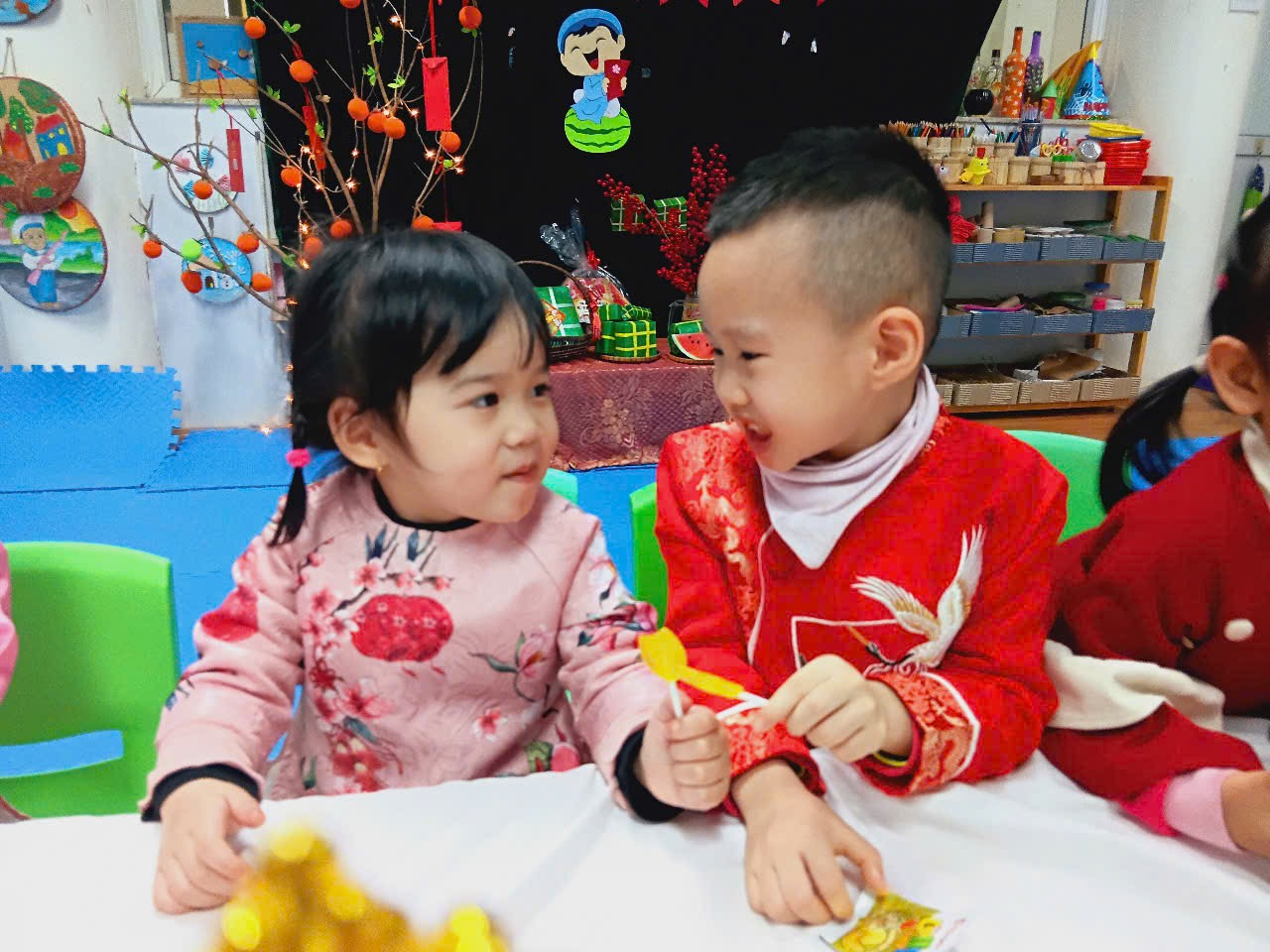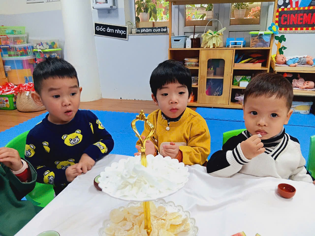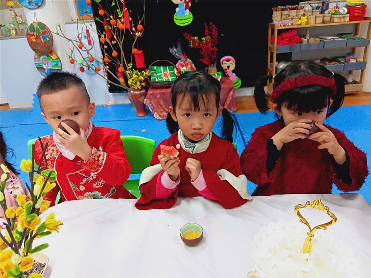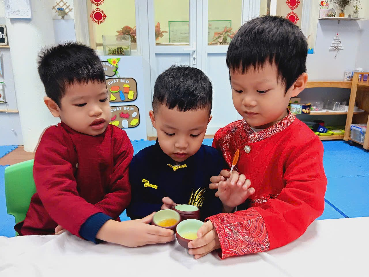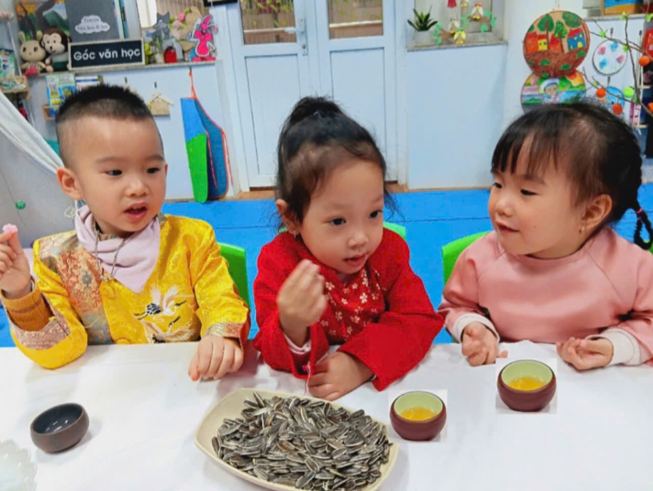 Với bàn tiệc được trang trí nhẹ nhàng, đầy sắc xuân, các bạn nhỏ đã cùng nhau thưởng thức những tách trà thơm, bánh mứt truyền thống và chia sẻ những lời chúc tốt đẹp đầu năm. Hoạt động không chỉ giúp các con cảm nhận sự ấm áp của mùa xuân mà còn giáo dục về giá trị của sự đoàn kết, yêu thương và văn hóa giao tiếp trong ngày Tết.