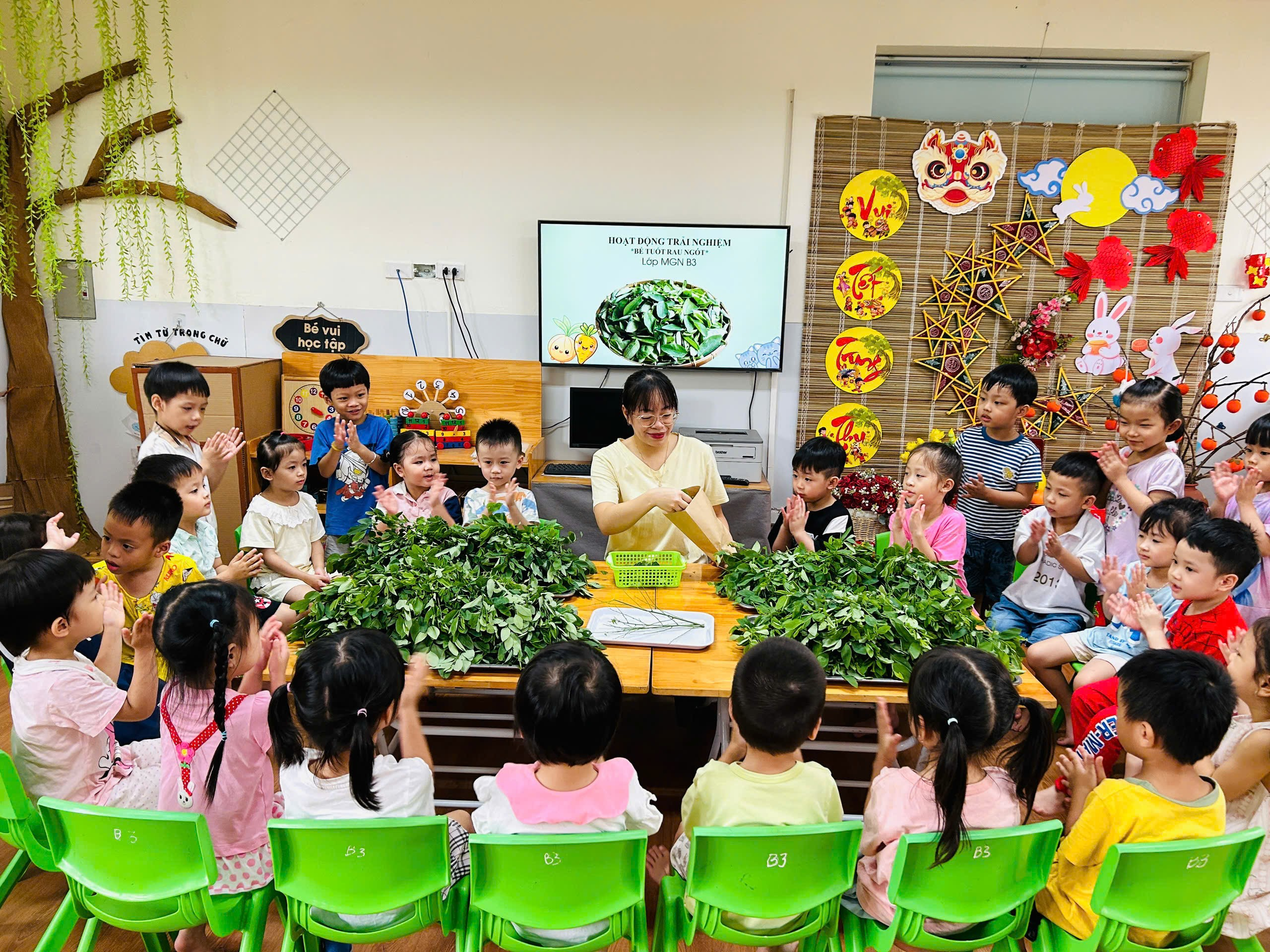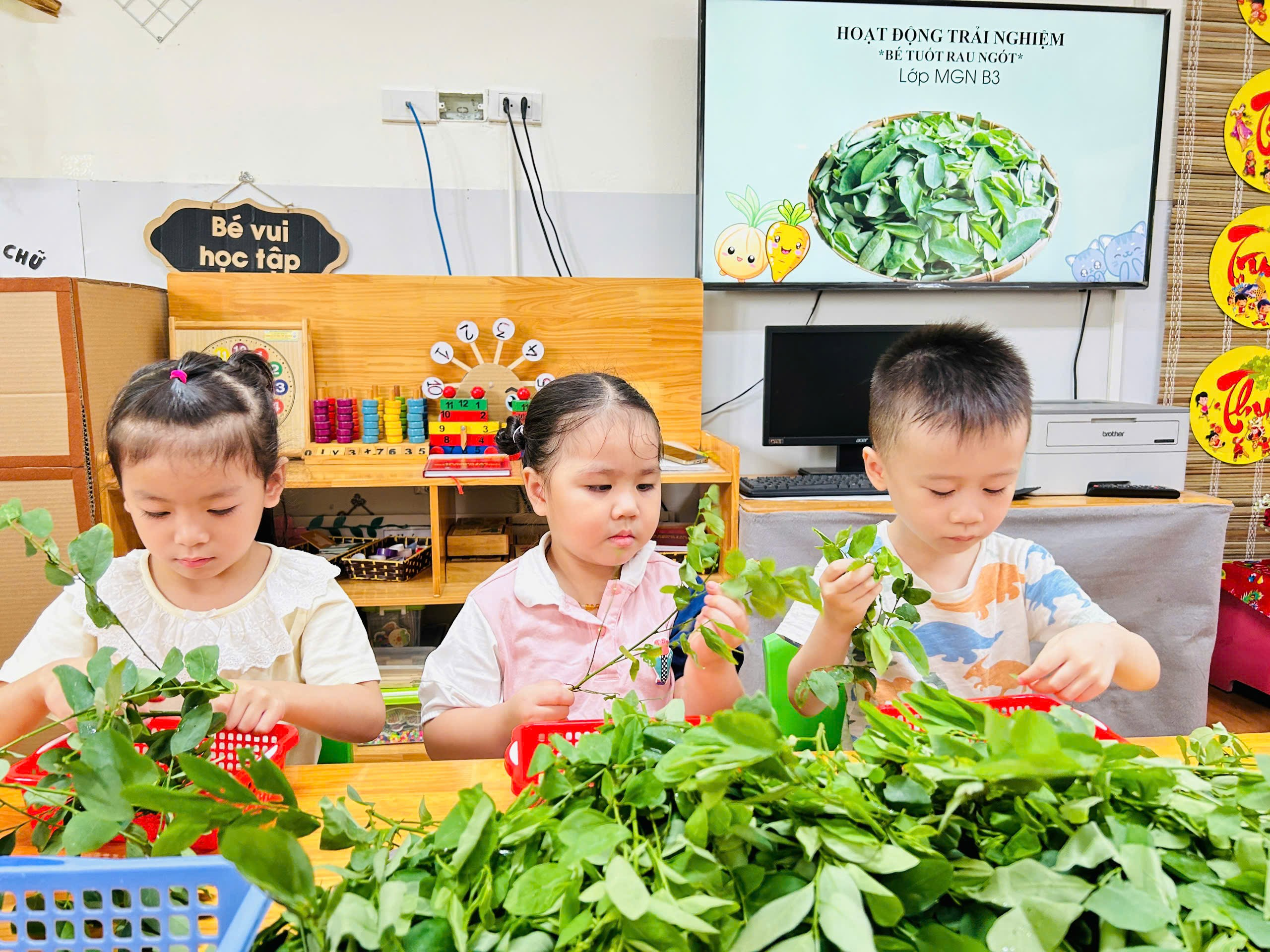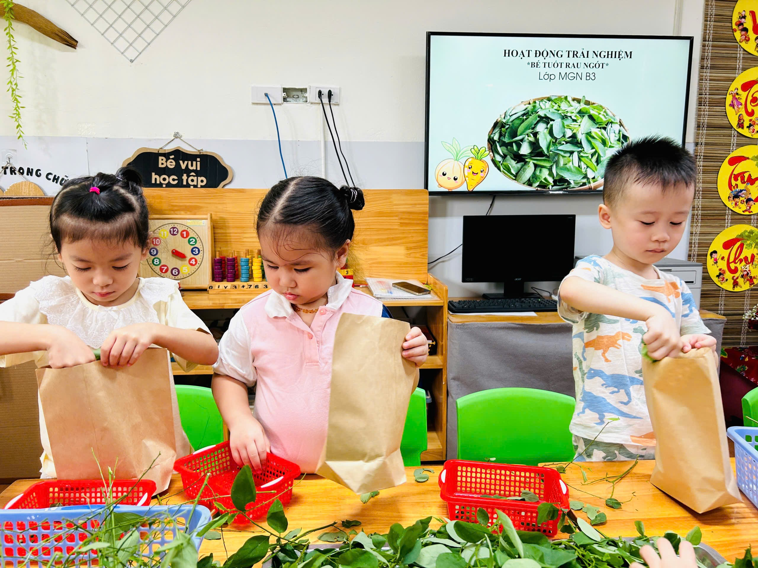 Dưới đây là một số hình ảnh của các bạn nhỏ lớp B3 với hoạt động trải nghiệm “Bé tuốt rau ngót”: