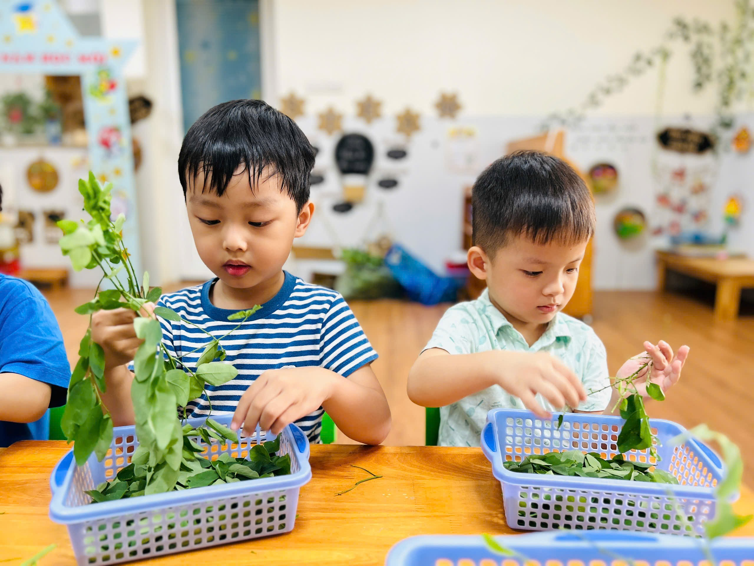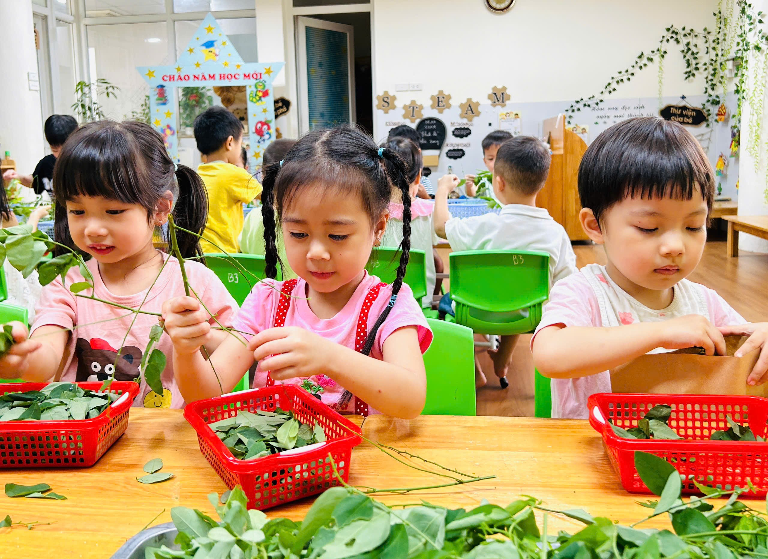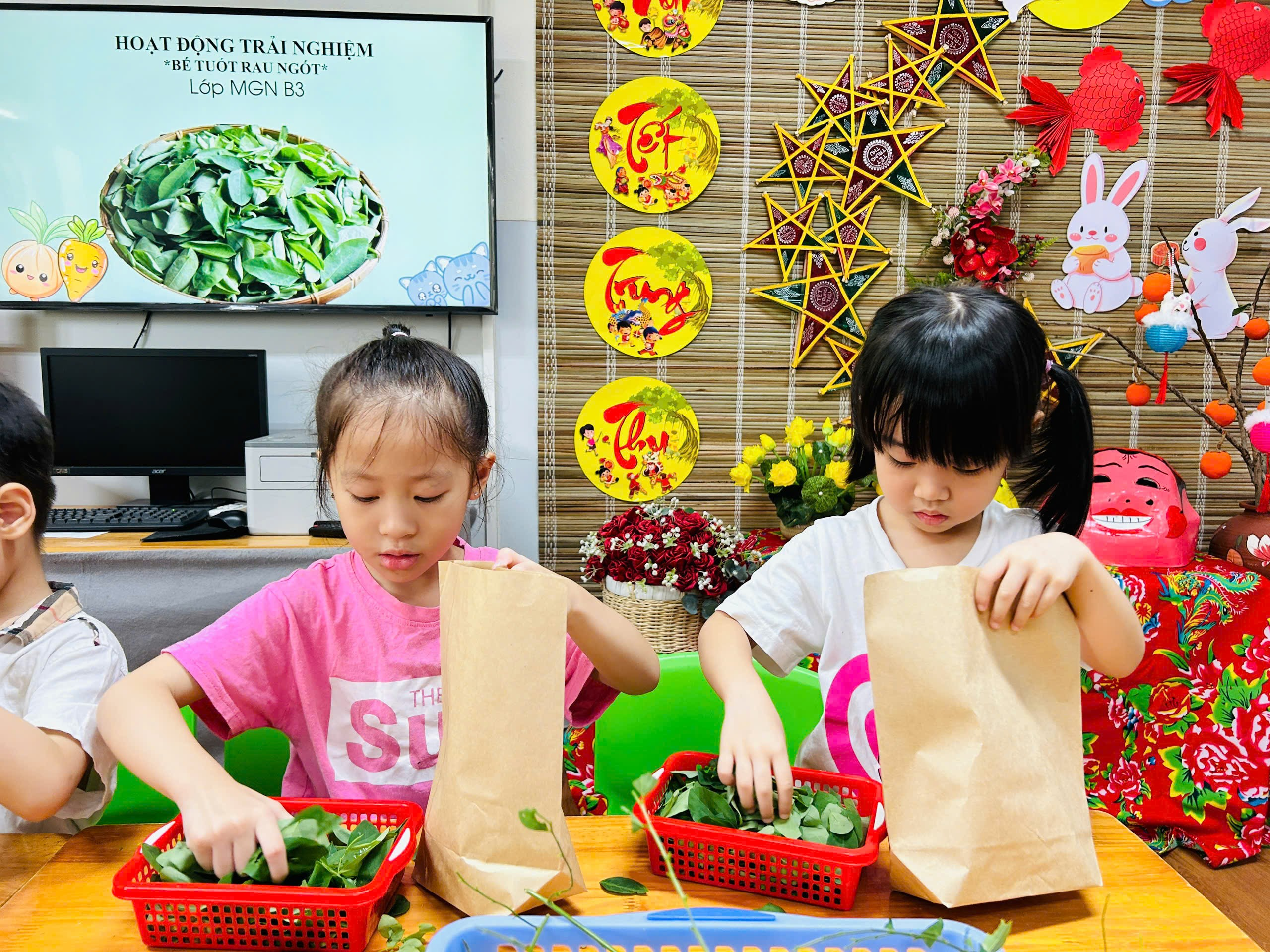 Dưới đây là một số hình ảnh của các bạn nhỏ lớp B3 với hoạt động trải nghiệm “Bé tuốt rau ngót”: