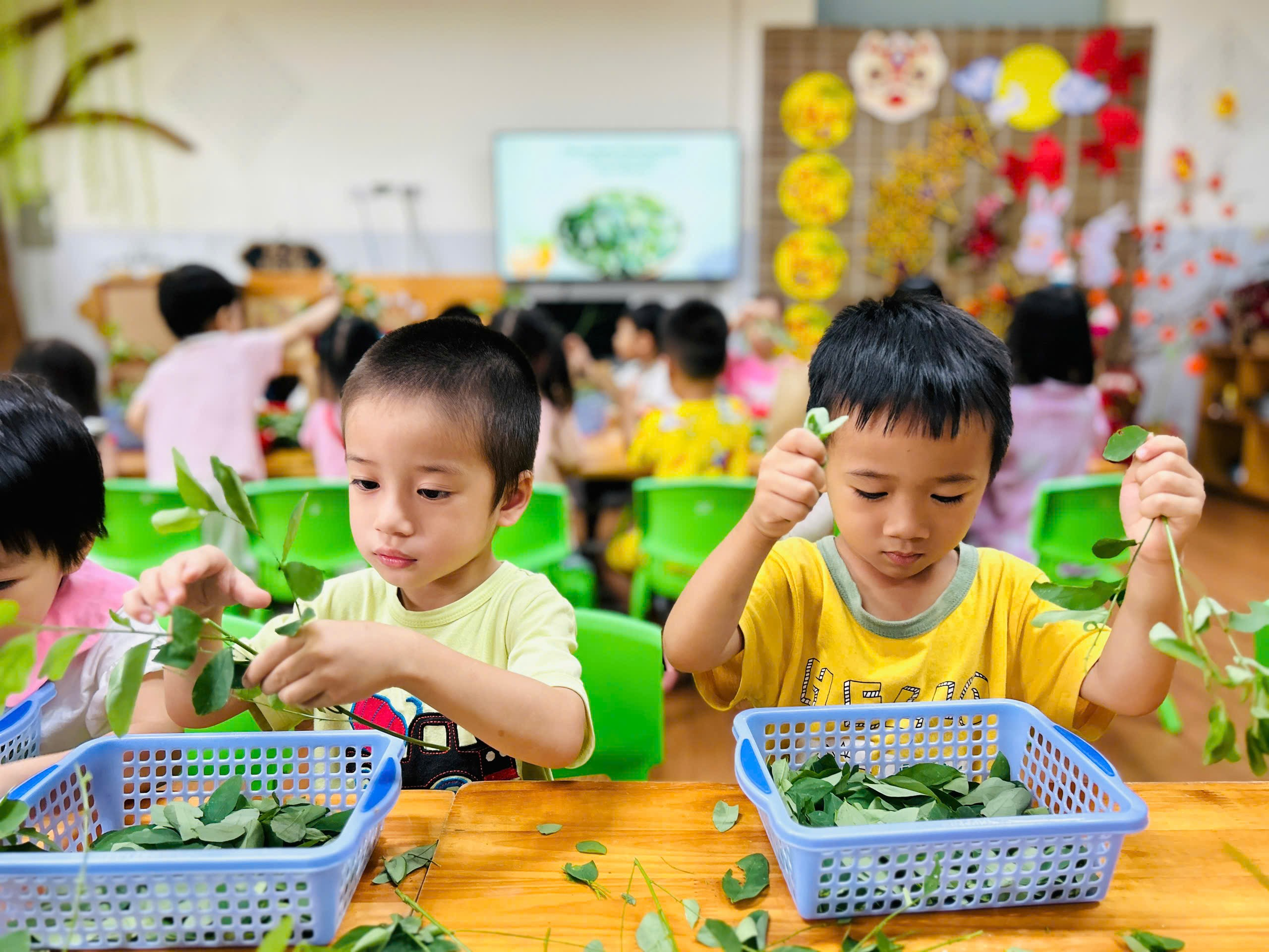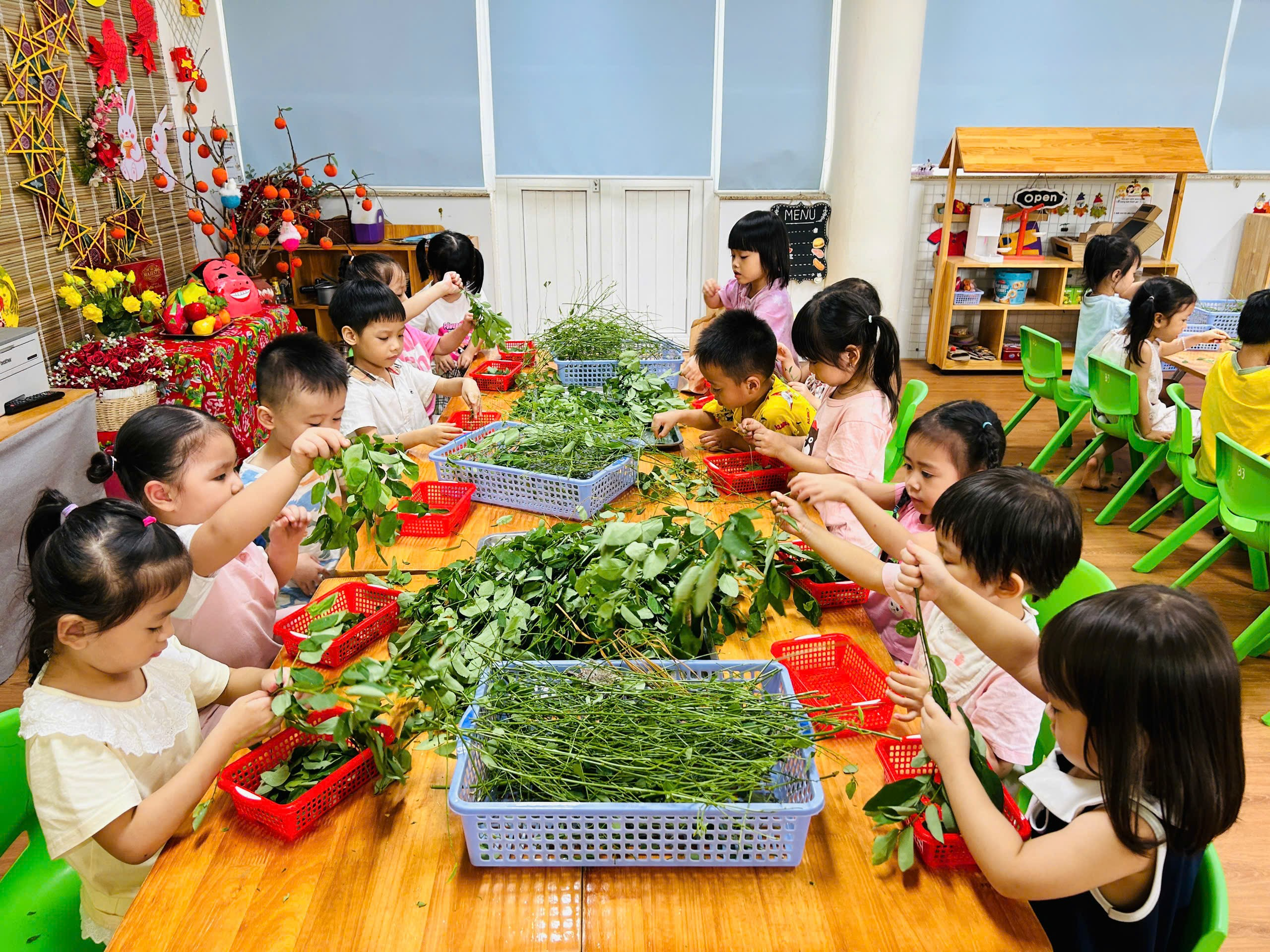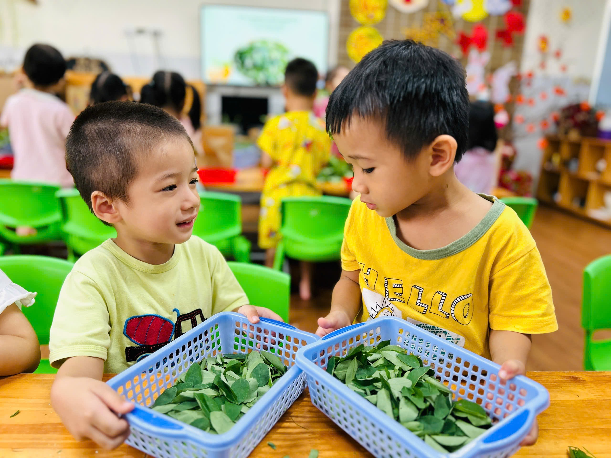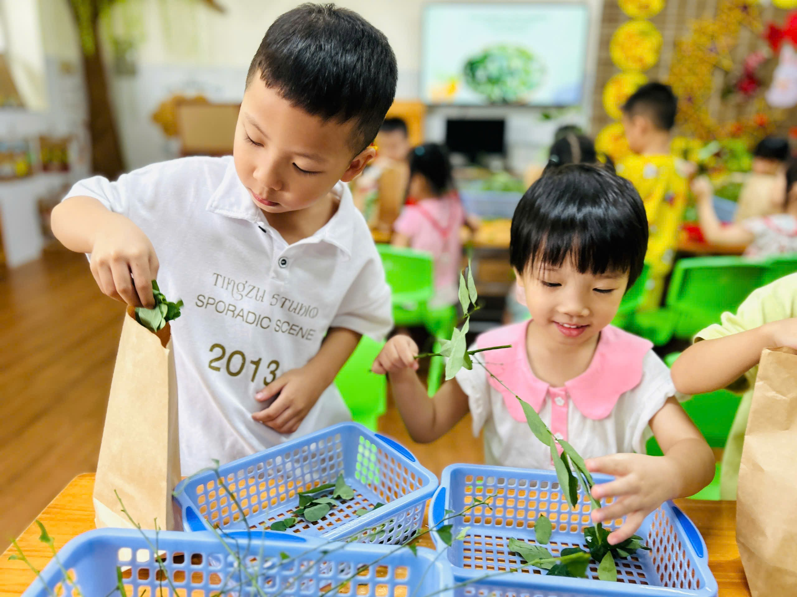 Các con hào hứng và thích thú cùng nhau tuốt rau ngót