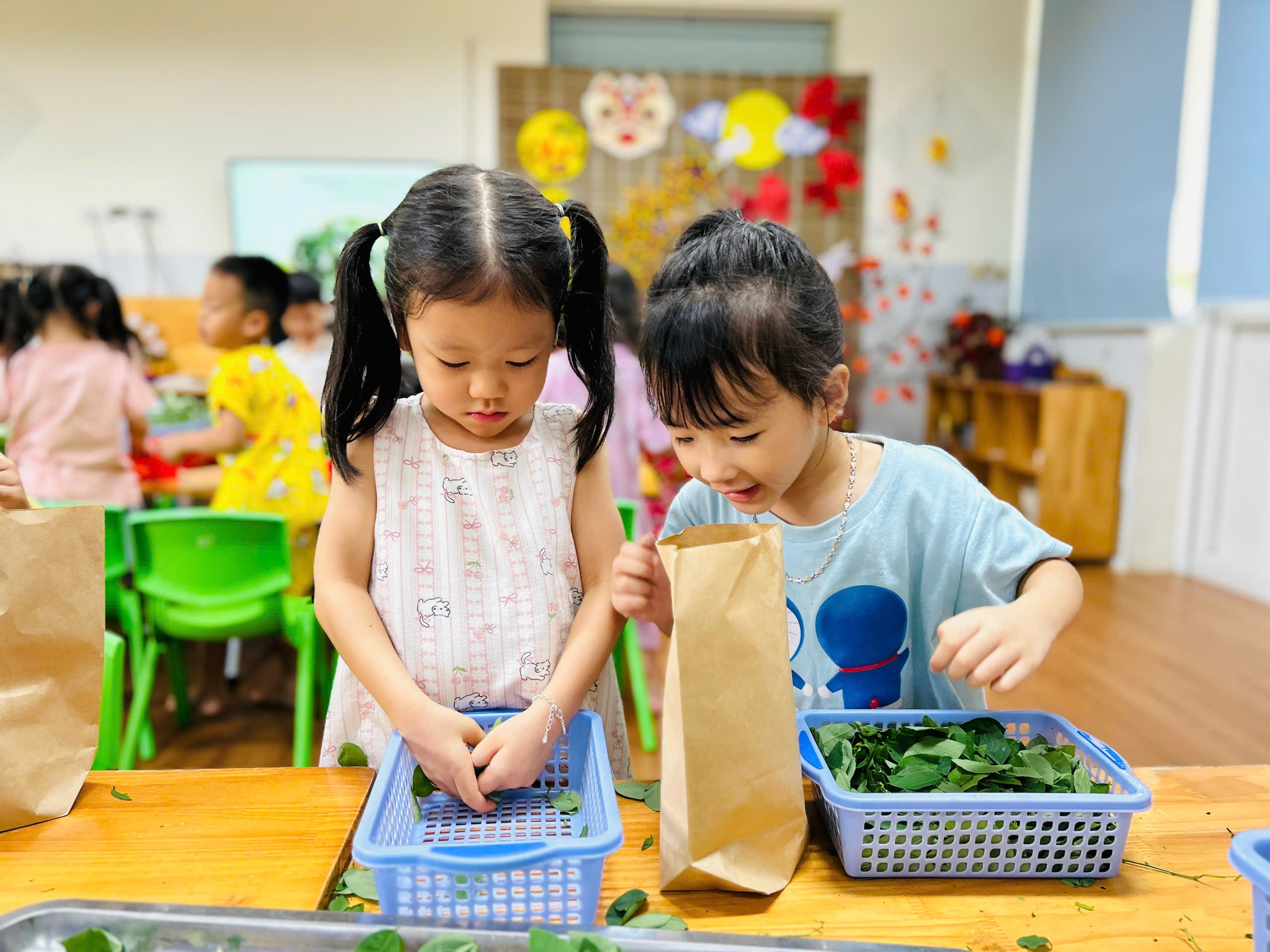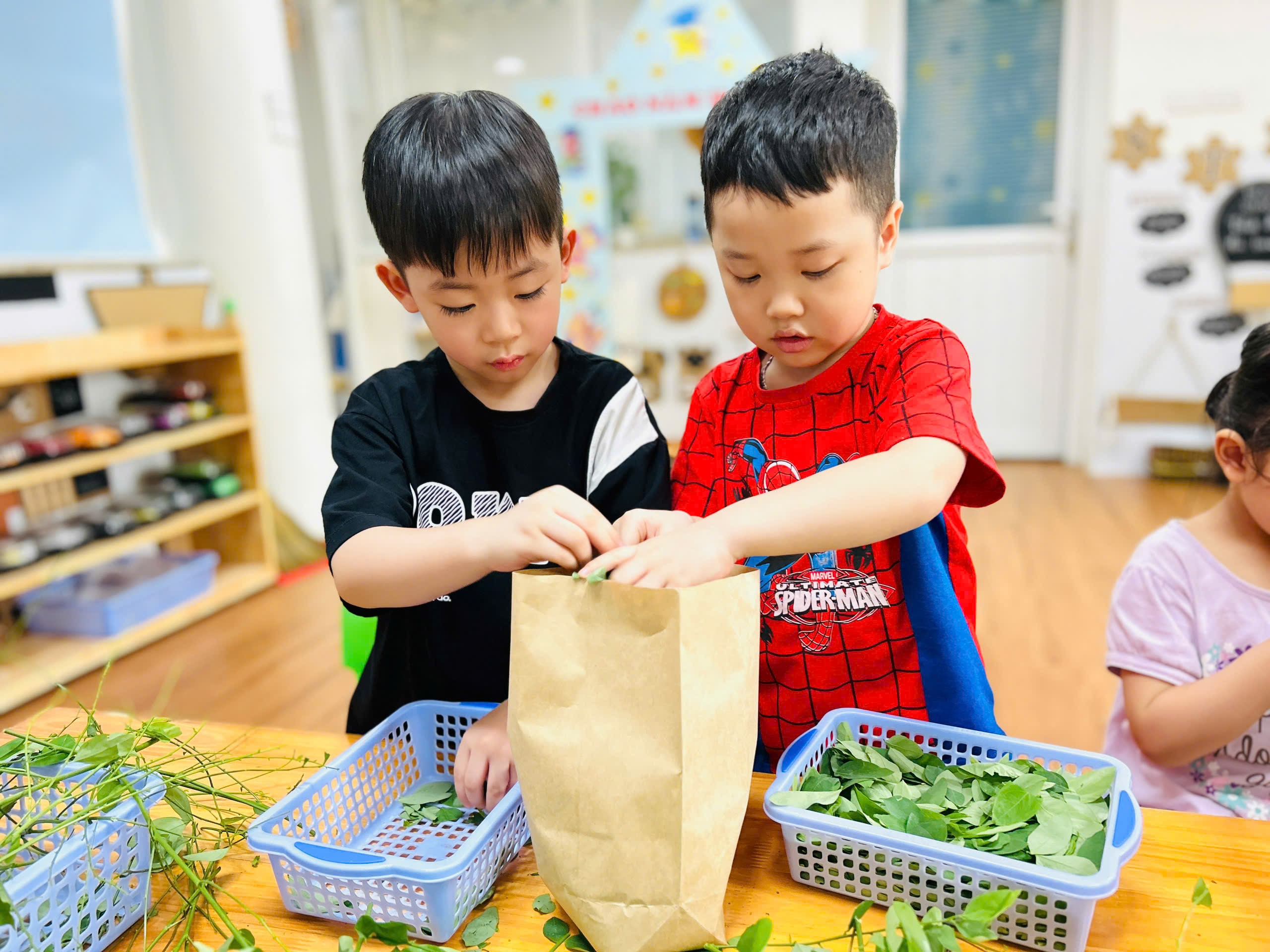 Các con cho rau mình đã tuốt vào túi giấy để bảo quản