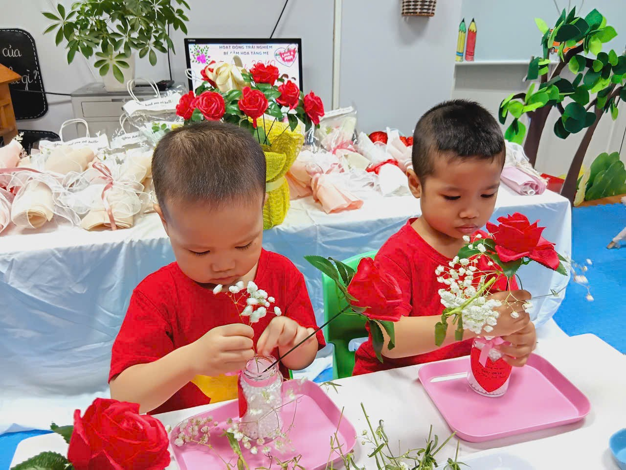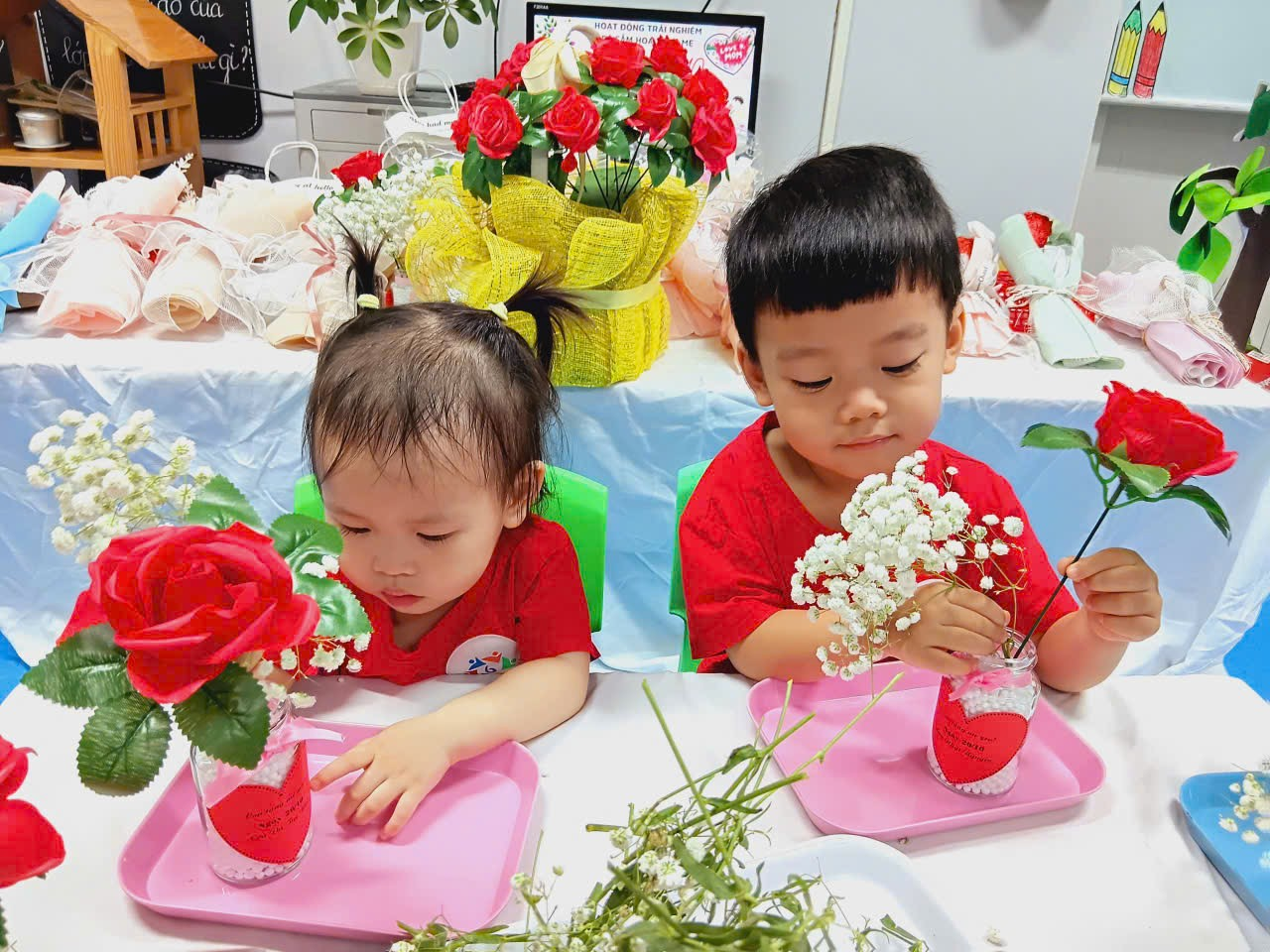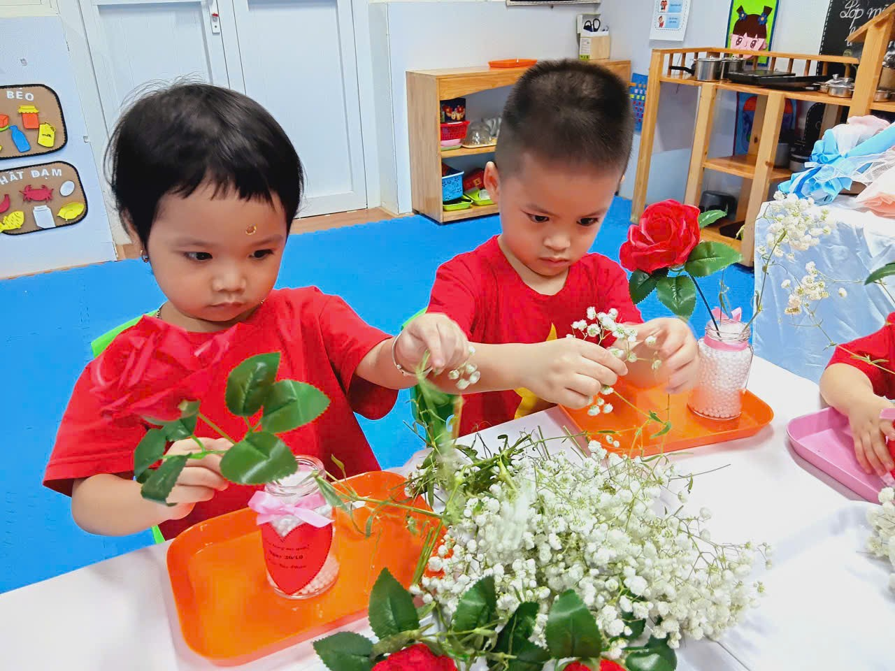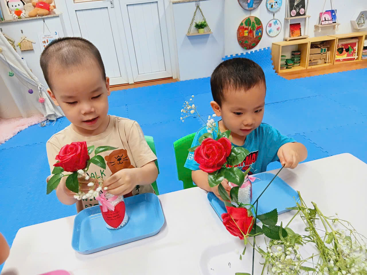 Các bé lớp C1 đã tự tay cắm những lọ hoa tươi thắm, gửi gắm trong đó biết bao tình yêu và lời chúc ngọt ngào dành tặng bà, tặng mẹ.