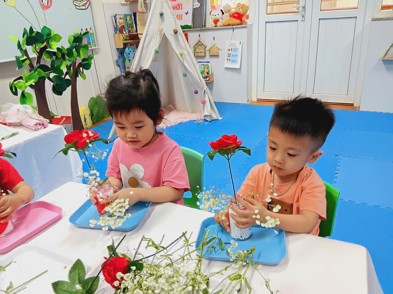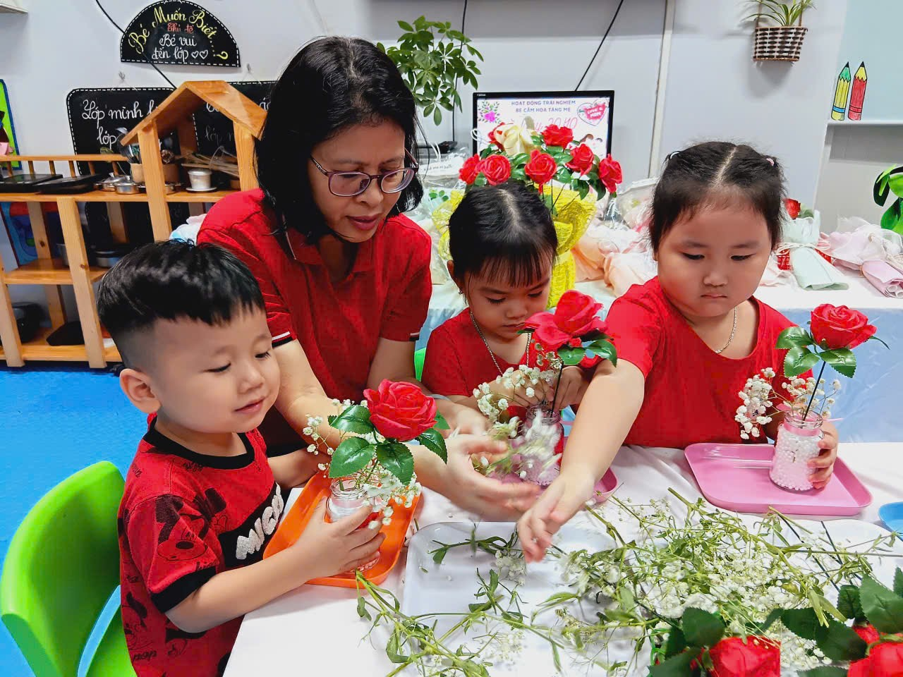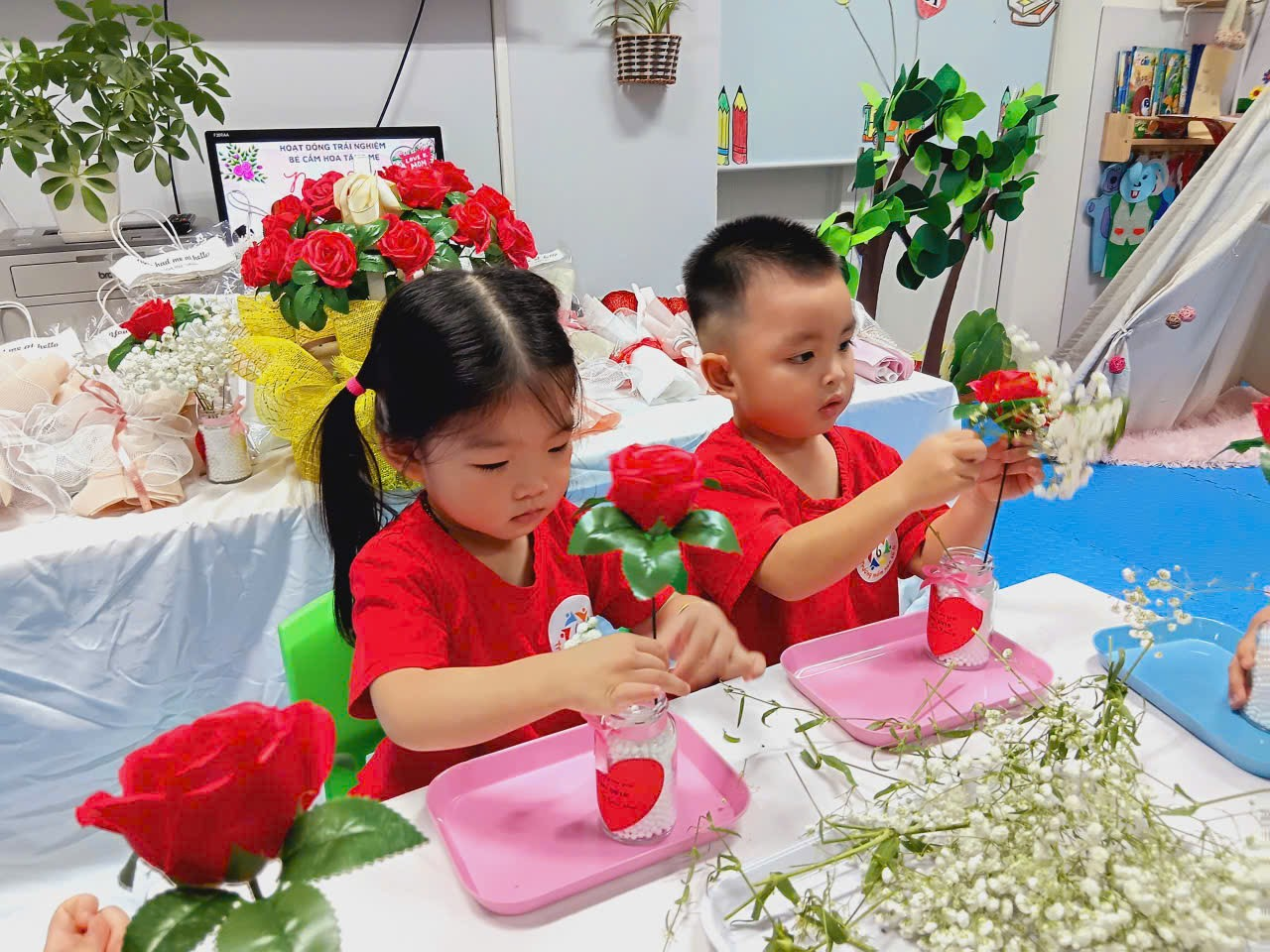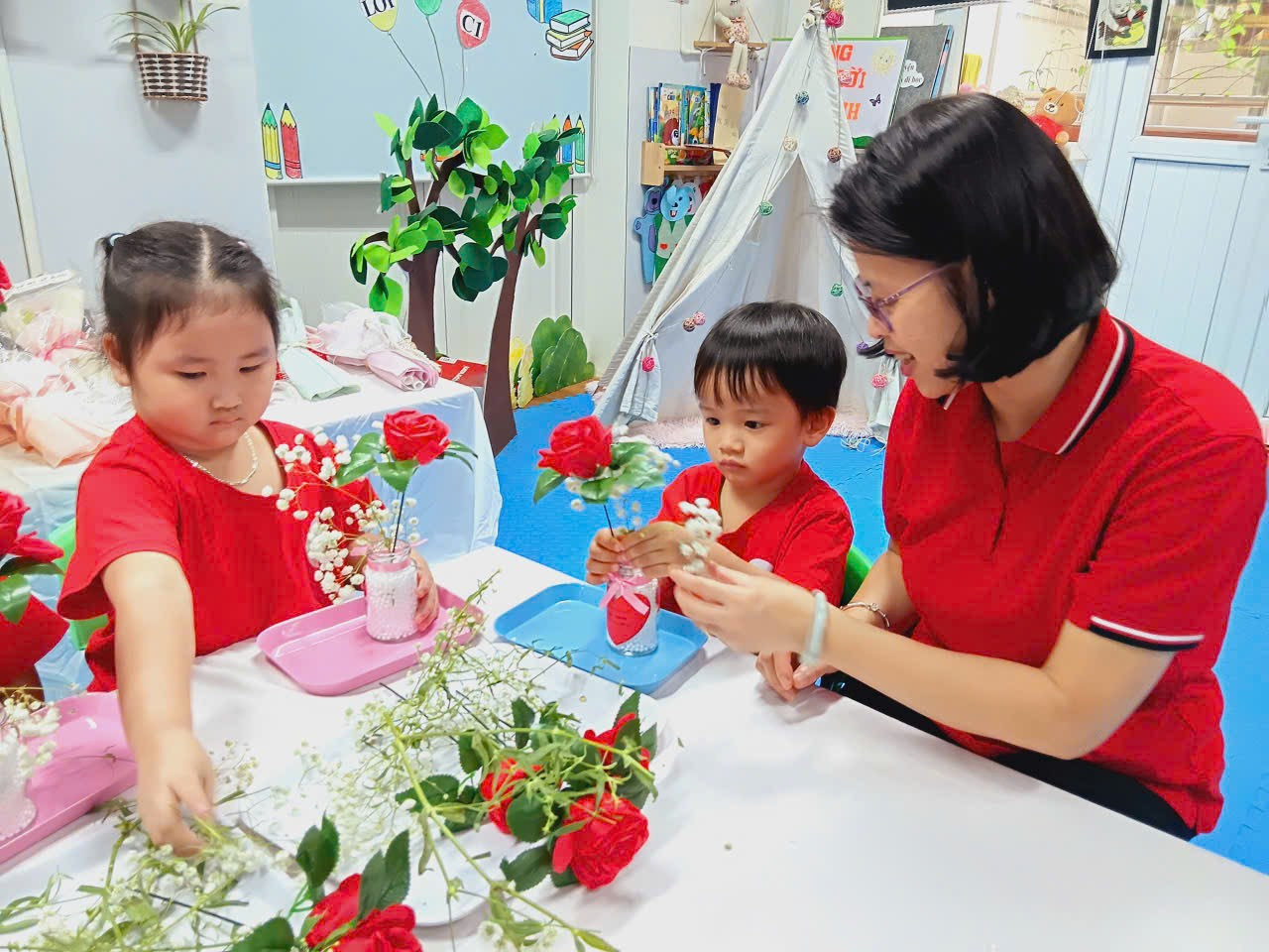 Các bé lớp C1 đã tự tay cắm những lọ hoa tươi thắm, gửi gắm trong đó biết bao tình yêu và lời chúc ngọt ngào dành tặng bà, tặng mẹ.