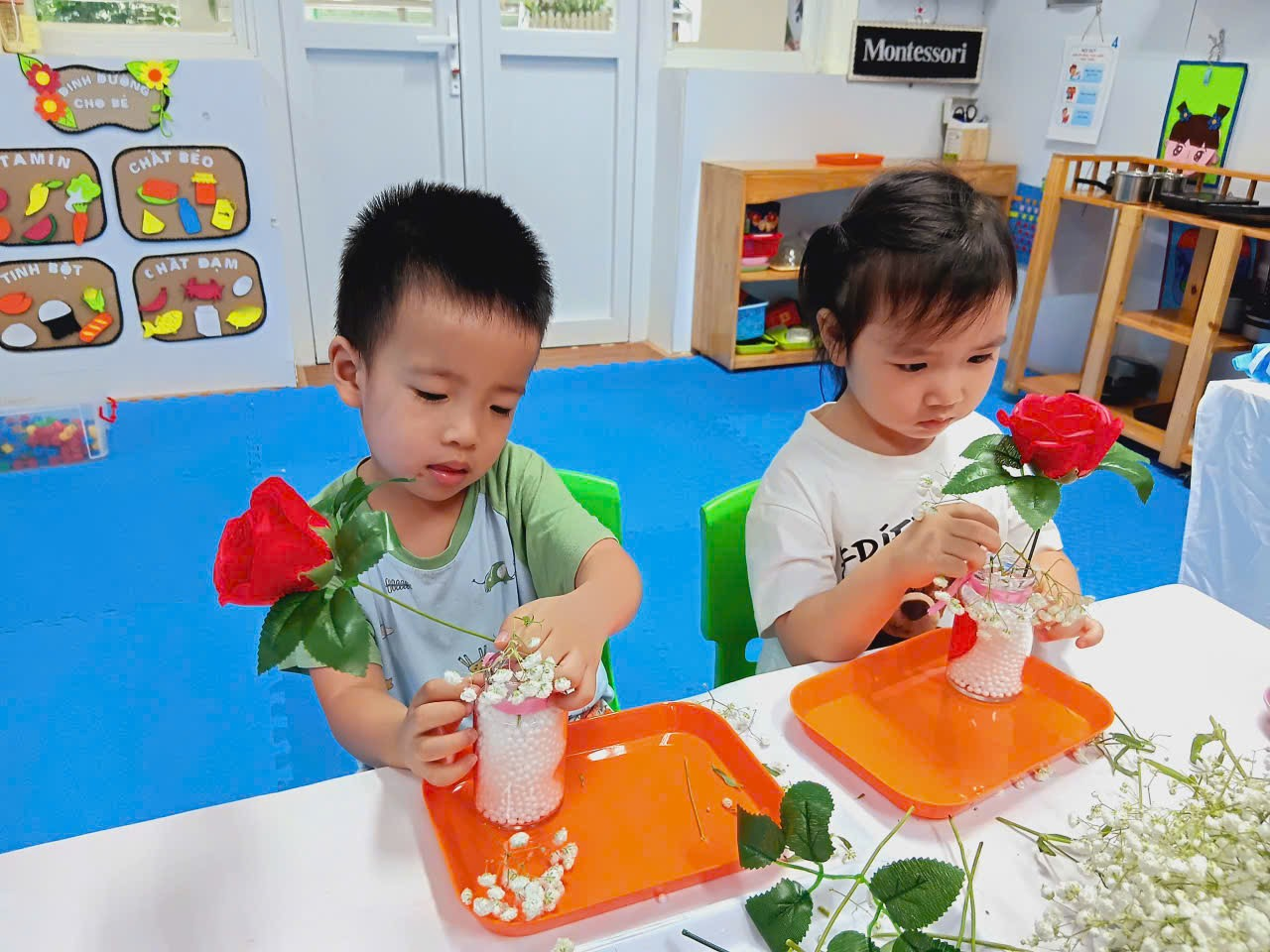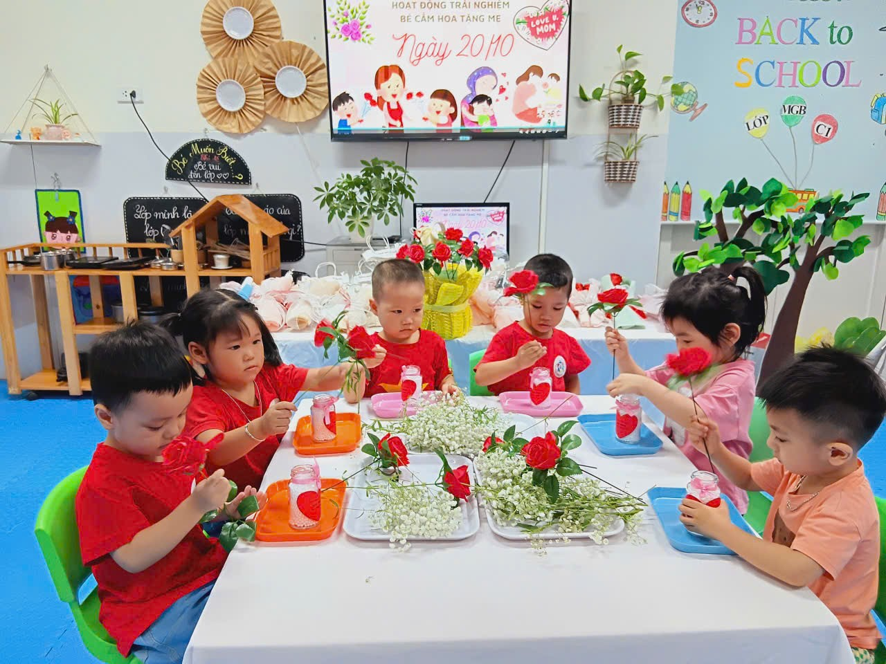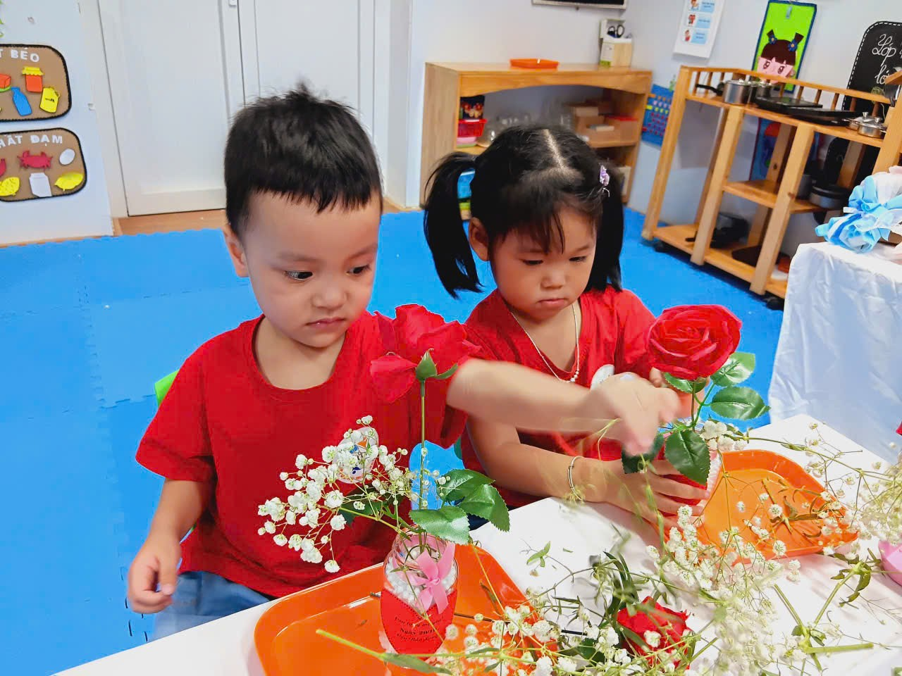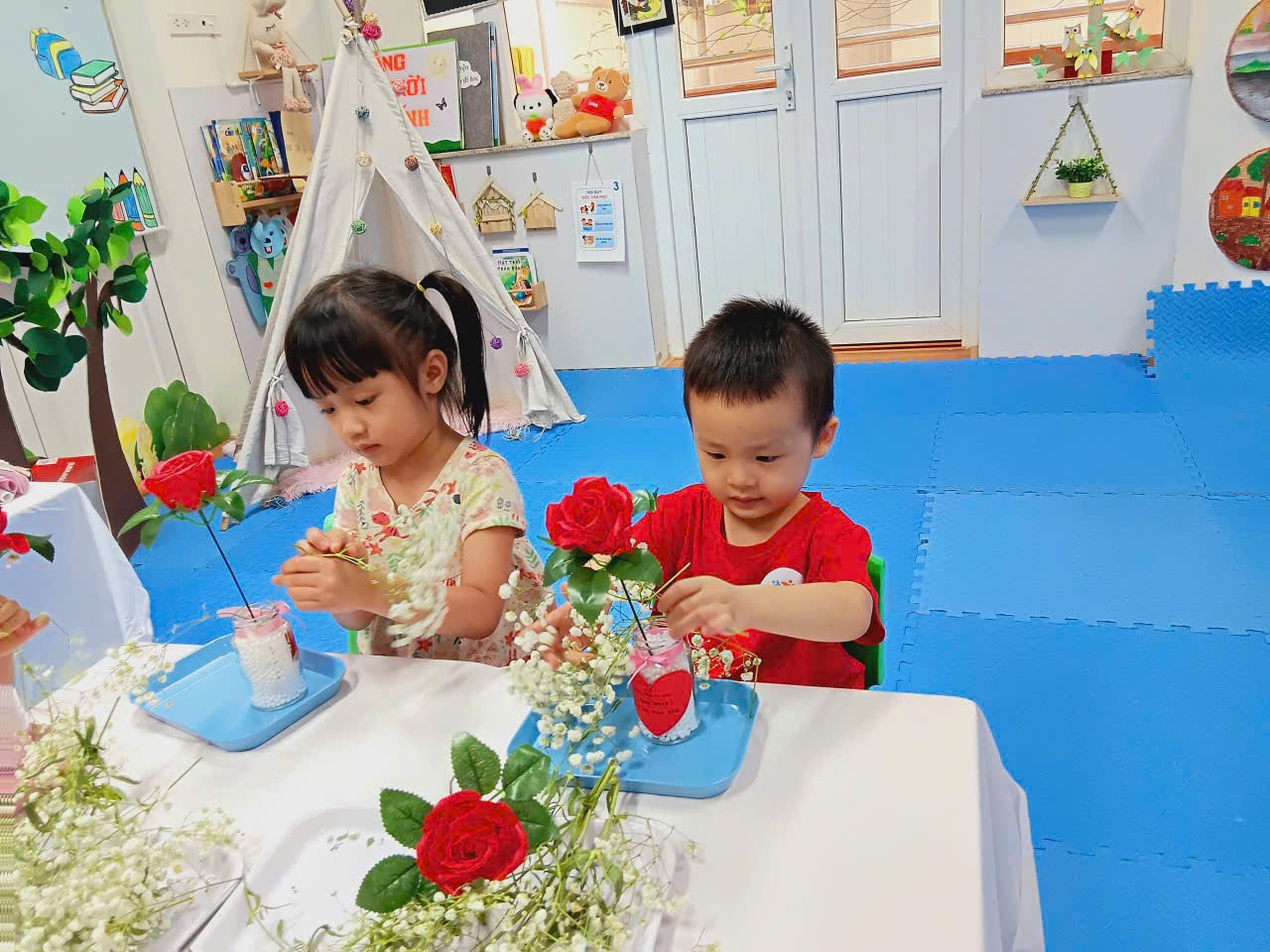 Các bé lớp C1 đã tự tay cắm những lọ hoa tươi thắm, gửi gắm trong đó biết bao tình yêu và lời chúc ngọt ngào dành tặng bà, tặng mẹ.