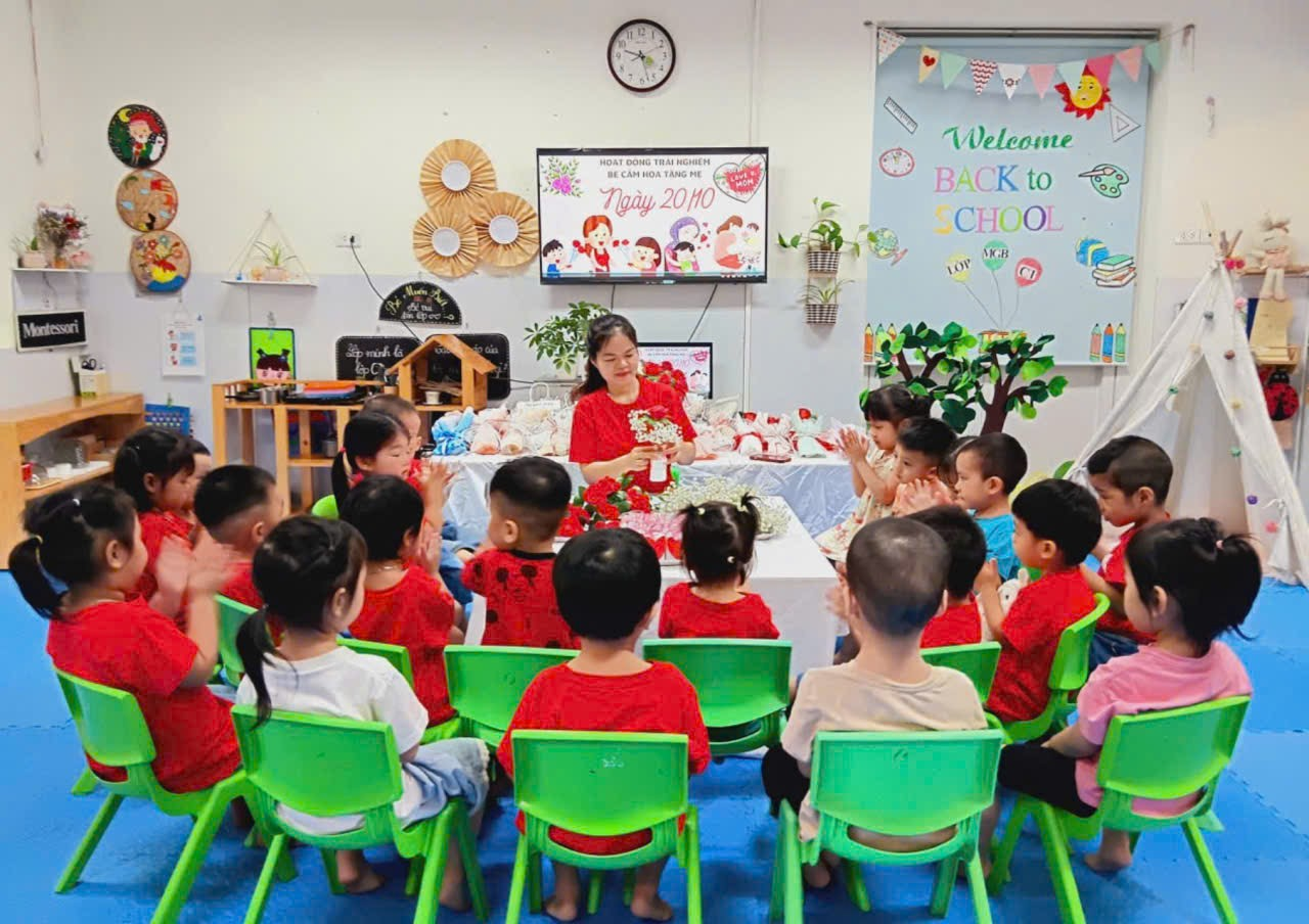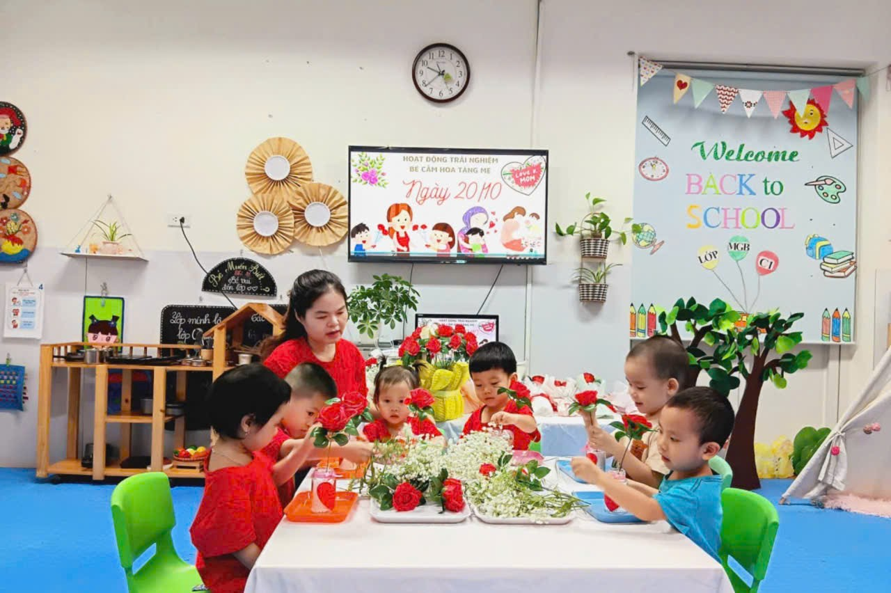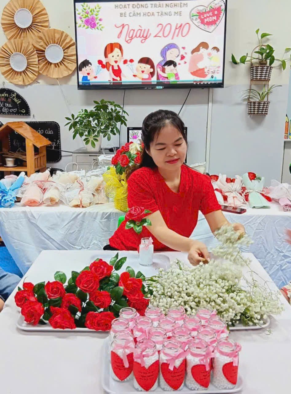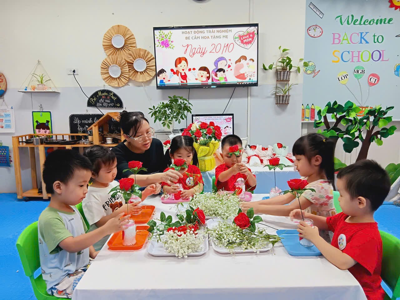 Các bé lớp C1 đã tự tay cắm những lọ hoa tươi thắm, gửi gắm trong đó biết bao tình yêu và lời chúc ngọt ngào dành tặng bà, tặng mẹ.